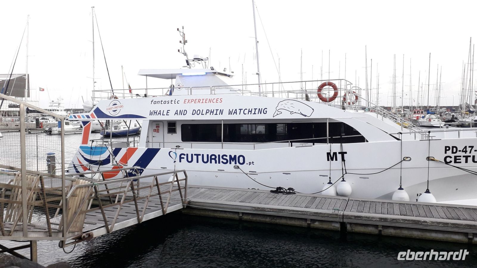 Manche von uns machen eine Walbeobachtungsfahrt mit einem Katamaran-Boot. Die Gelbschnabelsturmtaucher begleiten uns fast die ganze Zeit. Wir können uns heute glücklich schätzen, da wir die sehr seltenen Rundkopfdelfine bzw. Risso-Delfine zu Gesicht bekommen. Außerdem sehen wir die gewöhnlichen Delfine und manch einer meint, sogar einen Wal gesichtet zu haben.