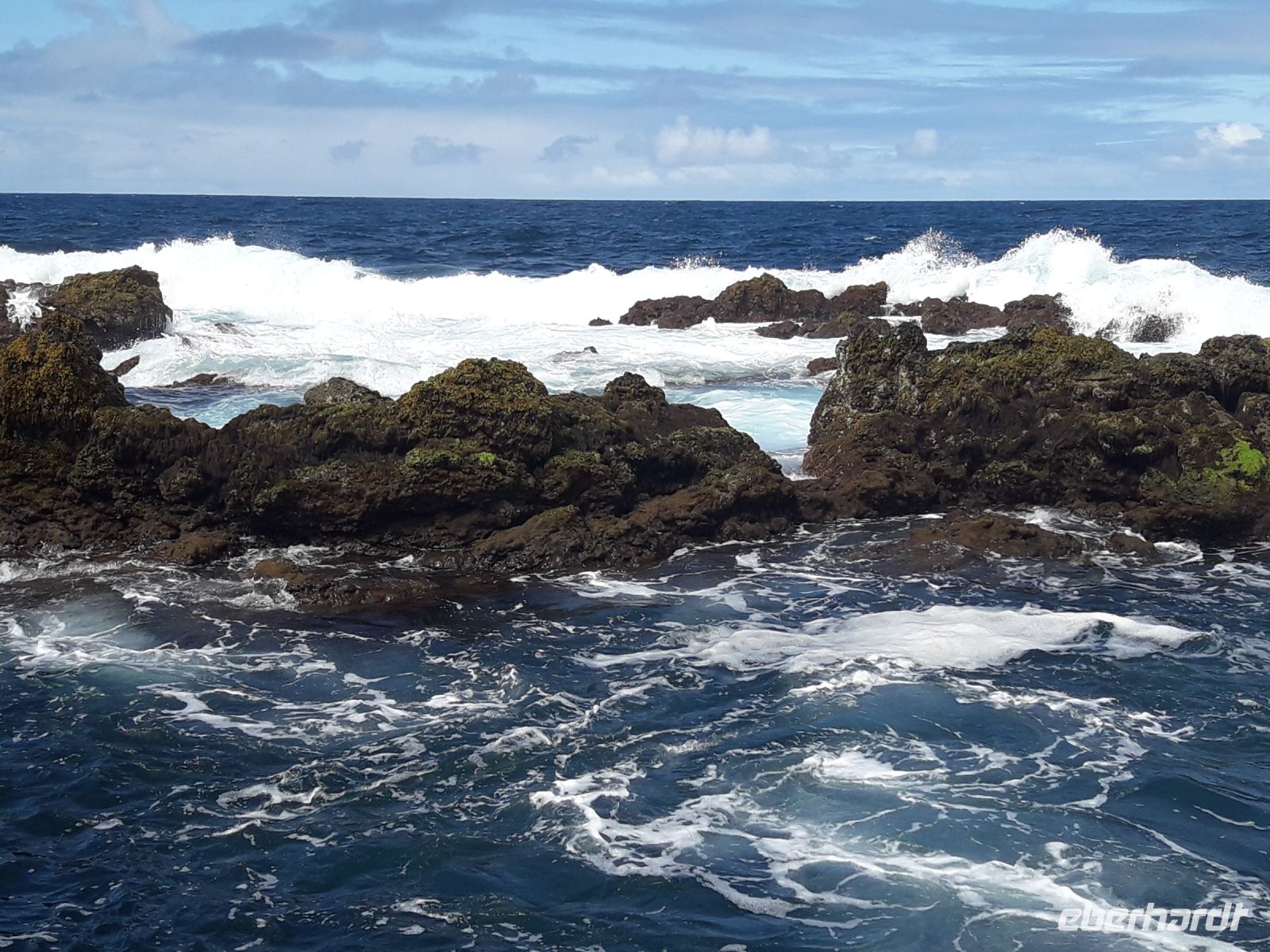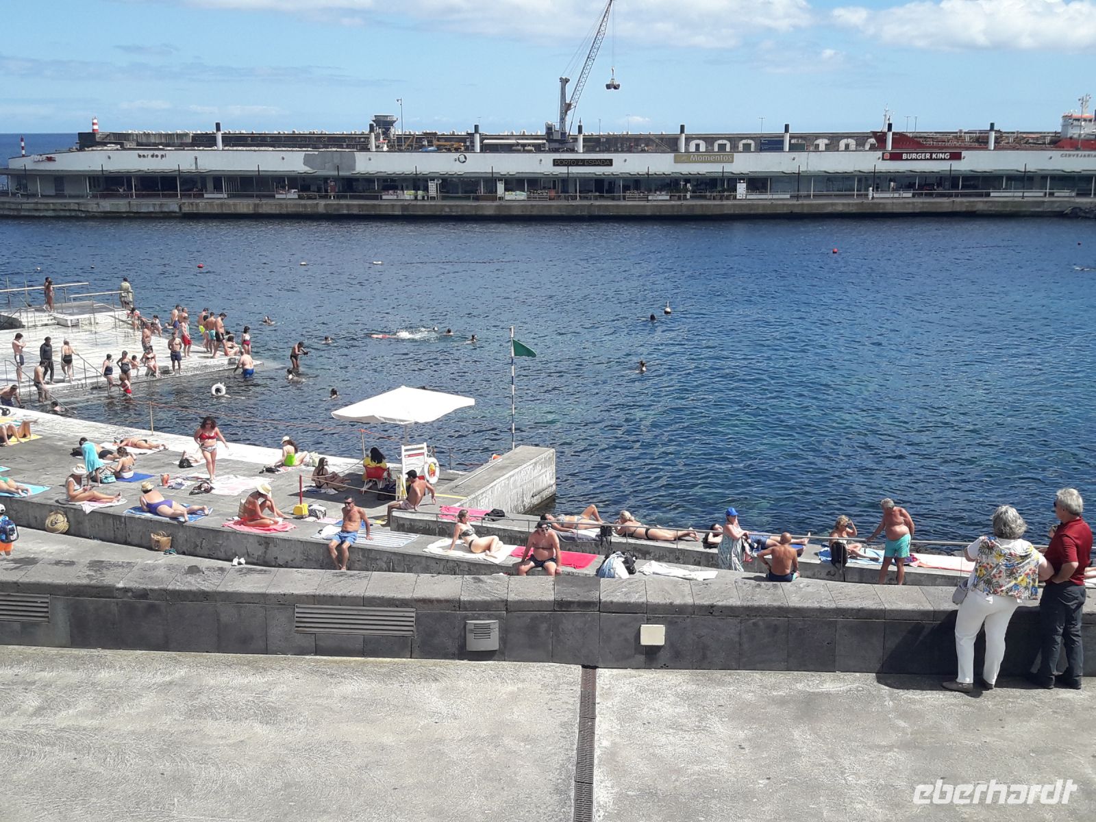 Praia da Victoria, ein hübsches Städtchen an der Ostküste mit einer weitläufigen Bucht, ist Ziel für unsere Mittagspause. Vom Hauptplatz aus mit der Freiheitsstatue sehen wir das Rathaus. Danach geht es im zweiten Anlauf die alte Militärstraße hoch hinauf zur Serra do Cume in über 500 Metern Höhe, wo wir die tolle Aussicht genießen. In einer von Viehzucht geprägten Landschaft mit ihren schwarzen Steinmauern und Kühen auf saftiggrünen Weiden fahren wir weiter an die Nordküste. In Biscoitos erfreut uns zunächst eine Weinprobe mit dem berühmten Verdelho-Wein, aber noch mehr die Ponta dos Biscoitos, eine traumhafte Naturschwimmbeckenlandschaft inmitten schwarzer Lavafelsen.