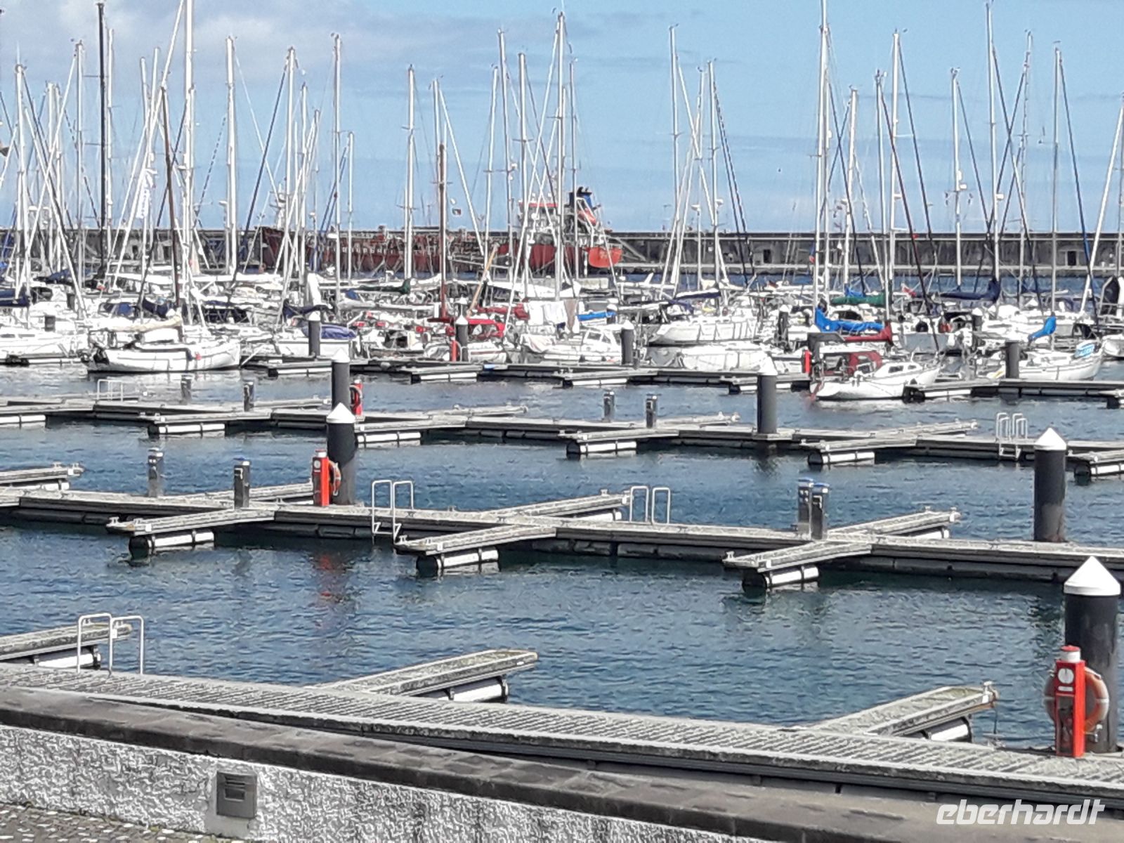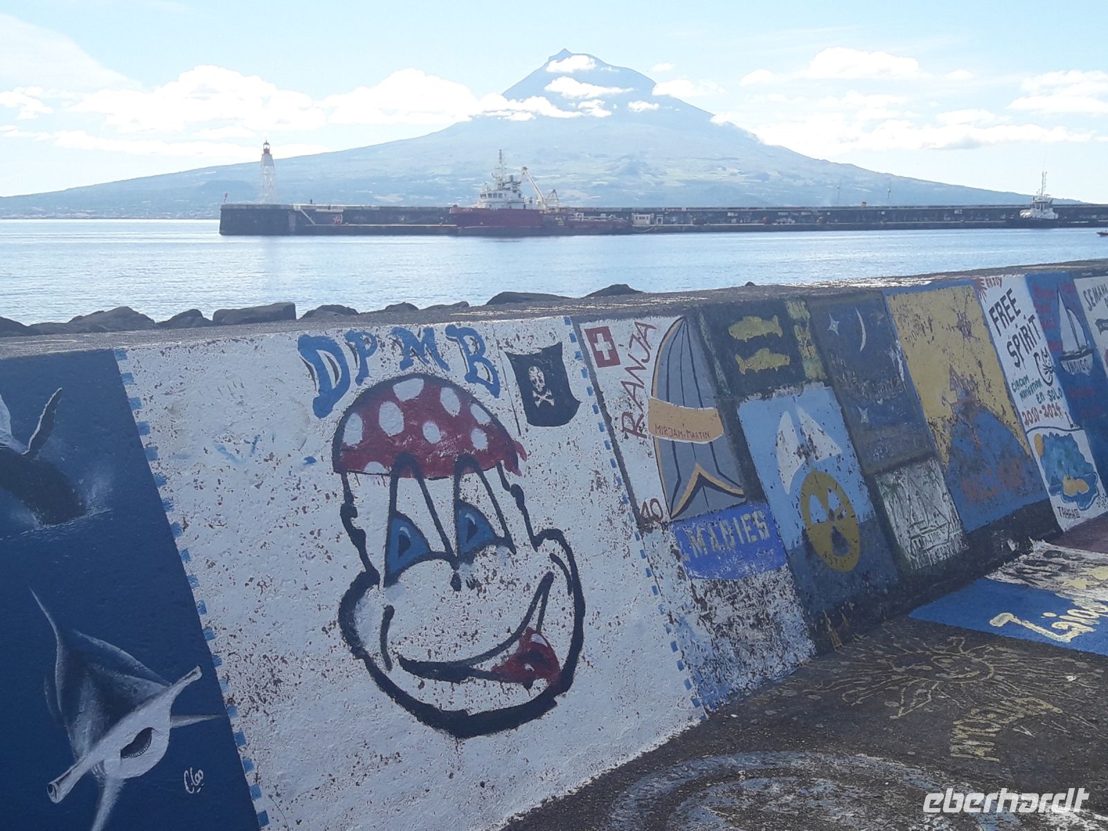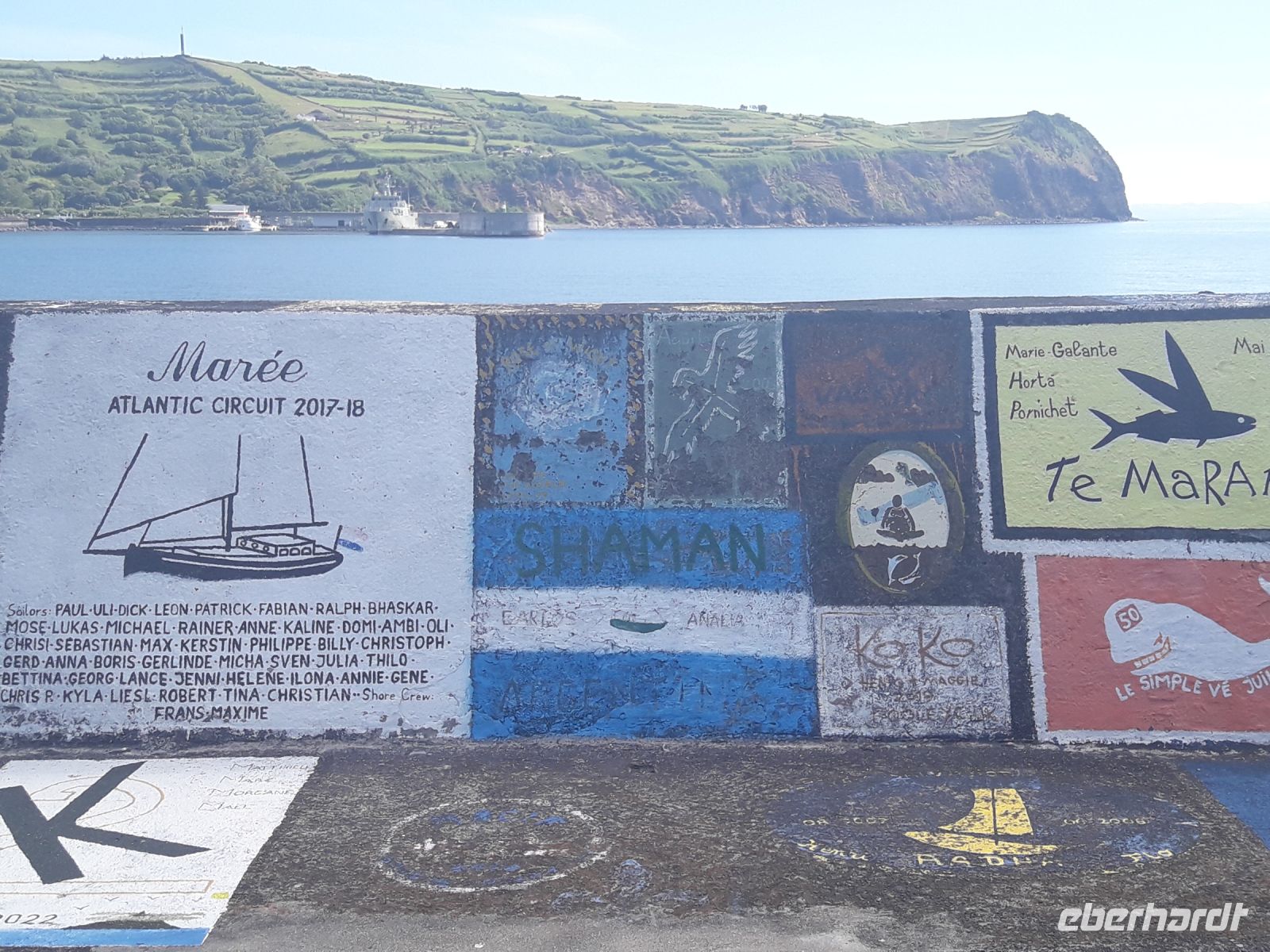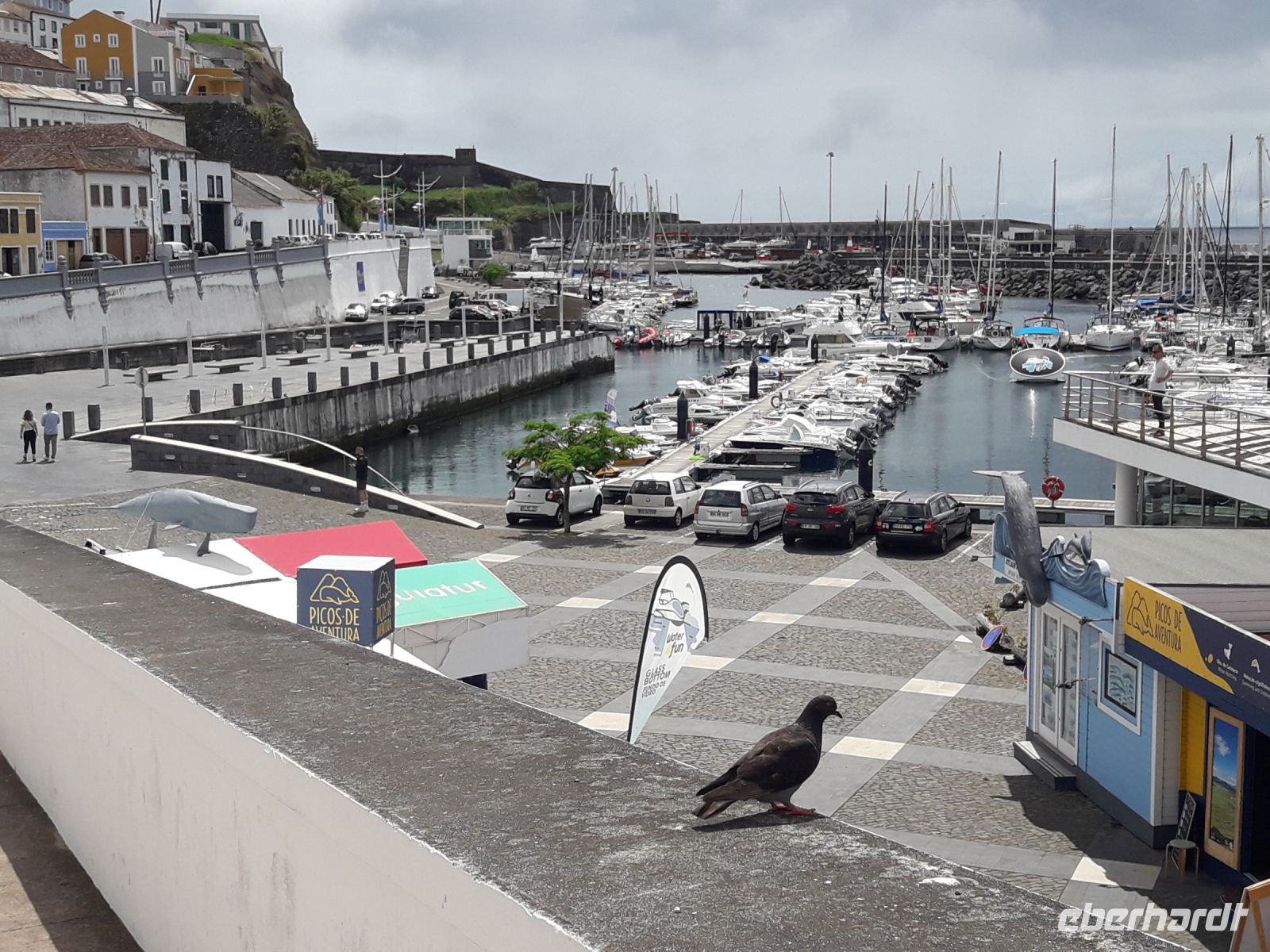 Mit unserem Faial-Reiseleiter Paulo steht für uns am Vormittag ein Spaziergang durch Horta, der drittgrößten Stadt der Azoren, auf dem Programm. Die Stadt besitzt ein ausgeprägtes internationales Flair, nicht nur wegen der ungewöhnlichen "Gemäldegalerie" an der Kaimauer im Yachthafen, wo sich augenscheinlich jede Crew aus aller Welt verewigt hat - sicher aber auch im urigen Ambiente von Peters Cafe Sport, in dem einige von uns schon am Vorabend einen Platz ergattern konnten. Die malerische Hafenstadt weist einige schmucke Häuser im Art-Deco-Stil auf, jedoch auch unbewohnte und verfallende Gebäude. Die Kirchen sind allesamt weiß gehalten, abgesetzt mit schwarz-braunen Basaltsteinen. Wir gehen vorbei an der Festung Santa Cruz mit dem Denkmal Heinrich des Seefahrers hinauf zur "Deutschen Kolonie", dem früheren Sitz der Deutsch-Atlantischen Telegrafengesellschaft mit Originalfenstern im Wintergarten und zum Regionalparlament der Azoren. Hoch über der Stadt, vor der Igreja de Nossa Senhora do Carmo, genießen wir den Blick über die Dächer und zum Pico sowie unten am Hauptplatz, der an die Markthalle grenzt, die verspielten Wasserflächen unter den großen Araukarien. Am Rathaus vorbei bildet dann die Marina den krönenden Abschluss unseres Rundgangs.