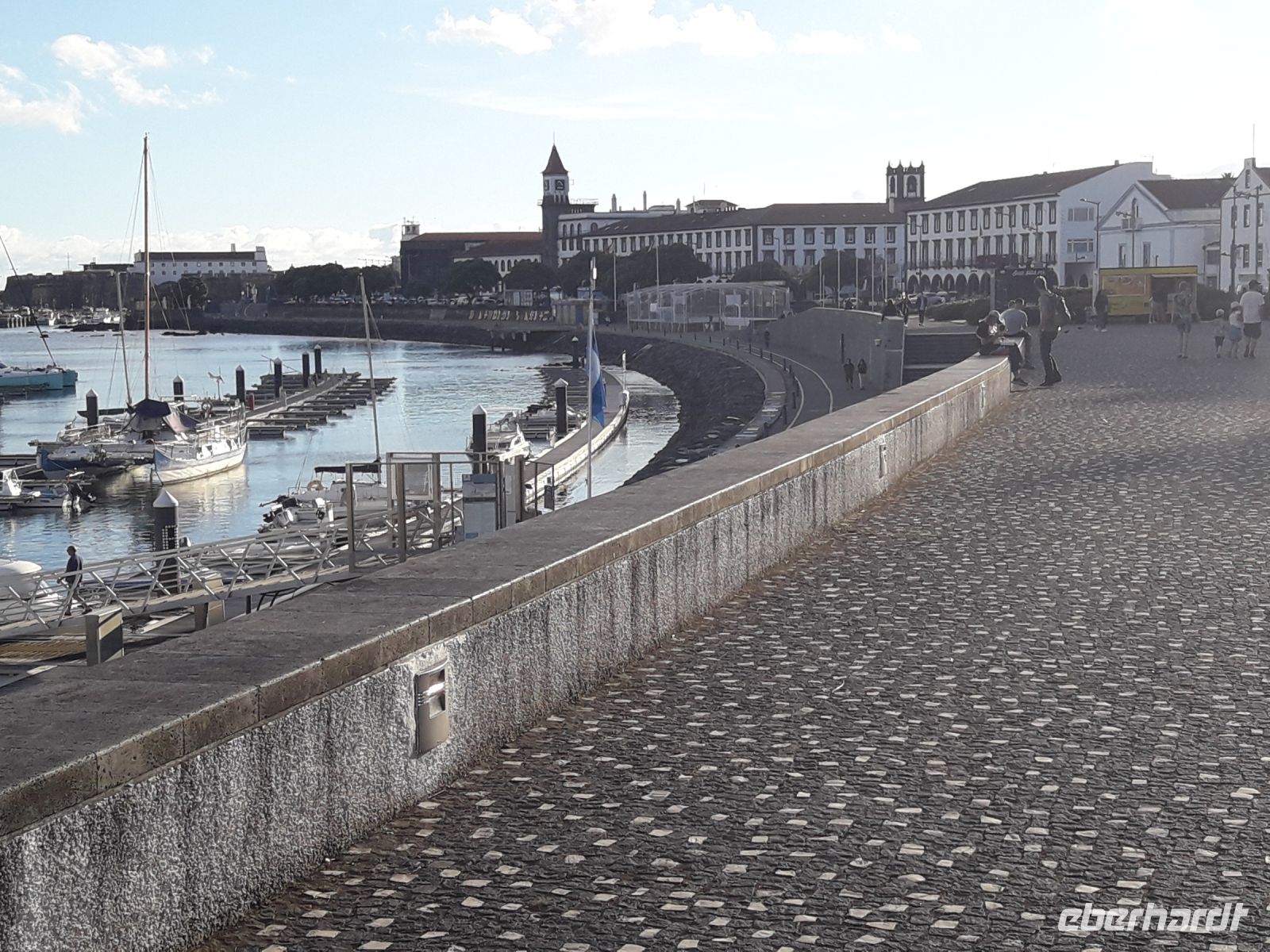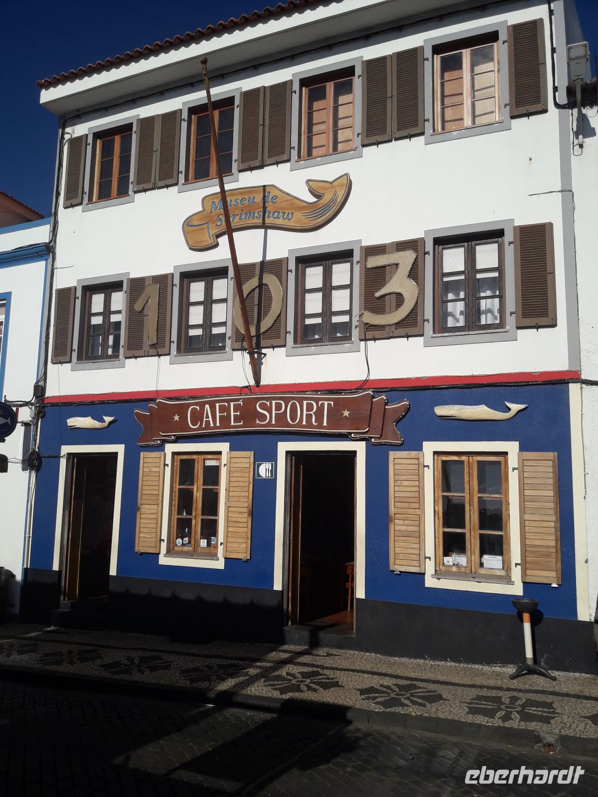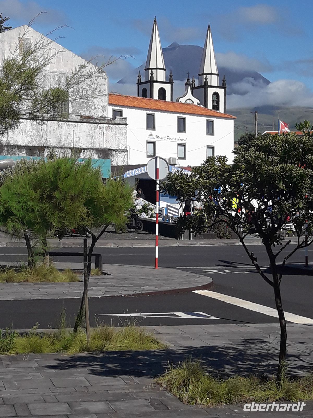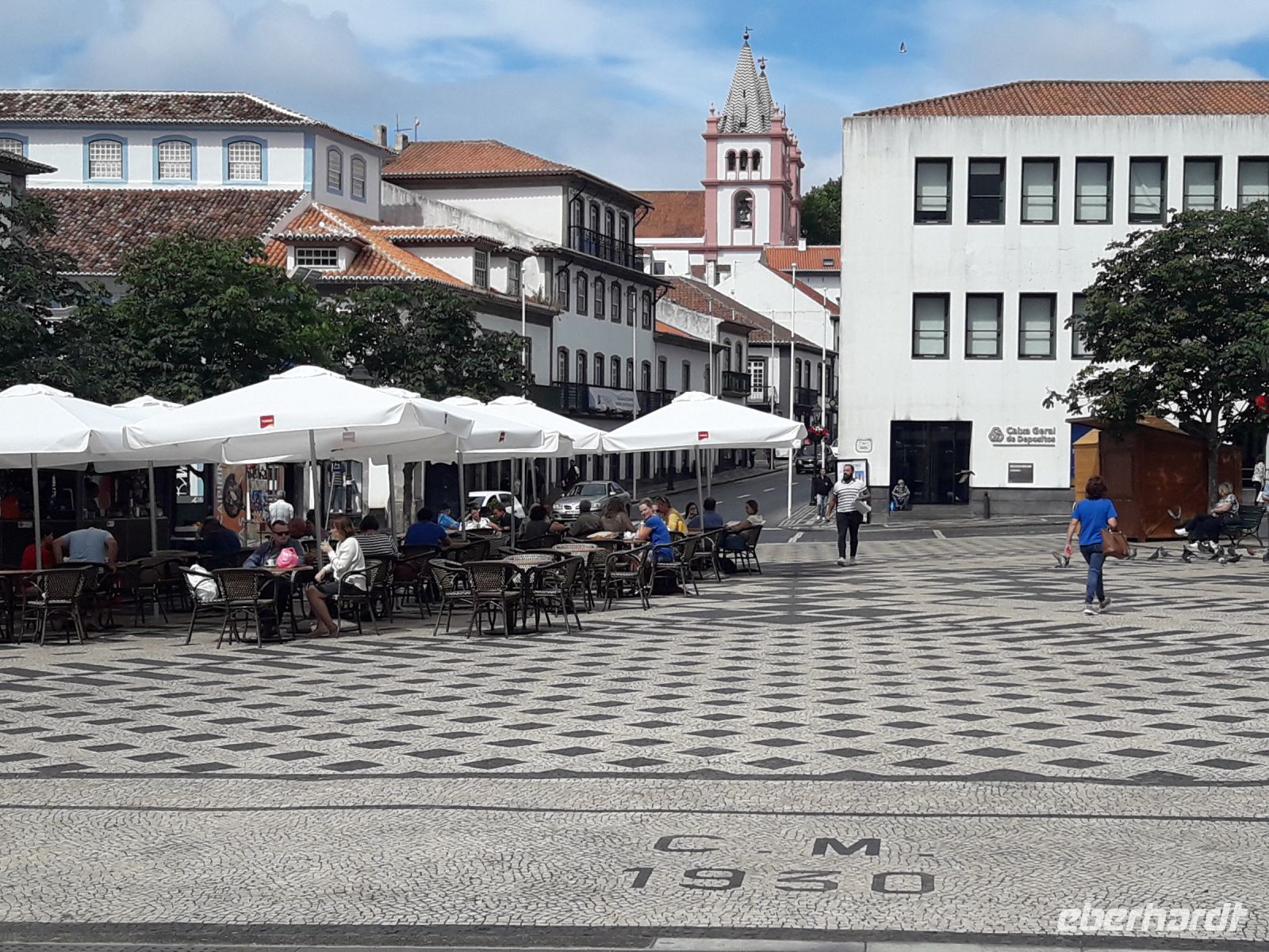 Mit unserem Faial-Reiseleiter Paulo steht für uns am Vormittag ein Spaziergang durch Horta, der drittgrößten Stadt der Azoren, auf dem Programm. Die Stadt besitzt ein ausgeprägtes internationales Flair, nicht nur wegen der ungewöhnlichen "Gemäldegalerie" an der Kaimauer im Yachthafen, wo sich augenscheinlich jede Crew aus aller Welt verewigt hat - sicher aber auch im urigen Ambiente von Peters Cafe Sport, in dem einige von uns schon am Vorabend einen Platz ergattern konnten. Die malerische Hafenstadt weist einige schmucke Häuser im Art-Deco-Stil auf, jedoch auch unbewohnte und verfallende Gebäude. Die Kirchen sind allesamt weiß gehalten, abgesetzt mit schwarz-braunen Basaltsteinen. Wir gehen vorbei an der Festung Santa Cruz mit dem Denkmal Heinrich des Seefahrers hinauf zur "Deutschen Kolonie", dem früheren Sitz der Deutsch-Atlantischen Telegrafengesellschaft mit Originalfenstern im Wintergarten und zum Regionalparlament der Azoren. Hoch über der Stadt, vor der Igreja de Nossa Senhora do Carmo, genießen wir den Blick über die Dächer und zum Pico sowie unten am Hauptplatz, der an die Markthalle grenzt, die verspielten Wasserflächen unter den großen Araukarien. Am Rathaus vorbei bildet dann die Marina den krönenden Abschluss unseres Rundgangs.
