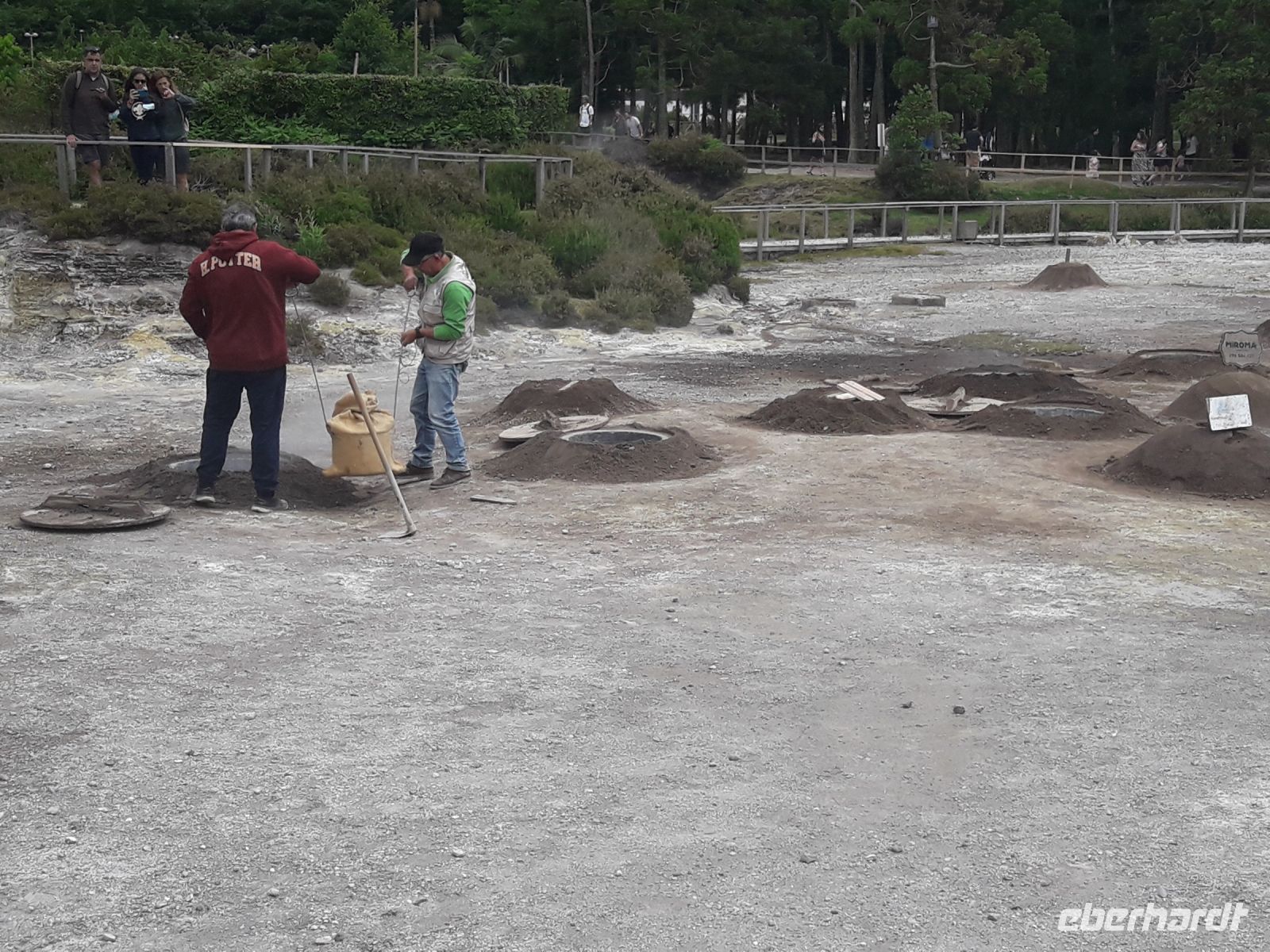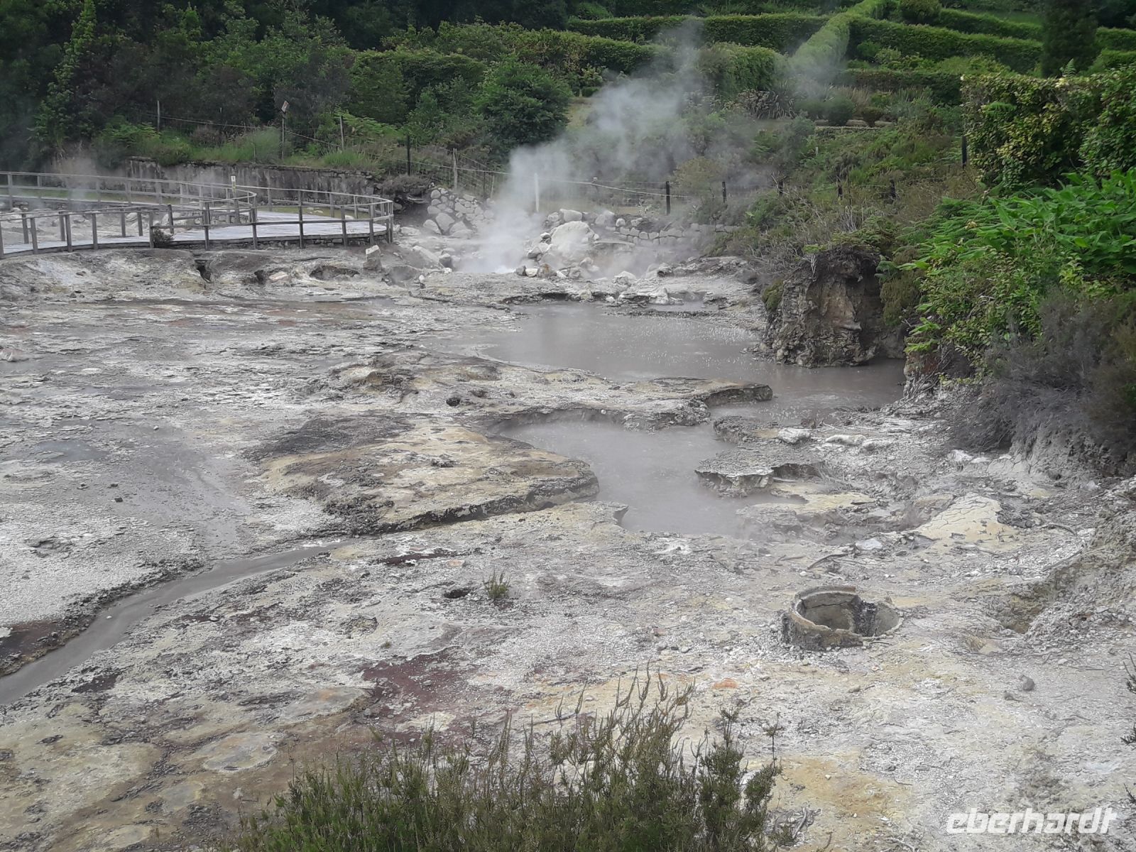 Busfahrer Paulo versorgt uns im Bus mit Wasser. Wir sind fasziniert vom saftigen Grün der Insel und den blühenden Hortensien und erreichen den Furnas-See inmitten eines alten Vulkankraters. Das ausgedehnte Feld mit eindrucksvollen schwefelhaltigen heißen Quellen ist ein Erlebnis. In ihnen wird unser in einem Lokal in Furnas zu erwartende Cozido gekocht - ein Schmortopf mit verschiedenen Fleischsorten, Gemüse und Kohl.