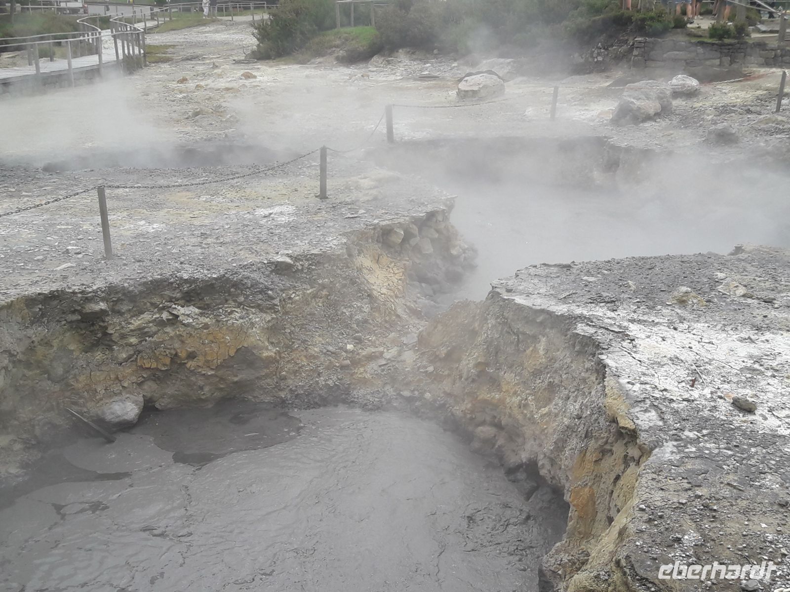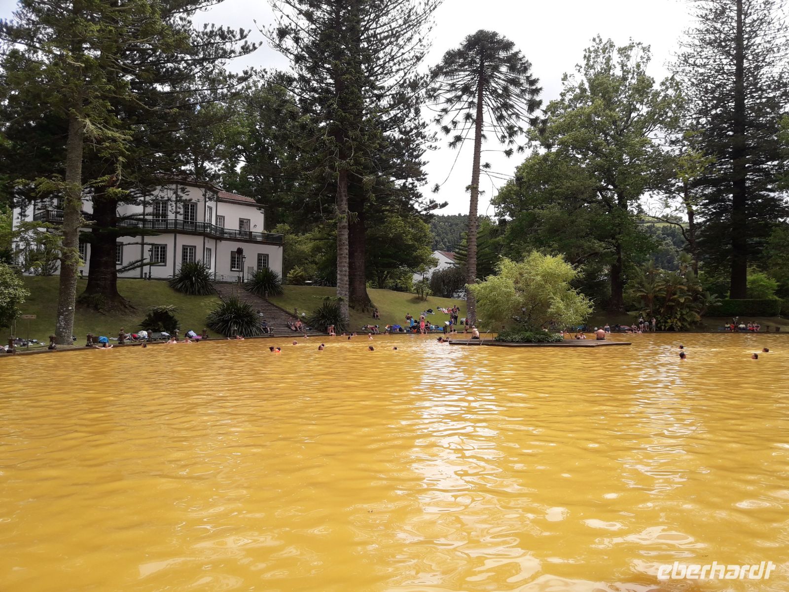 kleinen Teichen, gewundenen Wegen und einem Thermalbecken, dessen 30-40 Grad warmes Wasser eine bräunliche Färbung hat. Viele unserer Gruppe genießen das Bad trotzdem in vollen Zügen.