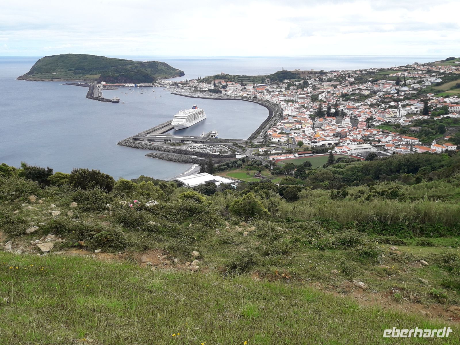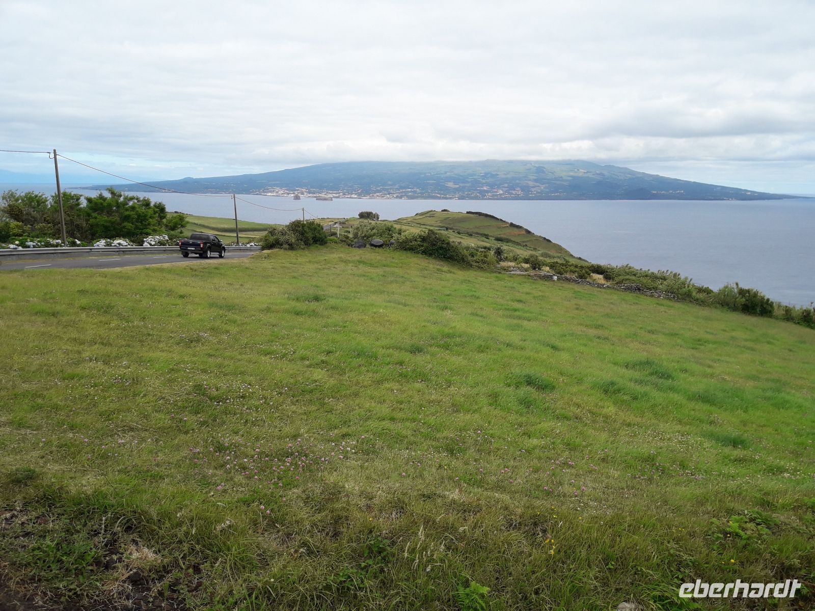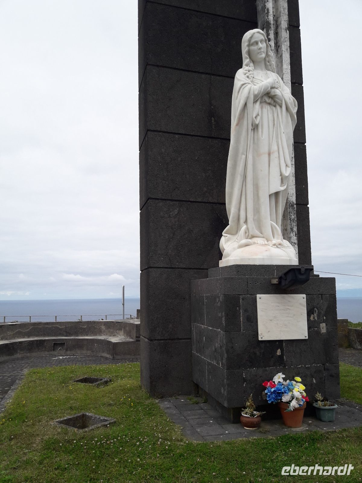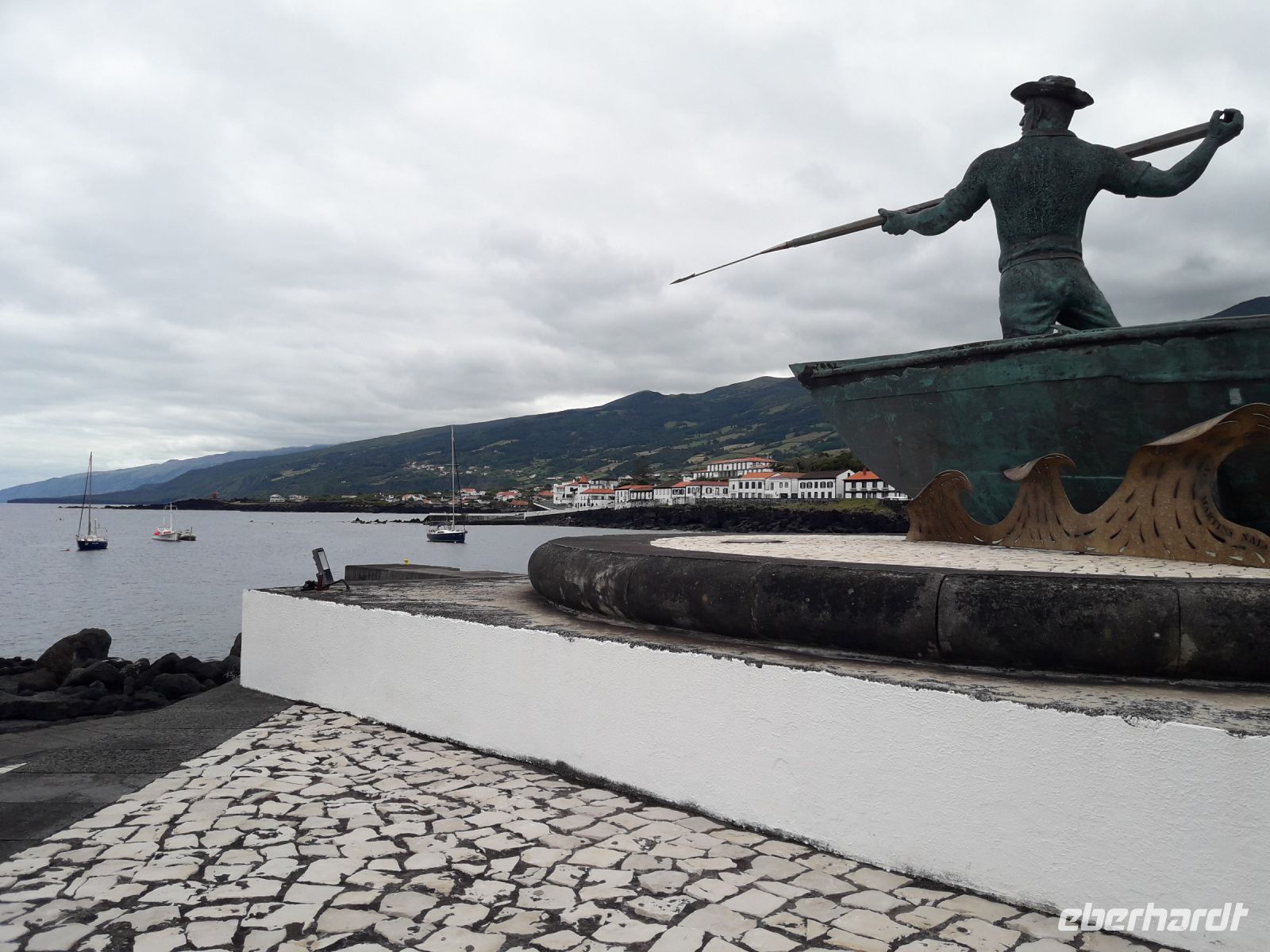 Nach einem kurzen Spaziergang im nahegelegenen Waldpark von Capelo mit Wildgehegen machen wir Mittagspause in Varadouro mit seinen Naturschwimmbecken, fahren weiter an die Nordküste und dann hoch zu der im Nebel liegenden Caldeira do Faial - für uns leider nur zum Teil sichtbar. Durchs "Flämische Tal", wo sich einst schon im 15. Jahrhundert Siedler aus Flandern niederließen, geht es hinunter zum Miradouro do Espalamaco mit dem Denkmal der Inselheiligen und schönem Panoramablick auf Horta und die Insel Pico.