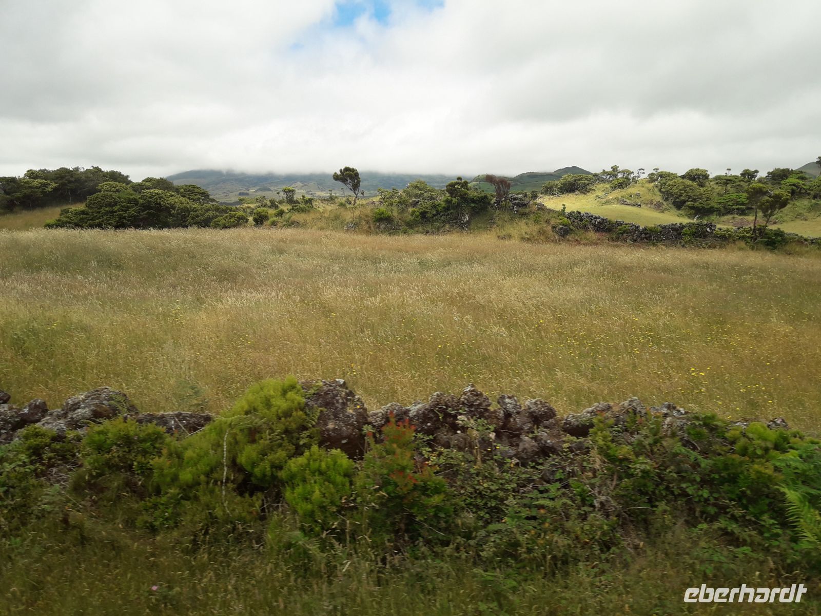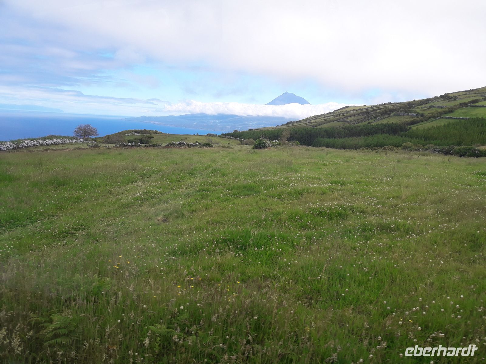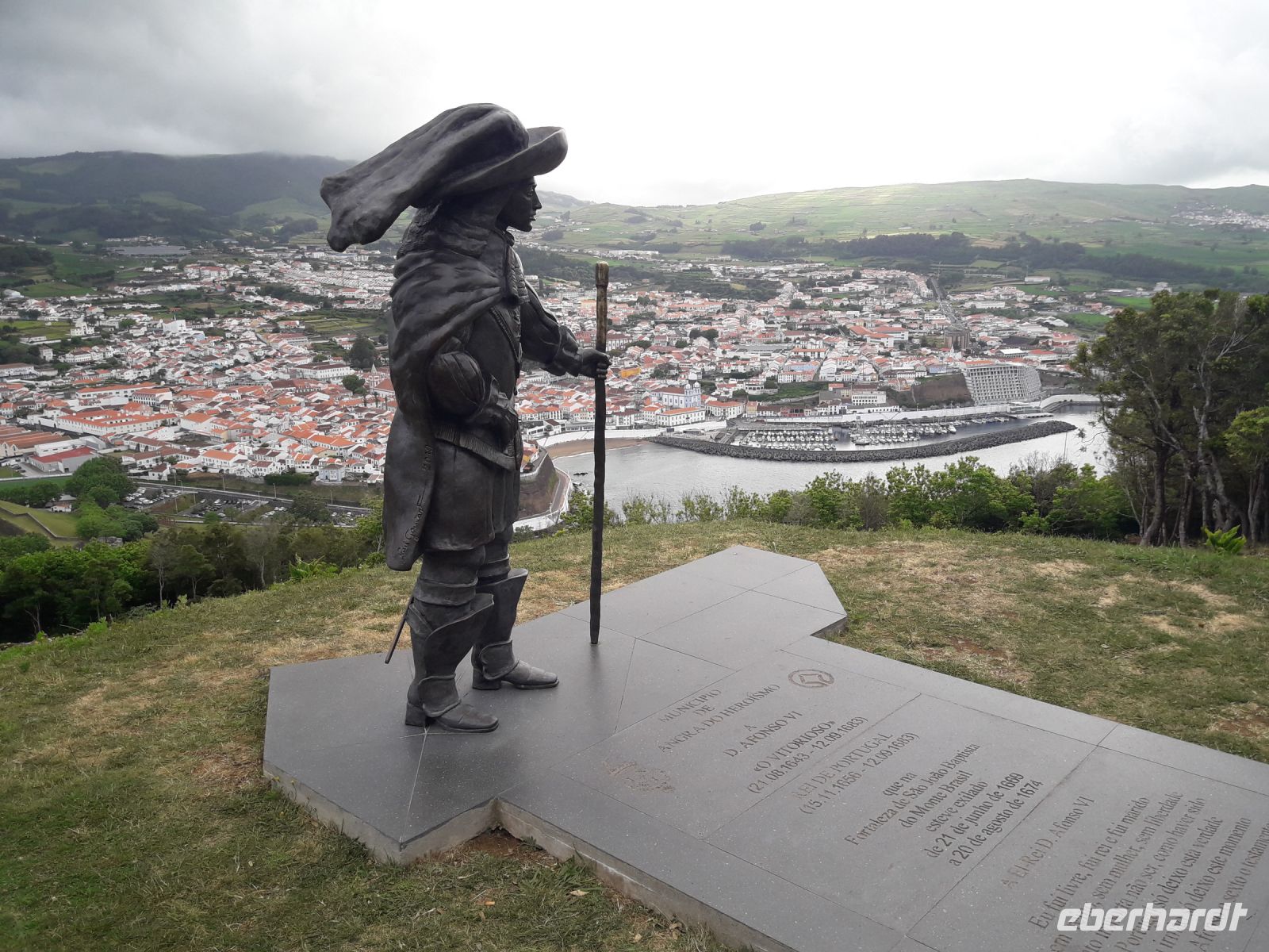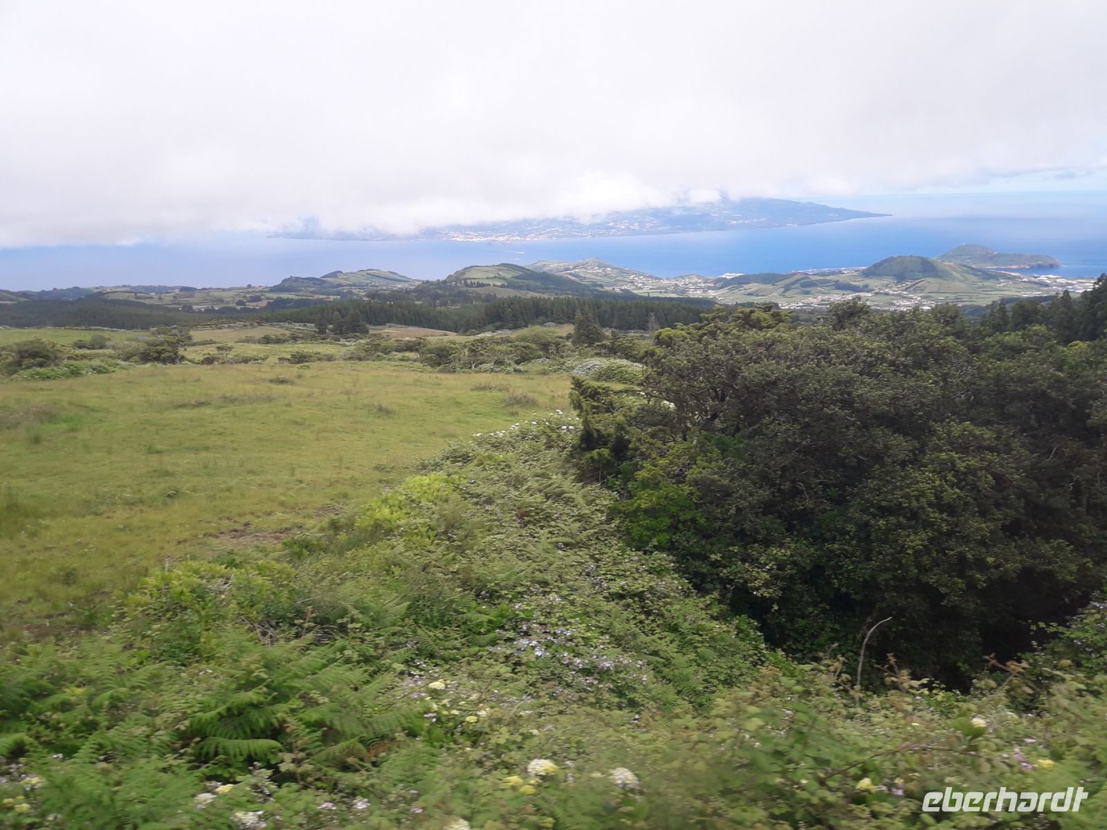 Nach einem kurzen Spaziergang im nahegelegenen Waldpark von Capelo mit Wildgehegen machen wir Mittagspause in Varadouro mit seinen Naturschwimmbecken, fahren weiter an die Nordküste und dann hoch zu der im Nebel liegenden Caldeira do Faial - für uns leider nur zum Teil sichtbar. Durchs "Flämische Tal", wo sich einst schon im 15. Jahrhundert Siedler aus Flandern niederließen, geht es hinunter zum Miradouro do Espalamaco mit dem Denkmal der Inselheiligen und schönem Panoramablick auf Horta und die Insel Pico.