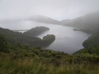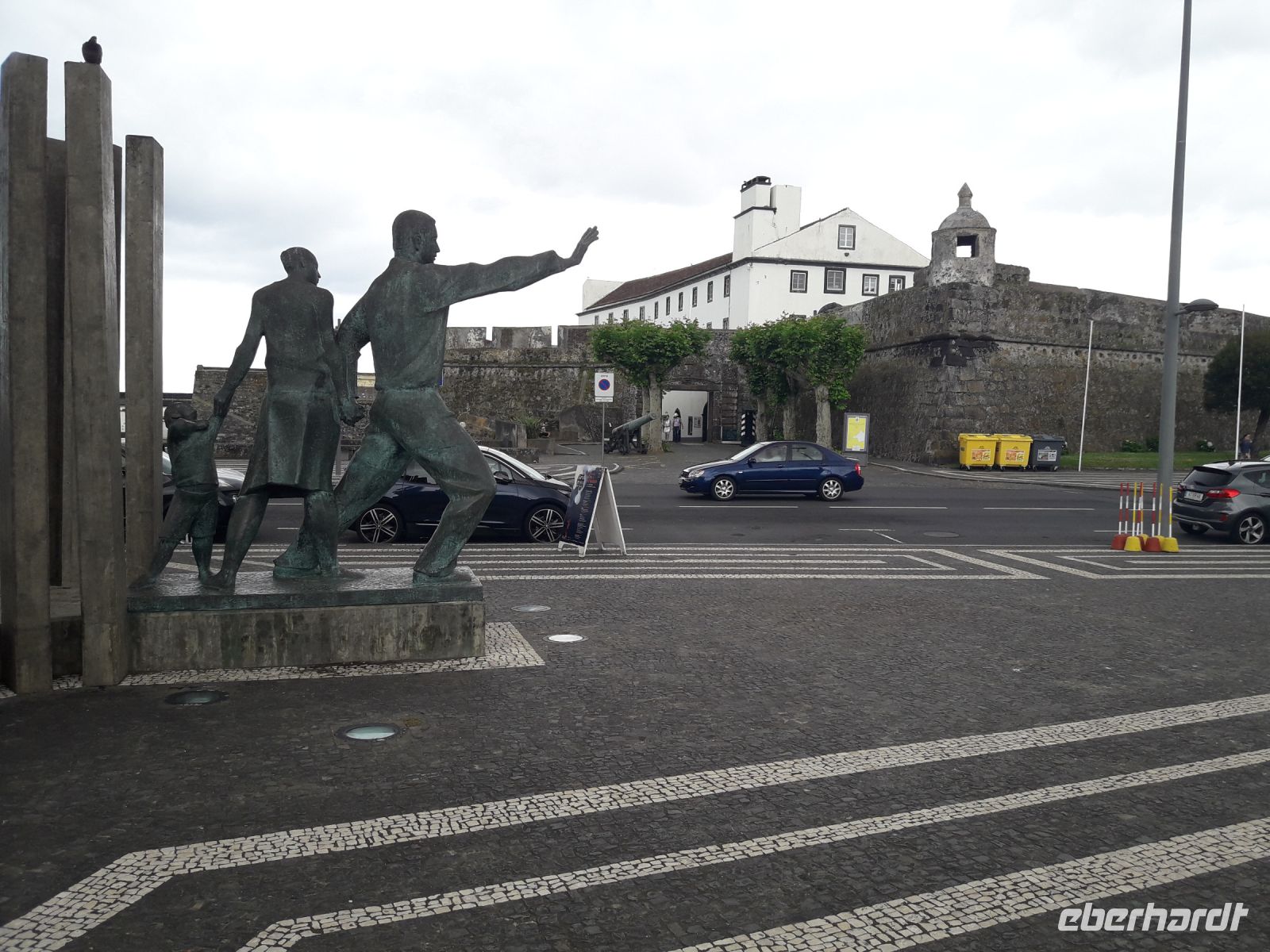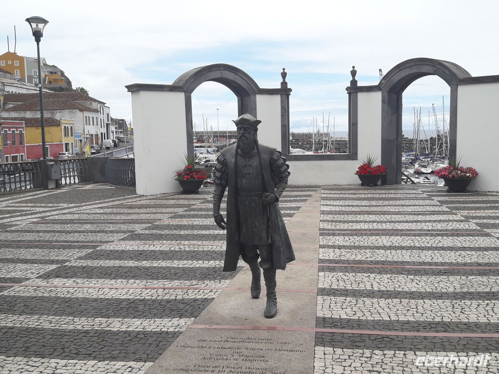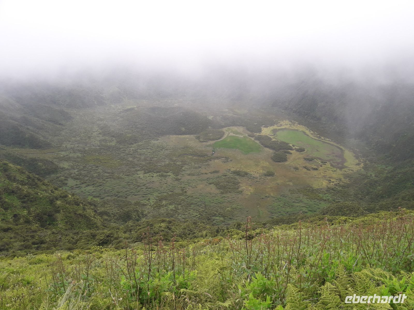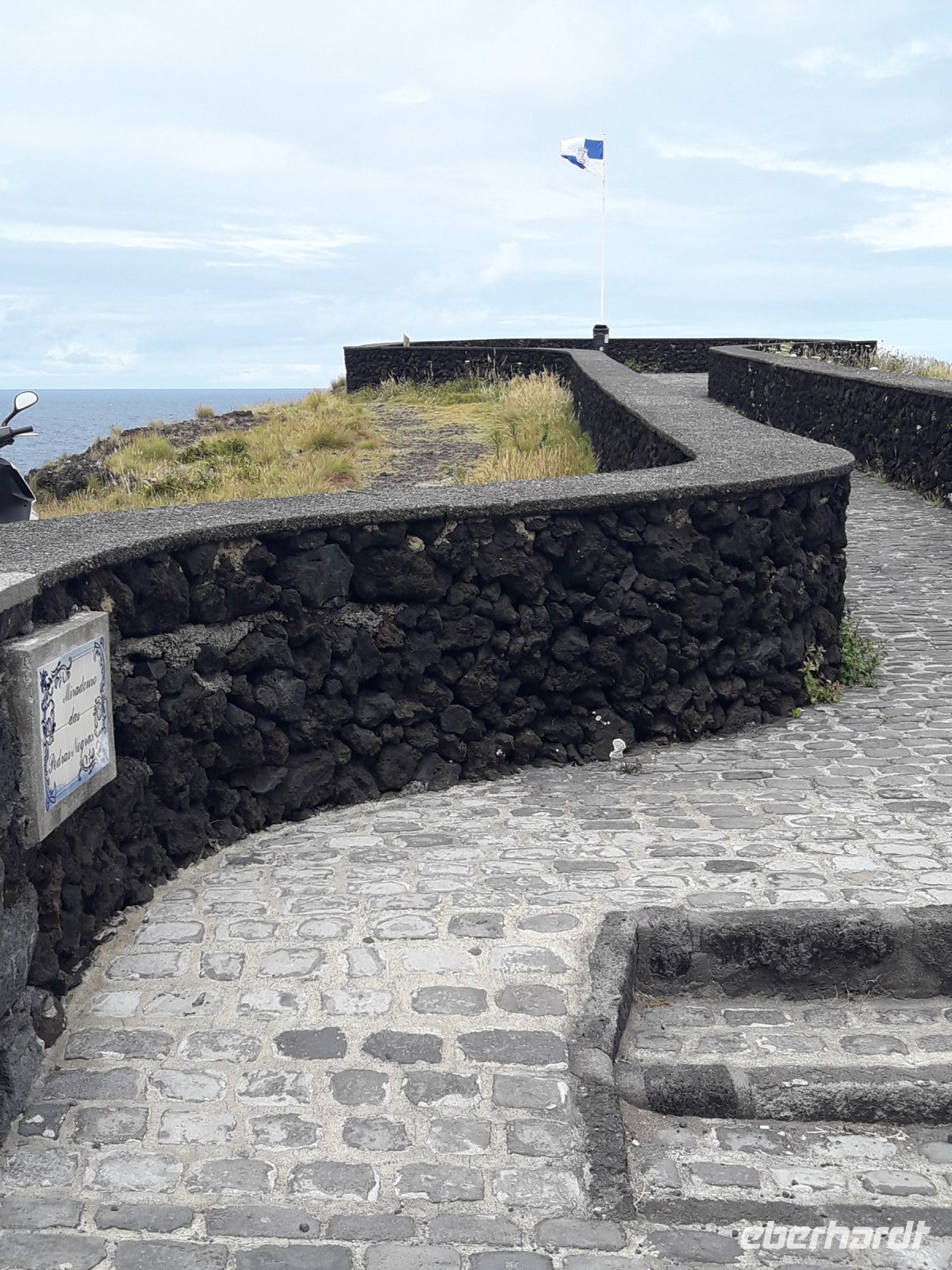 Nach einem kurzen Spaziergang im nahegelegenen Waldpark von Capelo mit Wildgehegen machen wir Mittagspause in Varadouro mit seinen Naturschwimmbecken, fahren weiter an die Nordküste und dann hoch zu der im Nebel liegenden Caldeira do Faial - für uns leider nur zum Teil sichtbar. Durchs "Flämische Tal", wo sich einst schon im 15. Jahrhundert Siedler aus Flandern niederließen, geht es hinunter zum Miradouro do Espalamaco mit dem Denkmal der Inselheiligen und schönem Panoramablick auf Horta und die Insel Pico.