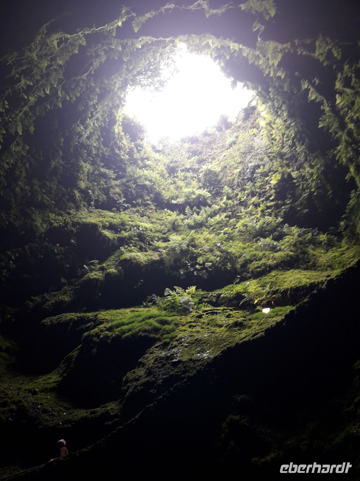 Zum Höhepunkt des Tages wird dann der Besuch der Höhle Algar do Corvao - ein ehemaliger Vulkanschlot mit einem Kratersee in 90 Meter Tiefe, zu dem wir hinabsteigen. Sie liegt inmitten der mit 7 Kilometern Durchmesser größten Caldeira des Archipels.