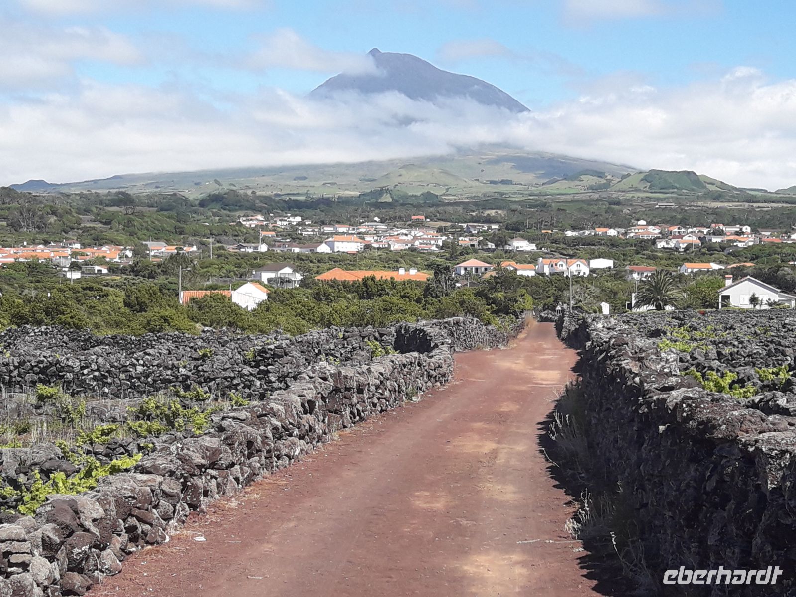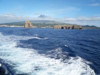 Nach schönen Stopps entlang der Südküste kommen wir in das berühmte Weinanbaugebiet Criacao Velha ganz im Westen. Wir spazieren durch die schwarzen Lavamauern, die vor den starken Winden schützen sollen, und den grünen Reben - und mit dem inzwischen in der Sonne allgegenwärtigen freien Blick zum mit 2351 Metern höchsten Berg Portugals. Und so genießen wir auch die Rückfahrt mit der Fähre nach Horta vorbei an zwei markanten Felseninseln.