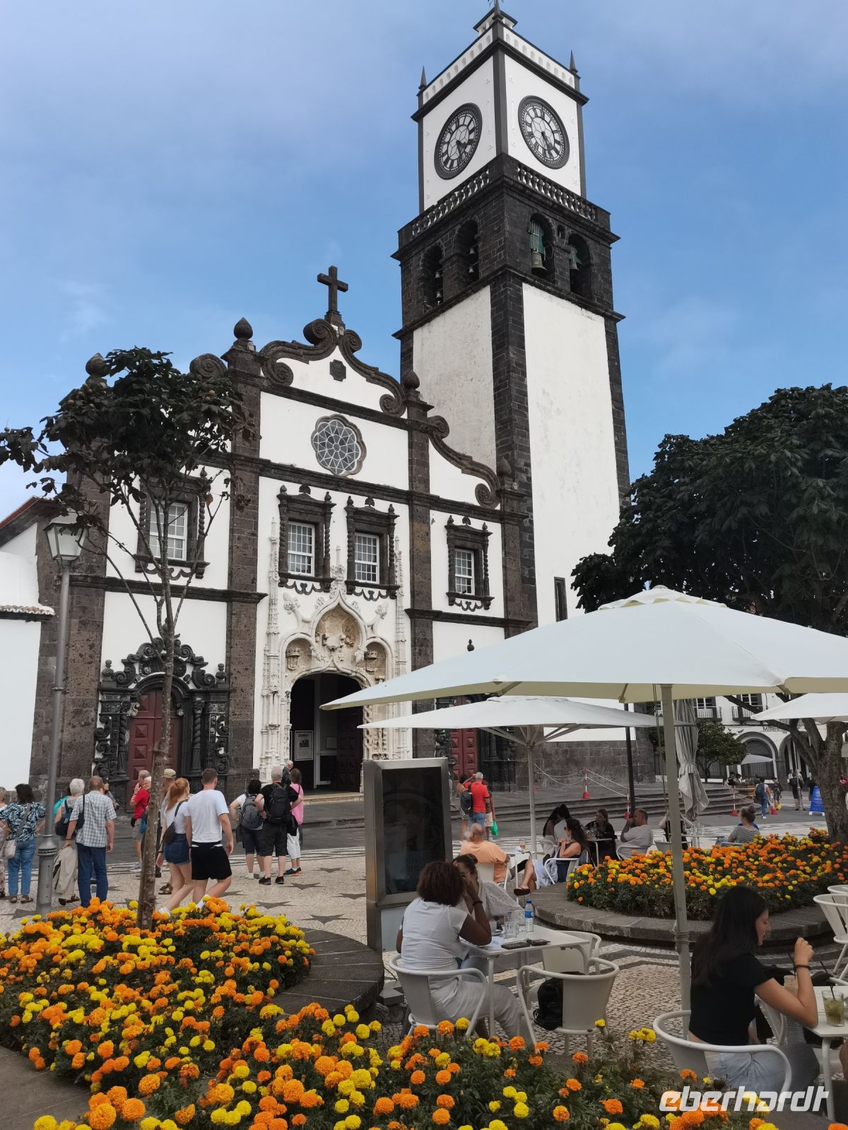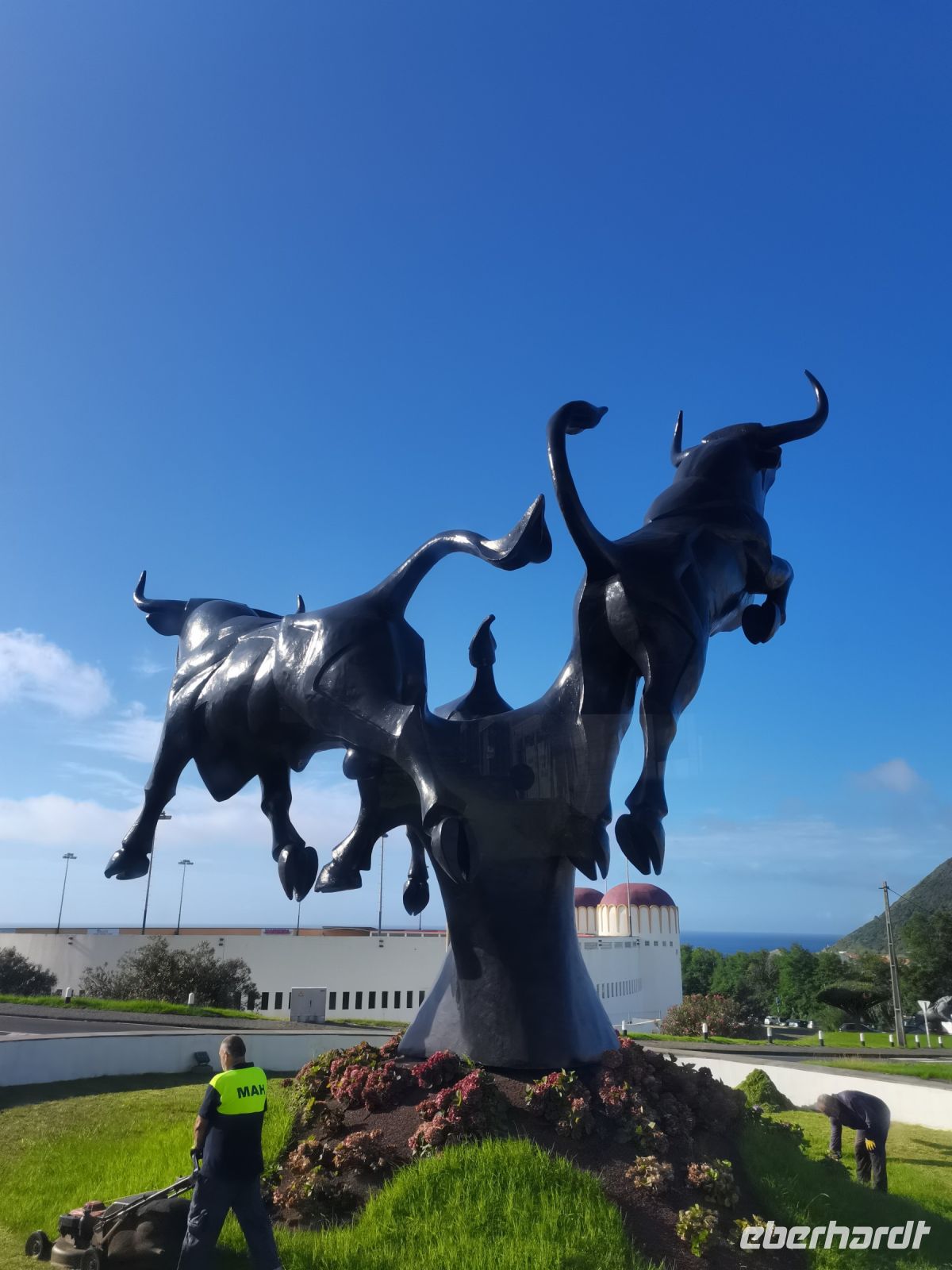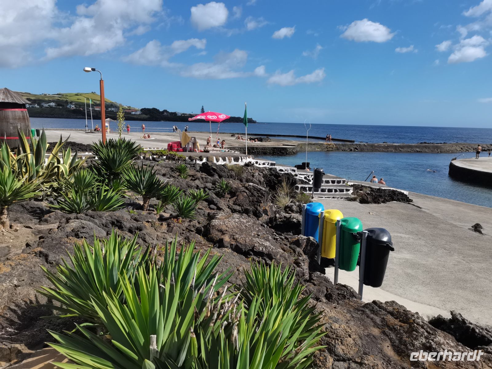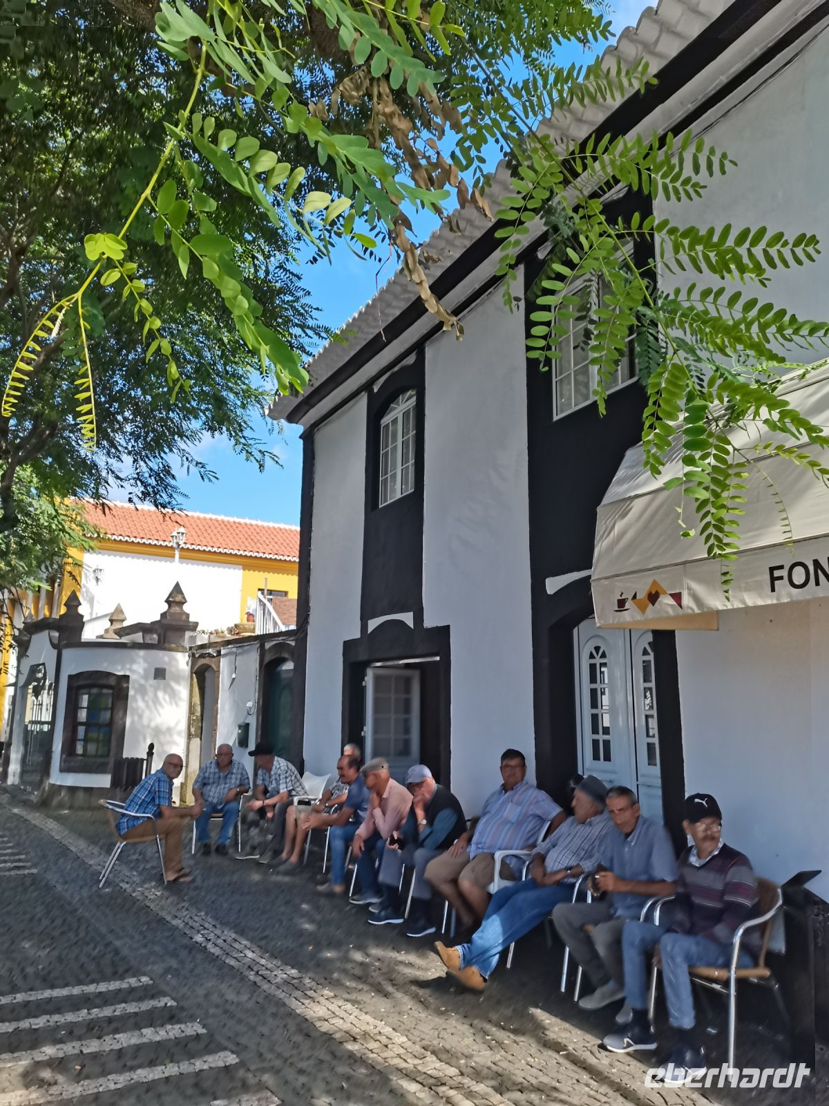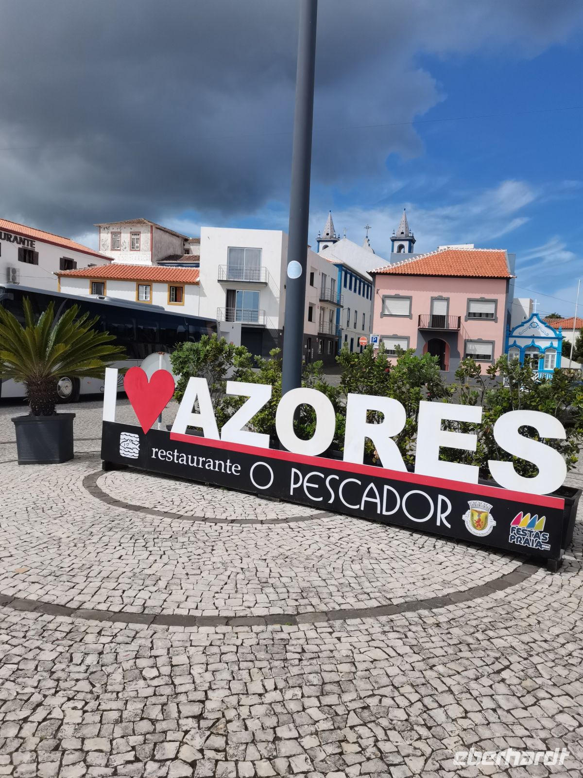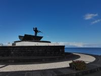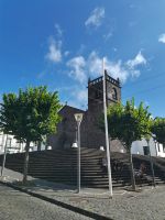 Wir erfahren, dass die Einwohner der Insel Terceira gerne feiern, so auch beim "Heiliggeist-Fest", das von Ostersonntag bis Pfingstsonntag gefeiert wird. Ganze 50 Tage dauert das fromme Danksagungsfest in den Dörfern, zu dem auch die Tradition des Stiertreibens gehört, wie uns ein großes Stier-Denkmal bestätigt. Auch Terceira ist von kleineren Inseln umgeben. Dazu gehören die "Ziegeninseln", die heute Naturschutzgebiet sind. Die Sicht ist hervorragend und wir genießen die Fahrt vorbei am Porto Judeu, wo wir eine der vielen Natur-Badestellen sehen. Unseren nächsten Halt machen wir in Sao Sebastiao, ein herausgeputzter Ort mit einem schönen Kirchplatz. Die "Igreja de Sao Sebastiao" ist eine der ältesten Kirchen der Azoren. Auf dem Platz unter Bäumen begrüßen uns freundlich die Einheimischen und wir lassen uns nieder für eine Kaffeepause. In Porto Martins sehen wir viele Ferienvillen und ein Naturschwimmbecken, das schon jetzt Lust auf unseren Badestopp in Praia da Vitória macht.