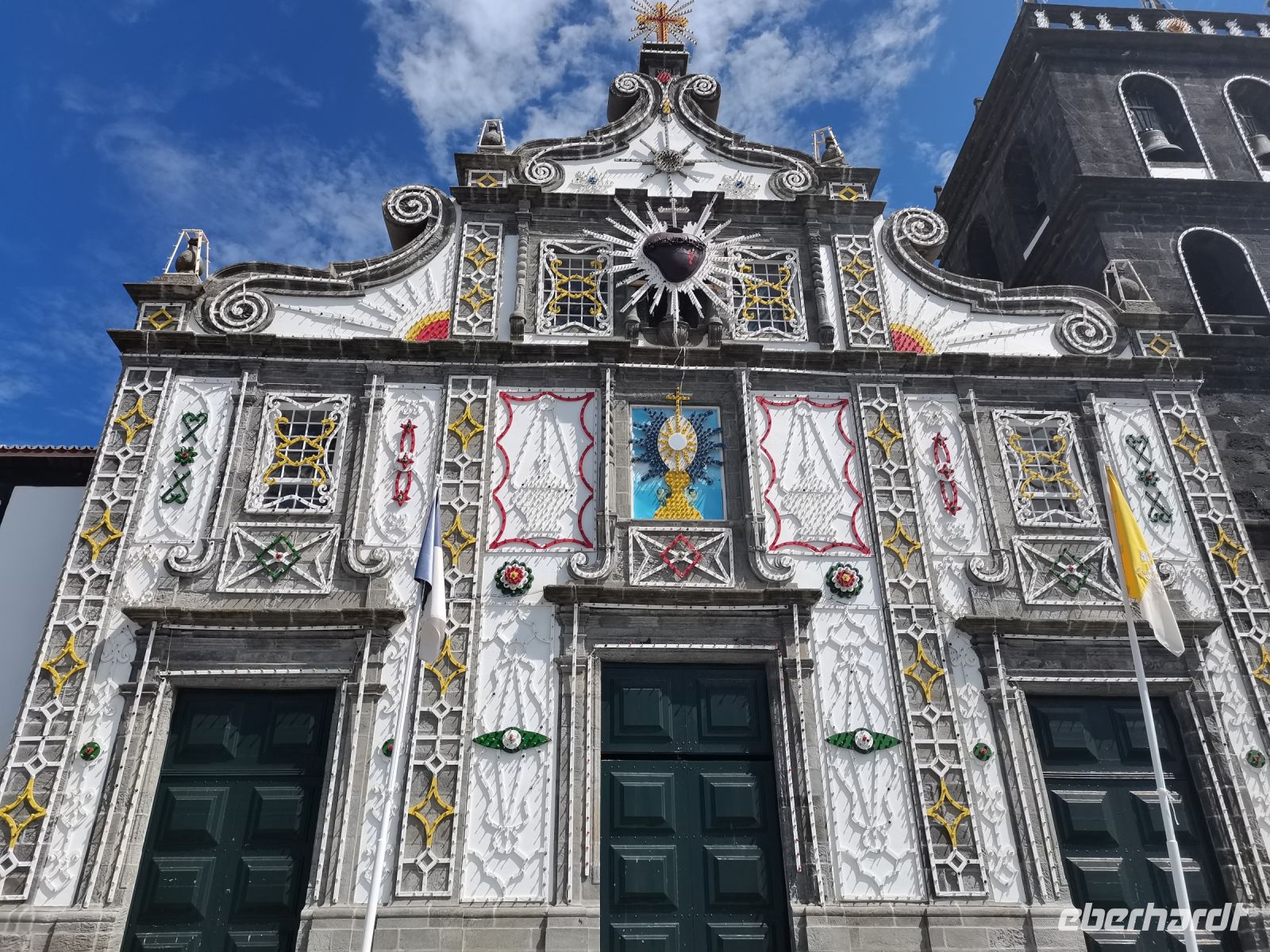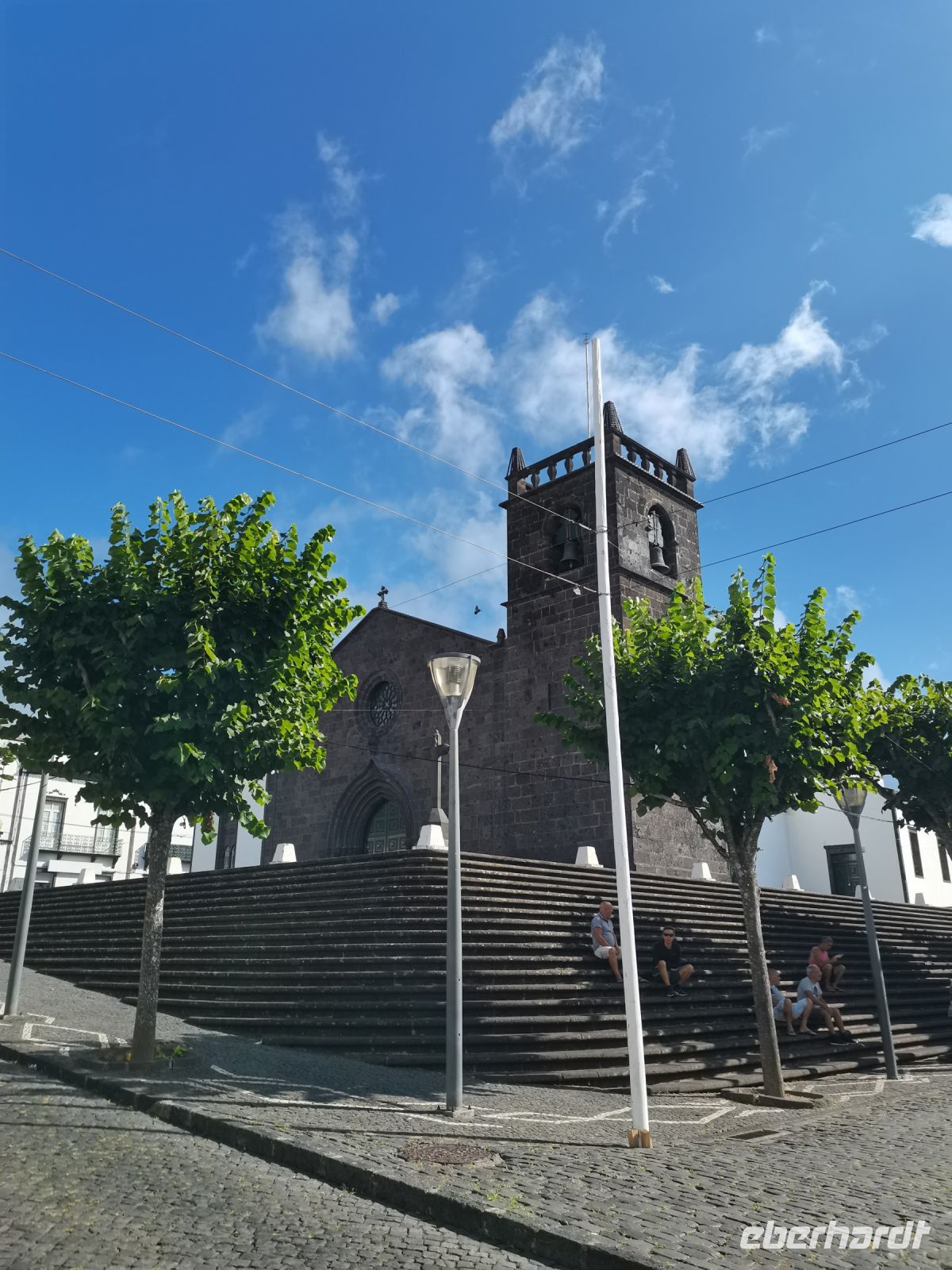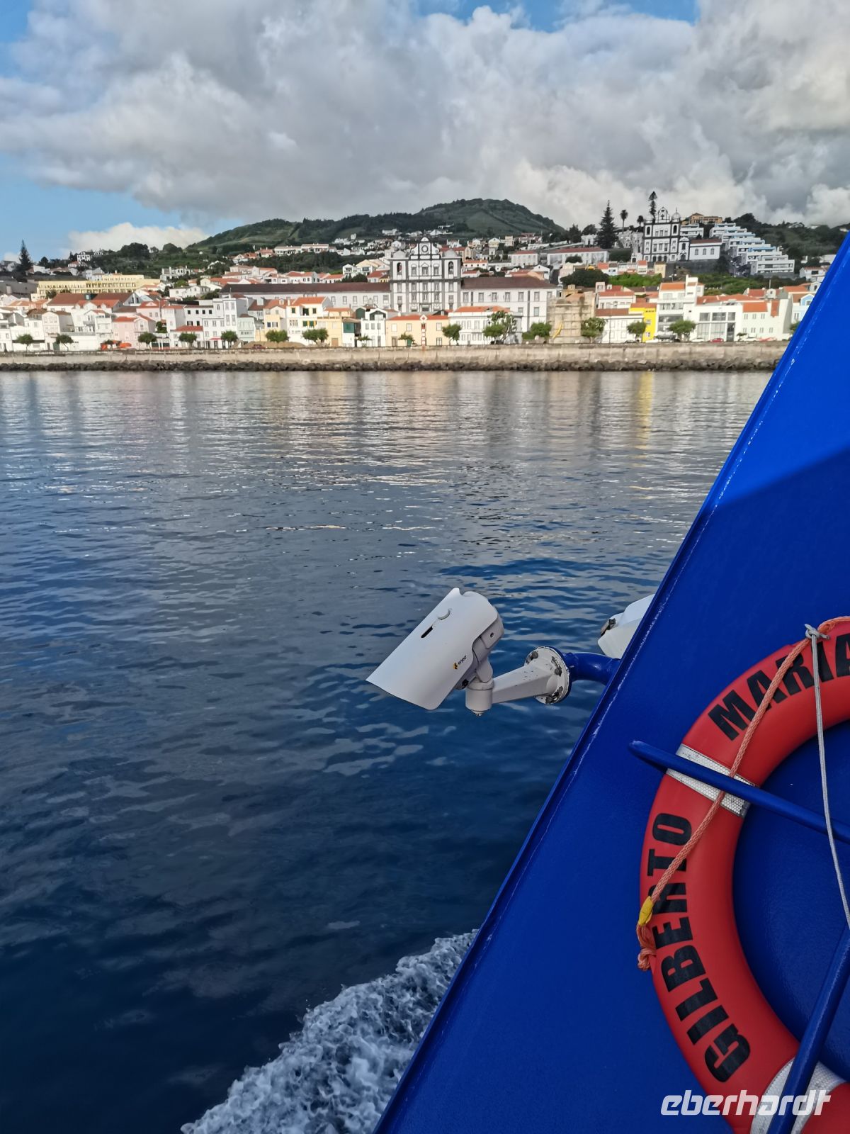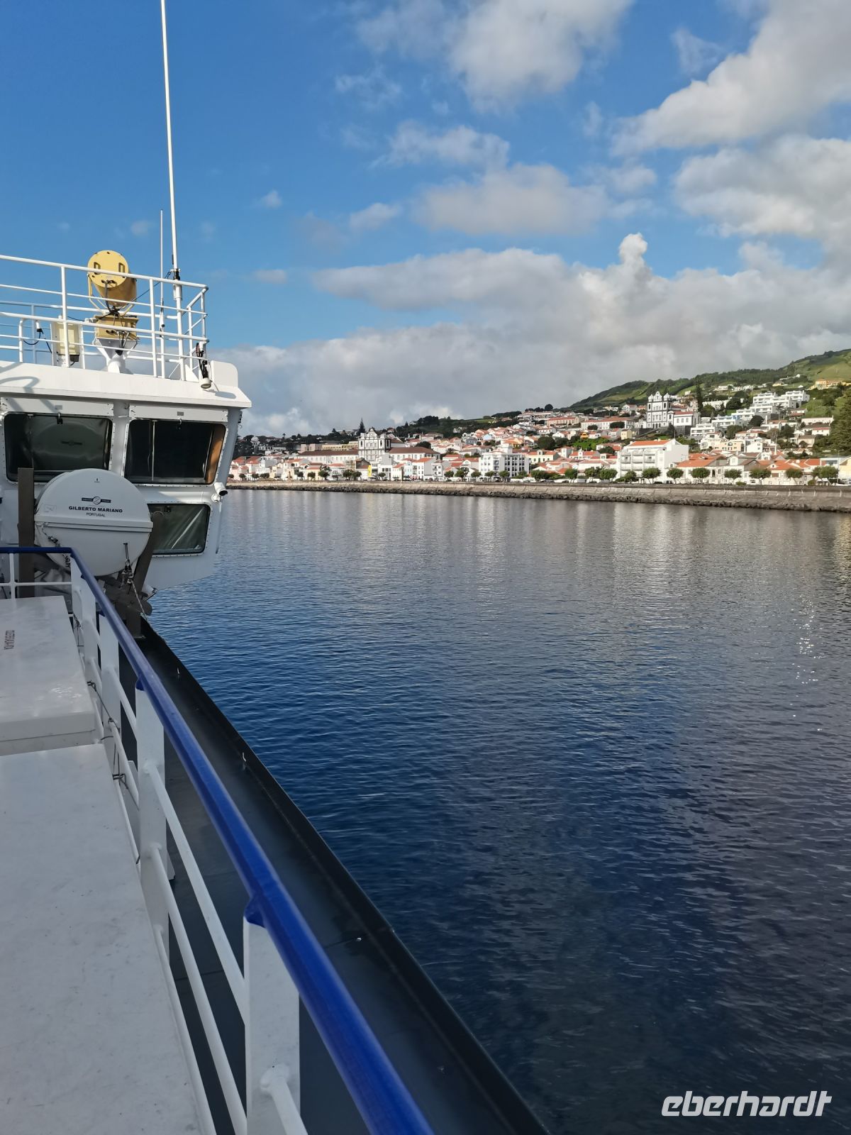 Wir erfahren, dass die Einwohner der Insel Terceira gerne feiern, so auch beim "Heiliggeist-Fest", das von Ostersonntag bis Pfingstsonntag gefeiert wird. Ganze 50 Tage dauert das fromme Danksagungsfest in den Dörfern, zu dem auch die Tradition des Stiertreibens gehört, wie uns ein großes Stier-Denkmal bestätigt. Auch Terceira ist von kleineren Inseln umgeben. Dazu gehören die "Ziegeninseln", die heute Naturschutzgebiet sind. Die Sicht ist hervorragend und wir genießen die Fahrt vorbei am Porto Judeu, wo wir eine der vielen Natur-Badestellen sehen. Unseren nächsten Halt machen wir in Sao Sebastiao, ein herausgeputzter Ort mit einem schönen Kirchplatz. Die "Igreja de Sao Sebastiao" ist eine der ältesten Kirchen der Azoren. Auf dem Platz unter Bäumen begrüßen uns freundlich die Einheimischen und wir lassen uns nieder für eine Kaffeepause. In Porto Martins sehen wir viele Ferienvillen und ein Naturschwimmbecken, das schon jetzt Lust auf unseren Badestopp in Praia da Vitória macht.