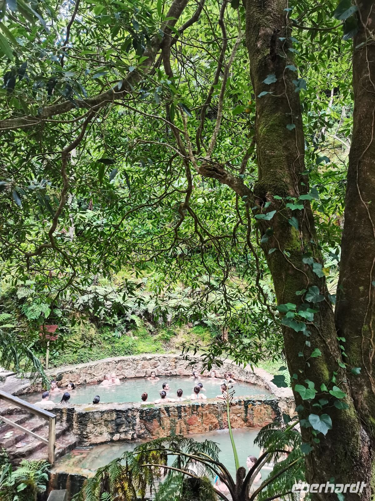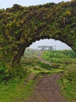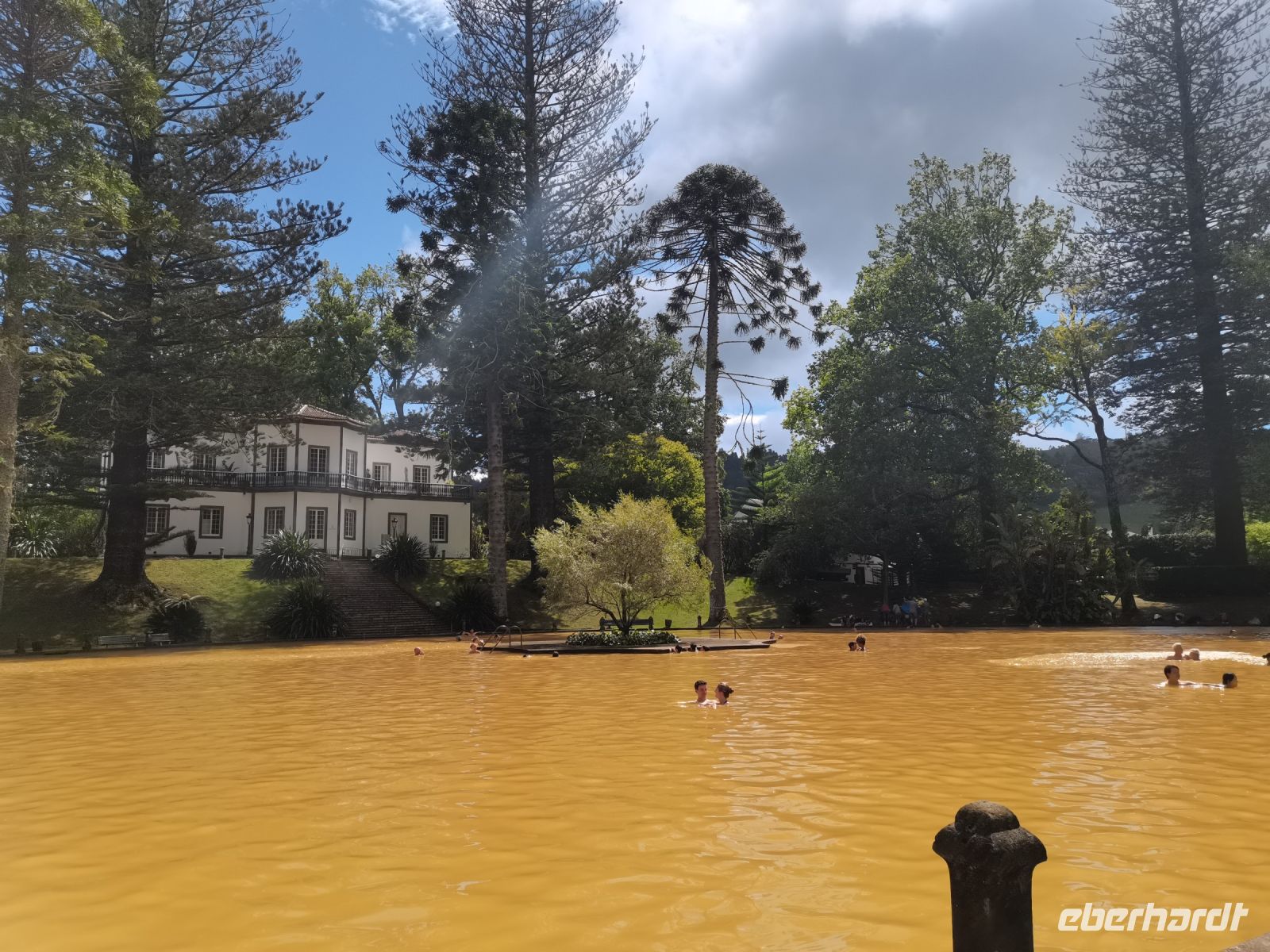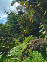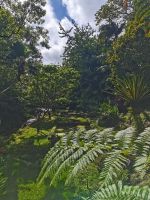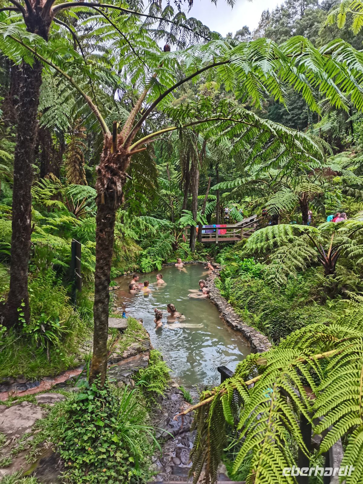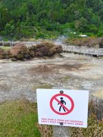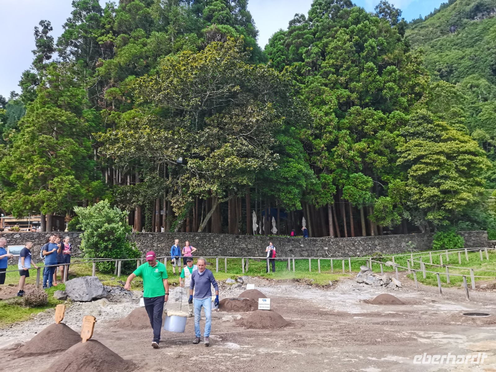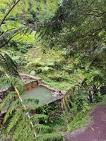 Nach diesen ersten Eindrücken geht unsere Fahrt weiter zum malerischen See "Lagoa das Furnas". Wir sind gespannt auf die Erdlöcher in denen für uns der Eintopf "Cozido das Furnas" gekocht wird. In Furnas sorgen 22 Quellen für Heilwasser verschiedenen Mineralgehalts. Einige sind kochend heiß und damit wie geschaffen zum Garen von Speisen, andere eignen sich für ein wohliges Bad, das auch bei uns noch auf dem Tagesprogramm steht. Tatsächlich erreichen wir die dampfenden Fumarolen kurz vor der Mittagszeit und beobachten die einheimischen Gastronomen, wie sie jeweils zwei große, mit einem weißen Tuch abgedeckte, Töpfe mit Eintopf aus den Erdlöchern ziehen und zu ihren Wagen bringen. Wir sind gespannt, was uns heute zum Mittagessen erwartet! Die Vertiefungen in der Erde sind namentlich gekennzeichnet von den Restaurants, die die jeweiligen Töpfe am Furnas-See garen lassen. So auch unsere Töpfe, die uns in einem kleinen Lokal im Örtchen Furnas aufgetischt werden. Auf dem Weg zum Bus bestaunen wir den Sicheltannenwald und die für uns ungewöhnlich abwechslungsreiche Natur, die die hohe Luftfeuchtigkeit und das Mikroklima der Inseln hervorbringt.