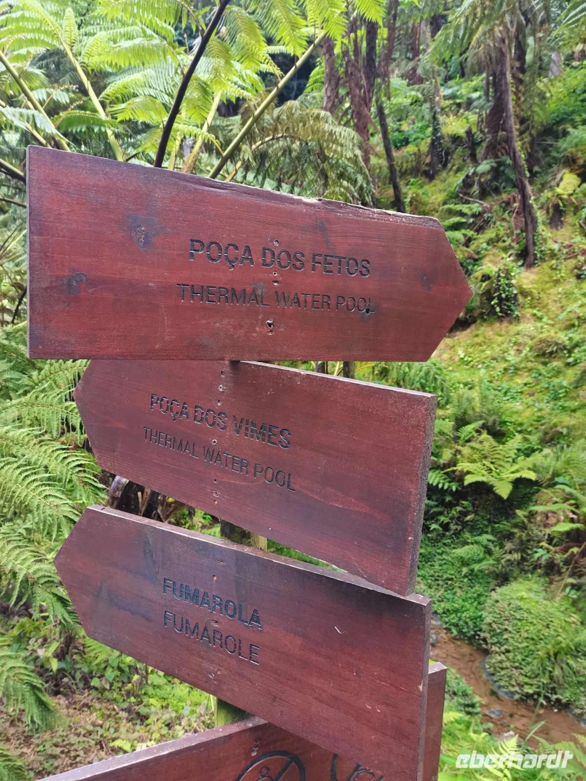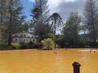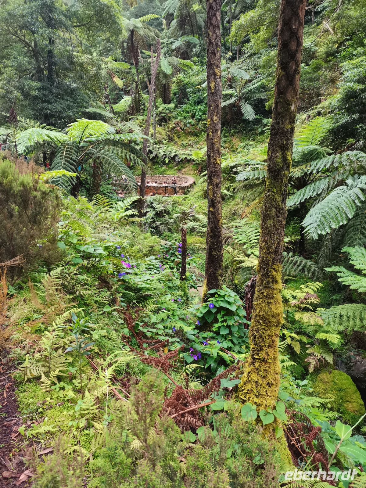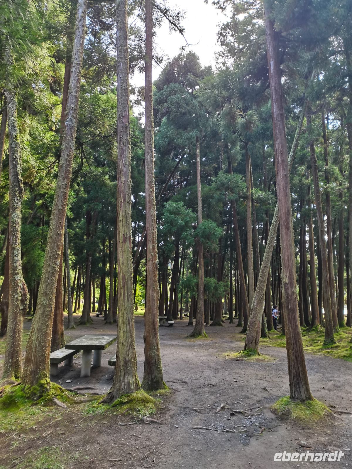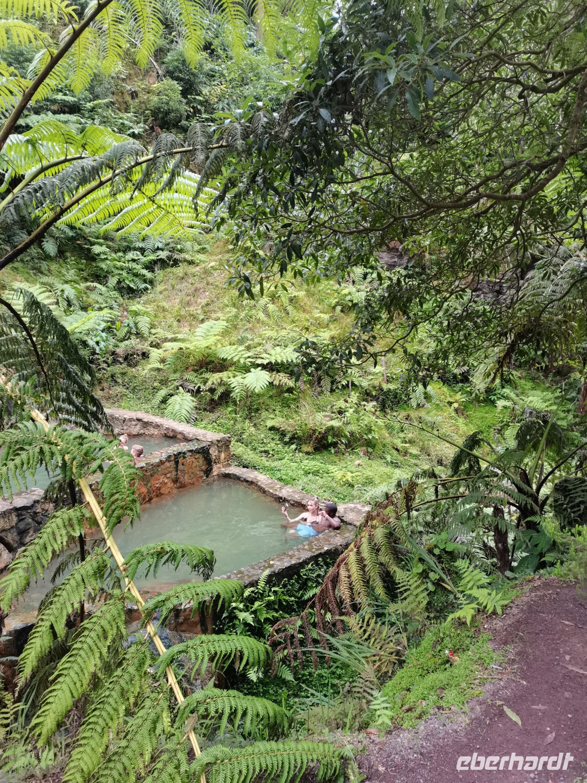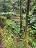 Nach diesen ersten Eindrücken geht unsere Fahrt weiter zum malerischen See "Lagoa das Furnas". Wir sind gespannt auf die Erdlöcher in denen für uns der Eintopf "Cozido das Furnas" gekocht wird. In Furnas sorgen 22 Quellen für Heilwasser verschiedenen Mineralgehalts. Einige sind kochend heiß und damit wie geschaffen zum Garen von Speisen, andere eignen sich für ein wohliges Bad, das auch bei uns noch auf dem Tagesprogramm steht. Tatsächlich erreichen wir die dampfenden Fumarolen kurz vor der Mittagszeit und beobachten die einheimischen Gastronomen, wie sie jeweils zwei große, mit einem weißen Tuch abgedeckte, Töpfe mit Eintopf aus den Erdlöchern ziehen und zu ihren Wagen bringen. Wir sind gespannt, was uns heute zum Mittagessen erwartet! Die Vertiefungen in der Erde sind namentlich gekennzeichnet von den Restaurants, die die jeweiligen Töpfe am Furnas-See garen lassen. So auch unsere Töpfe, die uns in einem kleinen Lokal im Örtchen Furnas aufgetischt werden. Auf dem Weg zum Bus bestaunen wir den Sicheltannenwald und die für uns ungewöhnlich abwechslungsreiche Natur, die die hohe Luftfeuchtigkeit und das Mikroklima der Inseln hervorbringt.