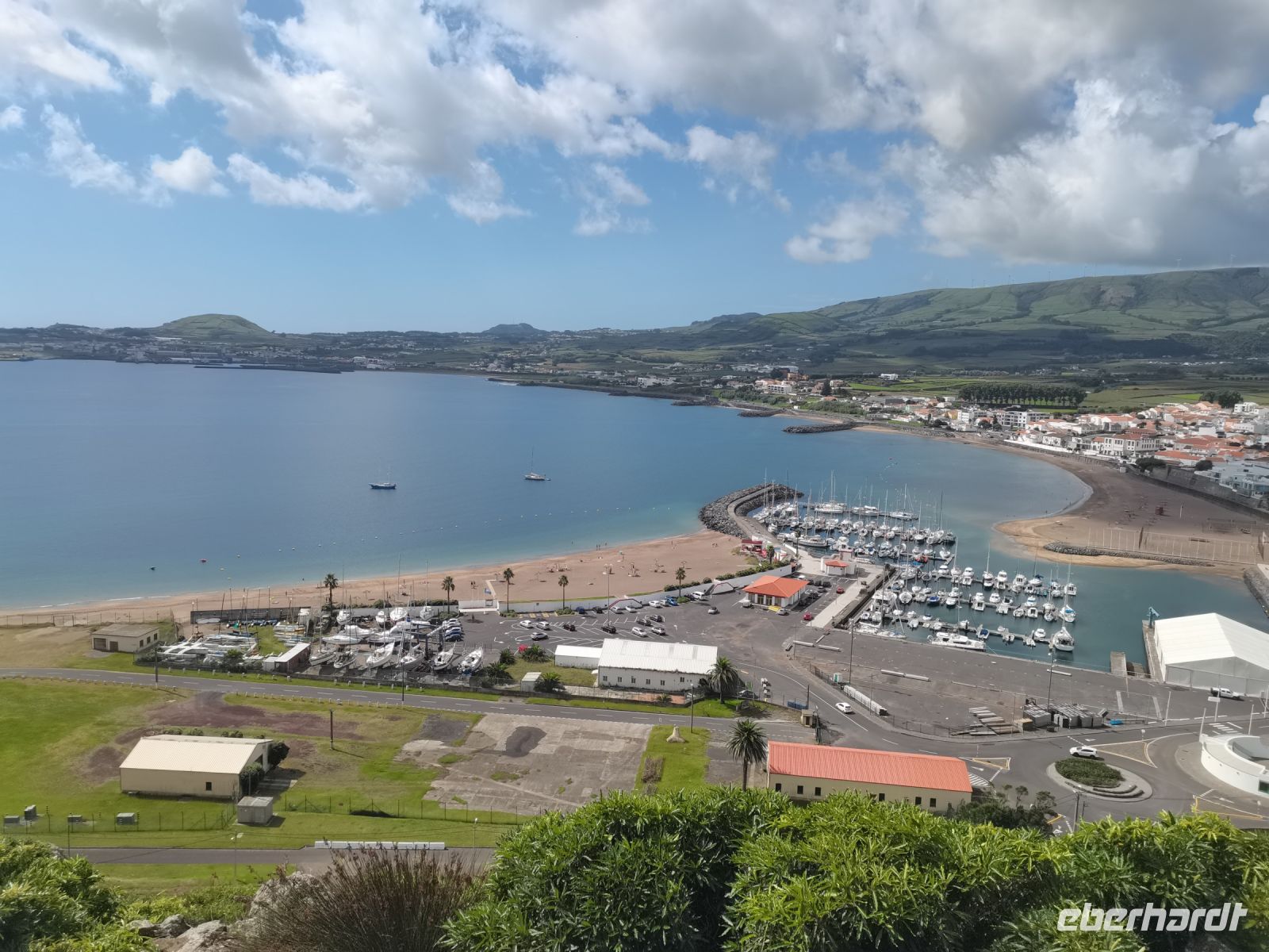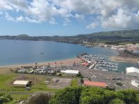 Zur Mittagszeit führt uns der Bus in die Stadt Praia da Vitória, Terceiras wichtigste Hafenstadt. Wir betrachten den Ort zunächst von oben und sehen die weite Bucht mit dem sandigen Badestrand. Ganz in der Nähe liegen die Uferpromenade und der Jachthafen. Wir haben Zeit für ein Bad im Atlantik und für Shopping in den kleinen Geschäften in der Fußgängerzone. Wir genießen die Mittagspause mit Meerblick, bevor wir zum nächsten Ziel fahren: Der Schlund des Vulkans "Algar do Carvao"!