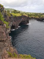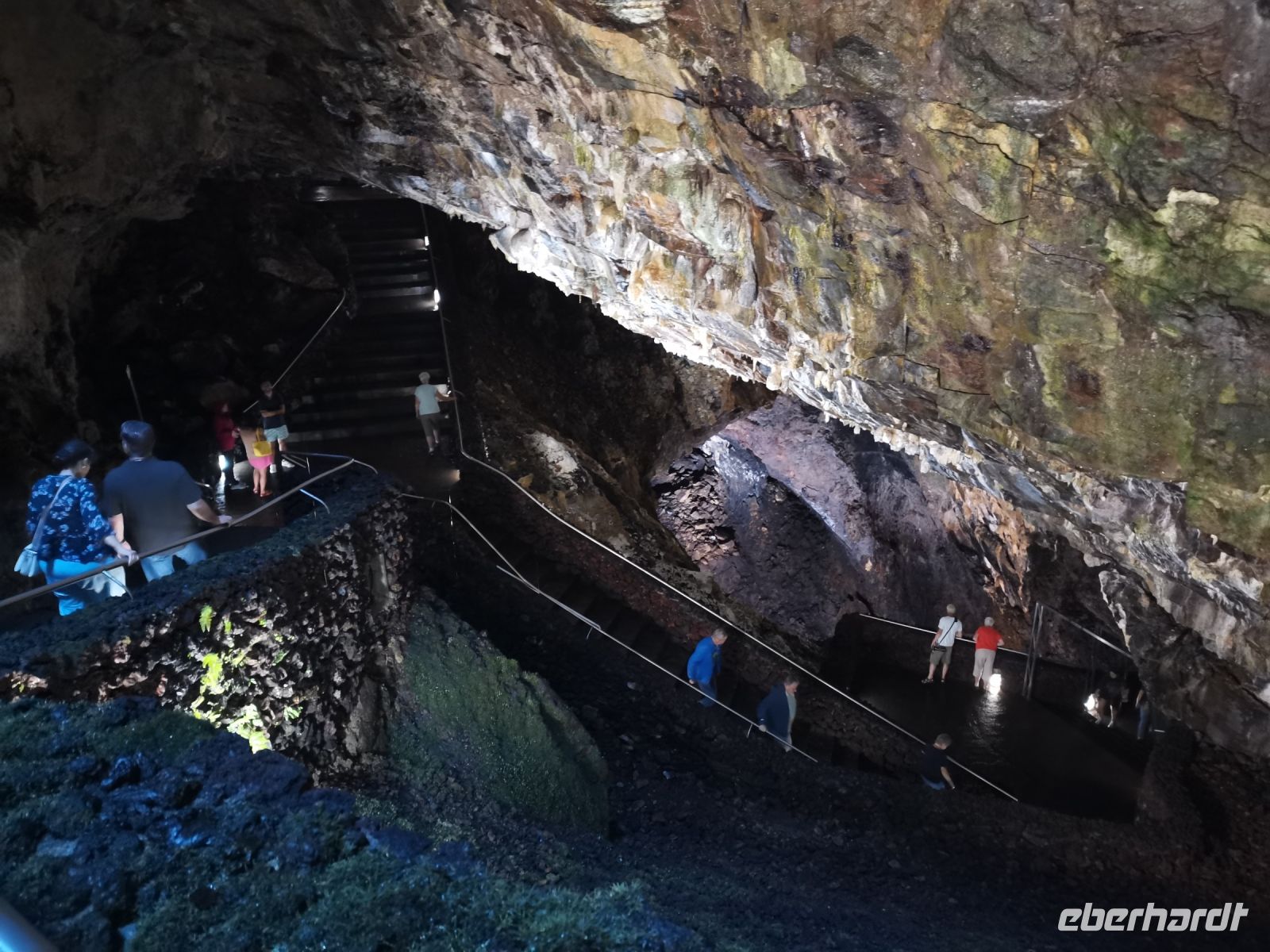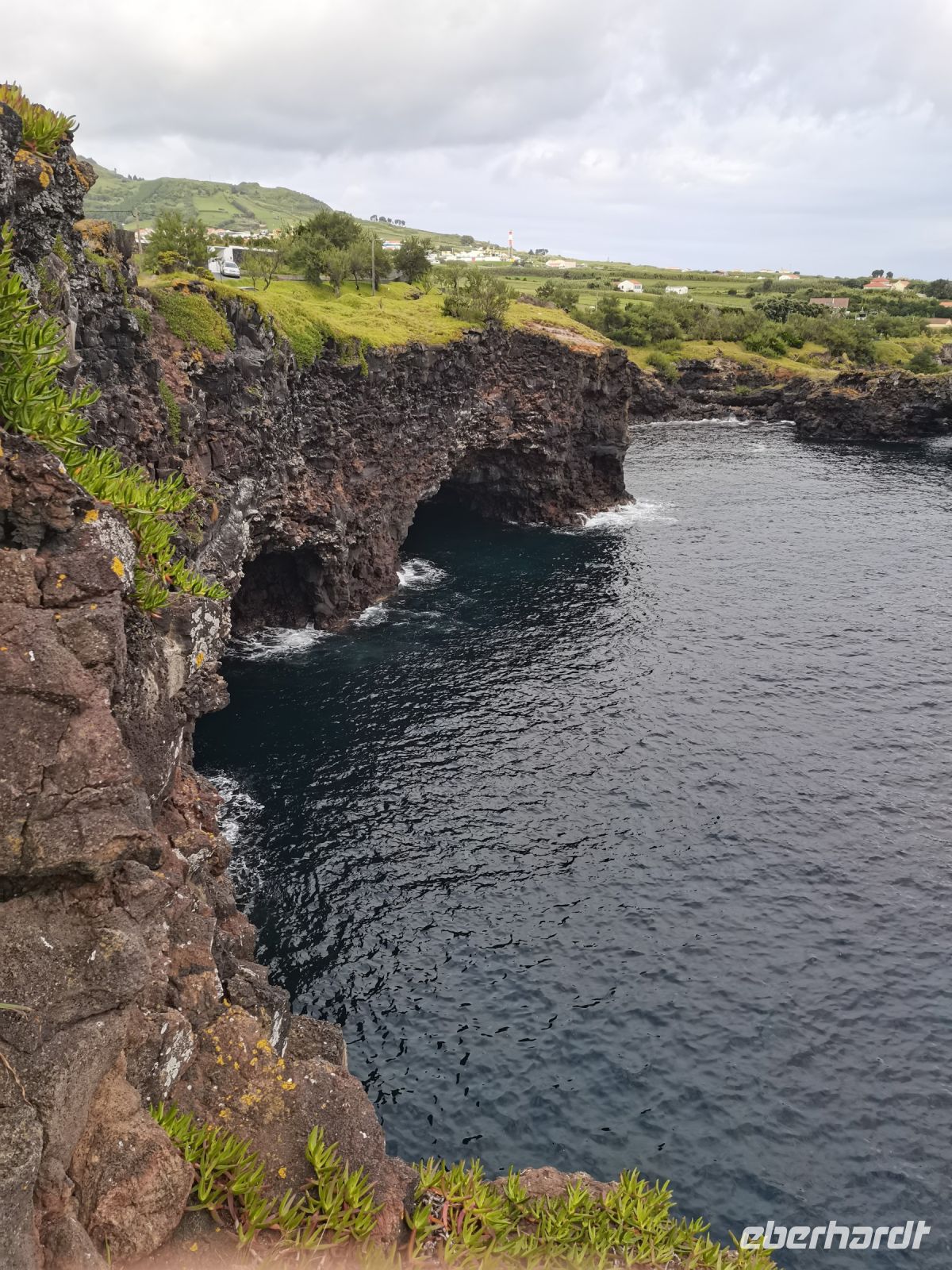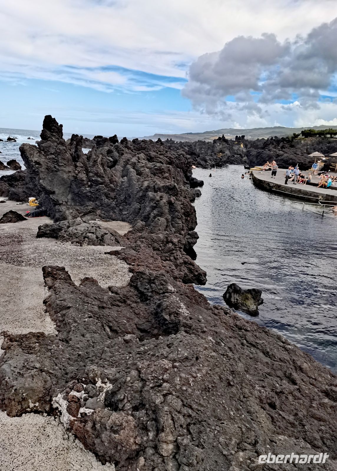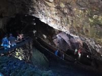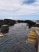 Gut gestärkt steigen wir wieder in den Bus, der uns später am Nachittag zum Schlot des erloschenen Vulkans "Algar do Carvao" bringen wird. Die Fahrt führt vorbei an der grünen Oberfläche des Kraters (Caldeira = Krater). Wie eine Patchwork-Decke sind die grünen Weideflächen auf dem saftigen Boden angeordnet. Von der Aussichtsplattform oberhalb des "Flickenteppichs" machen wir herrliche Fotos, auch wenn es etwas windig ist. Wir machen Halt bei einer Winzerfamilie in Biscoitos. Hier sehen wir, wie die Reben im Lavagestein angepflanzt werden. Das familiengeführte Museum zeigt die Weinproduktion und die historischen Geräte. Den Dessertwein der Produktionsfirma dürfen wir verkosten. Nach wenigen Minuten Fahrt erreichen wir die wunderschönen Naturbecken von Biscoitos. Die Treppen führen direkt ins Meer, das von Felsen umrahmt ist. Einige von uns springen kurz ins Wasser, es sieht zu einladend aus. Die Badestellen in den Naturbecken sind mit der blauen Flagge für ihre gute Wasserqualität ausgezeichnet. Weiter geht es zum nächsten Ziel: Abstieg in den Schlund des Vulkans "Algar do Carvao". Der letzte Ausbruch liegt 1700 bis 2100 Jahre zurück. Der 100 Meter tiefe erhaltene Hohlraum ist eine Seltenheit bei Vulkanen, von denen es nur drei auf der Welt gibt, die nicht eingebrochen sind. Wir steigen die bequemen Stufen hinab in ein Naturjuwel, es ist etwas feucht und kühl, aber wir haben Jacken dabei. Bis zu 336 Stufen bringen die Besucher auf mehrere Etagen des Inneren des Vulkans. Spektakuläre Einblicke bieten sich in eine Naturwelt mit einzigartigen Felsformationen, die es nur auf den Azoren das ganze Jahr zu erleben gibt.
