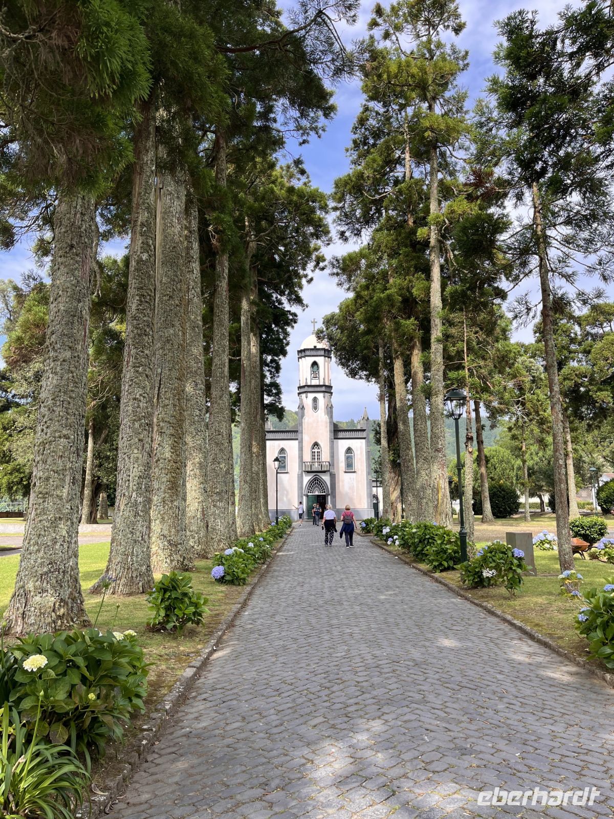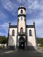 Nach einer ätiologischen Sage bestehen die Seen aus den Tränen zweier Verliebter. Eine Prinzessin musste sich von ihrem Geliebten, einem armen Hirten, der erfolglos um ihre Hand angehalten hatte, trennen, um einen Mann, den ihr Vater für sie ausgewählt hatte, zu ehelichen. Sie trafen und küssten einander ein letztes Mal dort, wo sich heute beide Seen berühren. Aus ihren Abschiedstränen entstanden die beiden Seen: der blaue aus den Tränen der blauen Augen der Prinzessin und der grüne aus den grünen Augen des Hirten. Wir sehen die Ruine eines nur kurz benutzten Hotels nahe des Aussichtspunktes. Nach einem kurzen Spaziergang im Dorf Sete Cidades mit seinen etwa 800 Einwohnern welches ein Rathaus, eine Primarschule, einen Dorfladen, ein Dorfgemeinschaftshaus und einen Fußballplatz hat fahren wir weiter um eine Ananas-Plantage zu besuchen. Die Pfarrkirche des Ortes (São Nicolao), zu der eine Allee führt, wurde 1857 im Stil der Neogotik erbaut. In der Ortsmitte wurde vor dem Dorfgemeinschaftshaus ein Pavillon errichtet, gegenüber befindet sich die Heilig-Geist-Kapelle von 1996. Jetzt geht es weiter entlang der Südküste zu einer Ananas-Plantage, wo wir sehen wie die Ananas angebeut wird. Auf em Weg dahin durchfahren wir wohl eine der schönsten Hortensien-Straßen der Insel. Hier kosten wir auch die leckeren Früchte - pur oder als Cocktail.