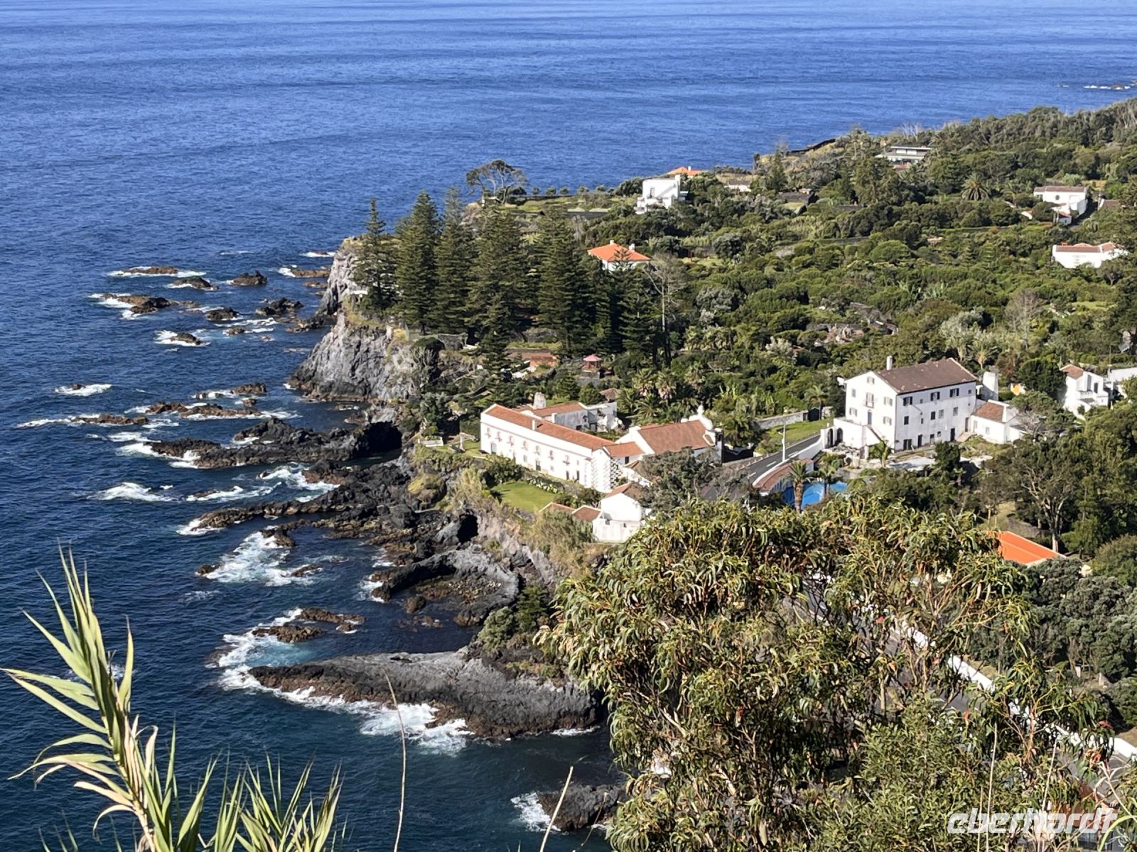 Nach einem ausgiebigen Früchstück gehen wir auf unsere heutige Tour und erkunden die "grüne Insel" São Miguel. Zuerst fahren wir mit Frederik von Ponta Delgada an der Südküste entlang nach Vila Franca do Campo, der ersten Hauptstadt der Insel Sao Miguel. Am Aussichtspunkt "Miradouro do Pisao" nahe der Ortschaft Agua de Pau geniessen wir den herrlichen Blick auf das Meer und die wunderbare Landschaft.Weiter geht die Fahrt nach Vila Franca do Campo. Der Ort liegt an der Südküste der größten Azoreninsel São Miguel. Dem Ort im Atlantik vorgelagert ist die kleine Vulkaninsel Ilhéu de Vila Franca do Campo, deren Kraterwand an der Nordseite zur See hin durchbrochen ist, so dass Meerwasser einfließen kann und sich Sand abgelagert hat. So ist ein natürliches Schwimmbecken entstanden, dessen Tiefe bei Flut kaum mehr einen Meter übersteigt. Während der Sommermonate fahren Boote von Vila Franca zum Ilheu und bringen Erwachsene und Kinder für einen Badetag dorthin. Gegenüber der Insel liegt die Praia da Vinha da Areia.