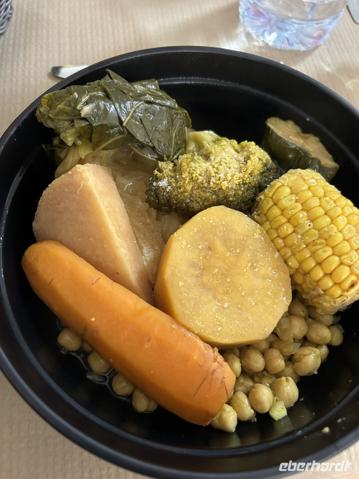 Ja, richtig gelesen! Es handelt sich hierbei um Cozido das Furnas. Ein Eintopf aus Hühnchen, verschiedenen Gemüse und nicht zu vergessen Blutwurst, welcher 6 Stunden lang in den Erdlöchern Furnas vor sich hin brodelt.