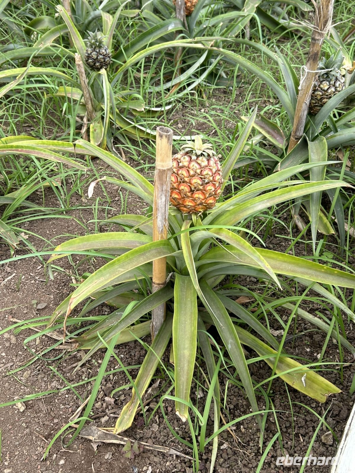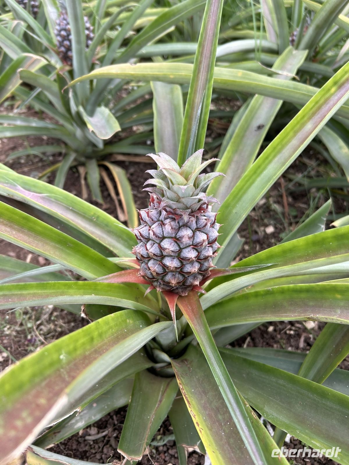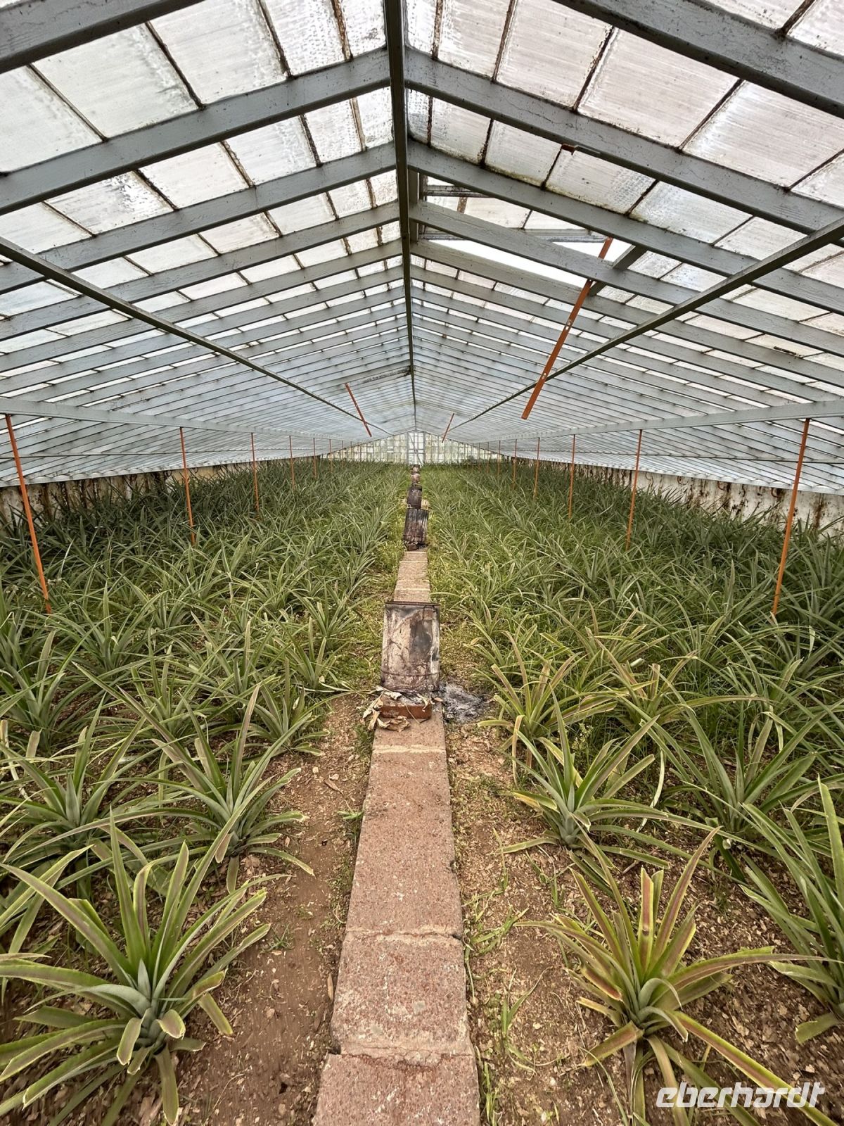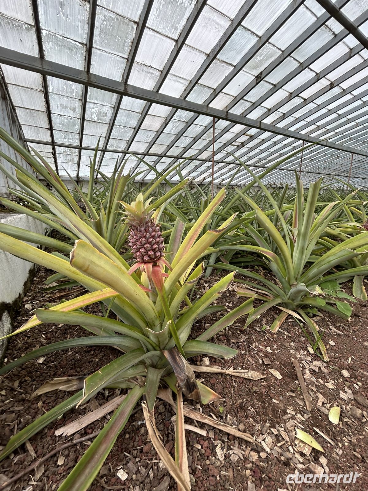 Gezüchtet werden die Pflanzen in weiß gestrichenen Gewächshäusern, die die unterschiedlichen Wachstums- und Lebensphasen der Ananasfrucht zeigen.