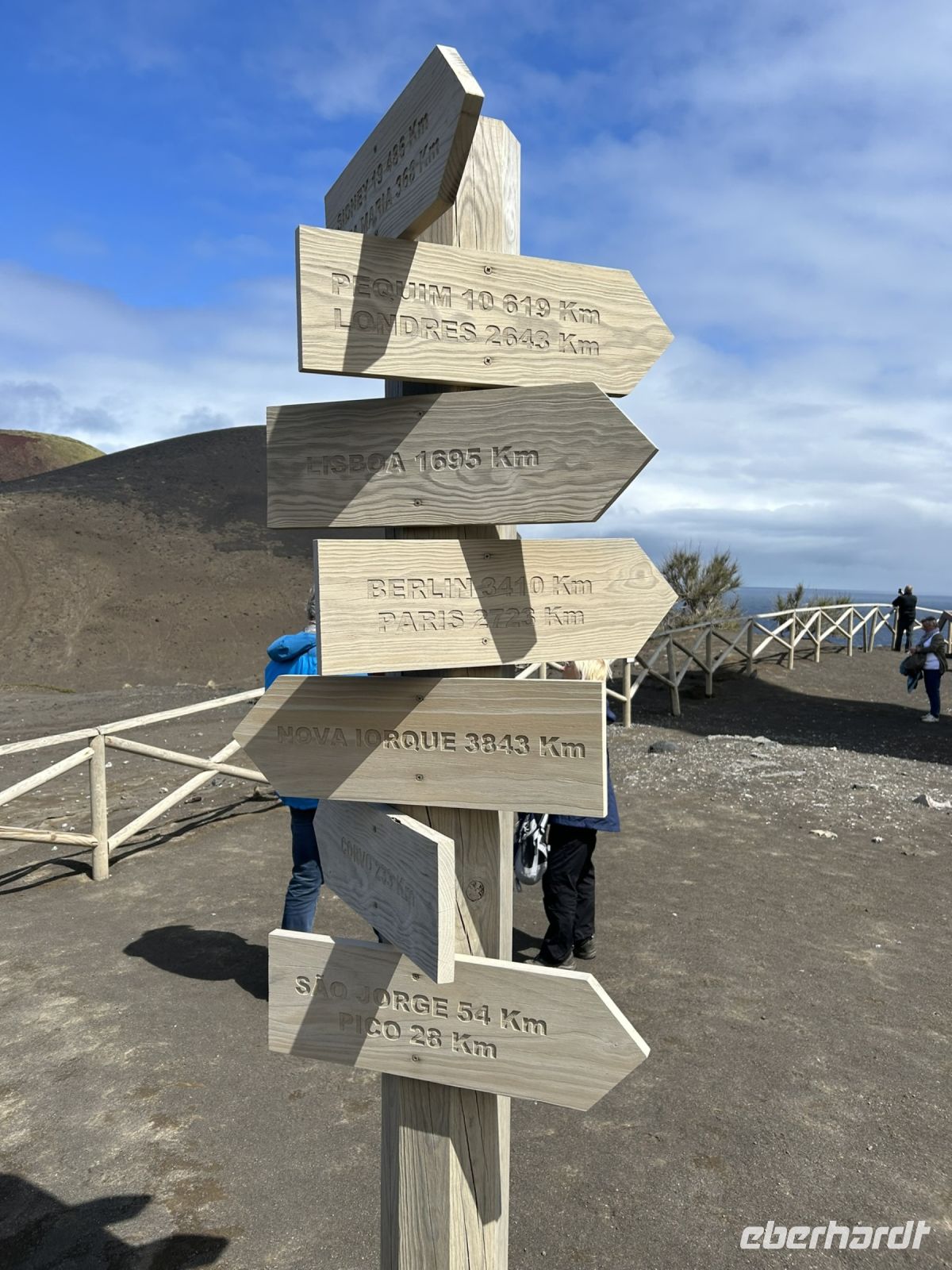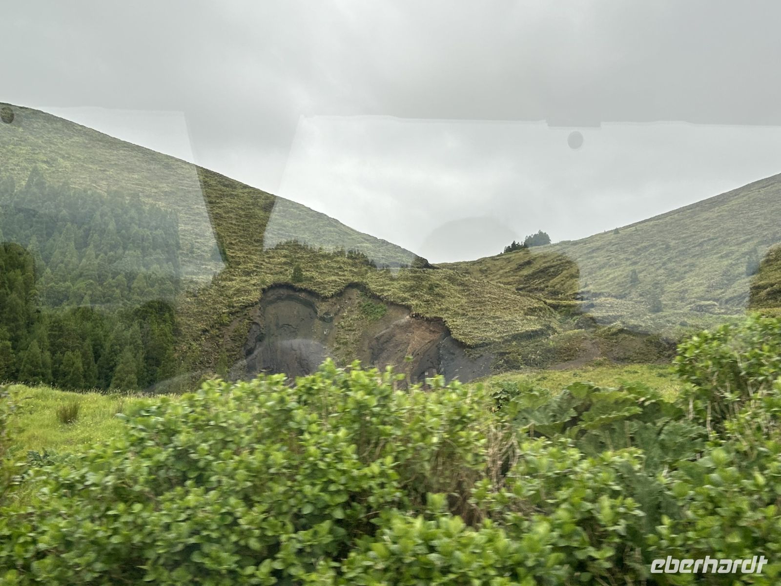 Die Caldeira hat eine vollkommen kreisförmige Form und einen ungefähren Durchmesser von 2 km von Rand zu Rand mit einer Tiefe von 400 Metern. Leider blieb uns nichts anderes übrig, als uns dieses Spektakel wieder auf den Infotafeln anzuschauen, denn auch bei dieser Besichtigung hing der Nebel so tief, dass wir absolut gar nichts gesehen haben.