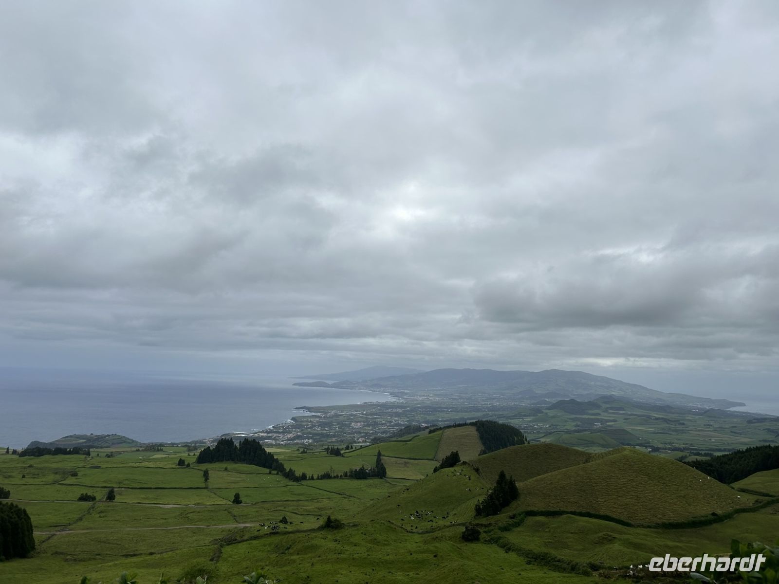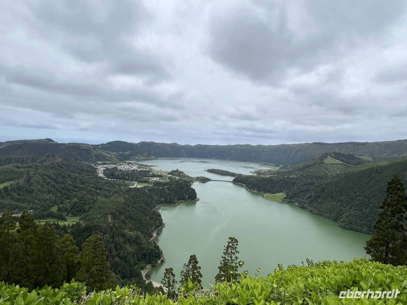 Wir haben zwar keine klare Sicht vom Königsblick aus aber dennoch sehen wir den gigantischen Einsturzkrater des Sete Cidades mit den beiden Seen „Lagoa Verde“ und „Lagoa Azul“ eines der 7 Naturwunder Portugals.