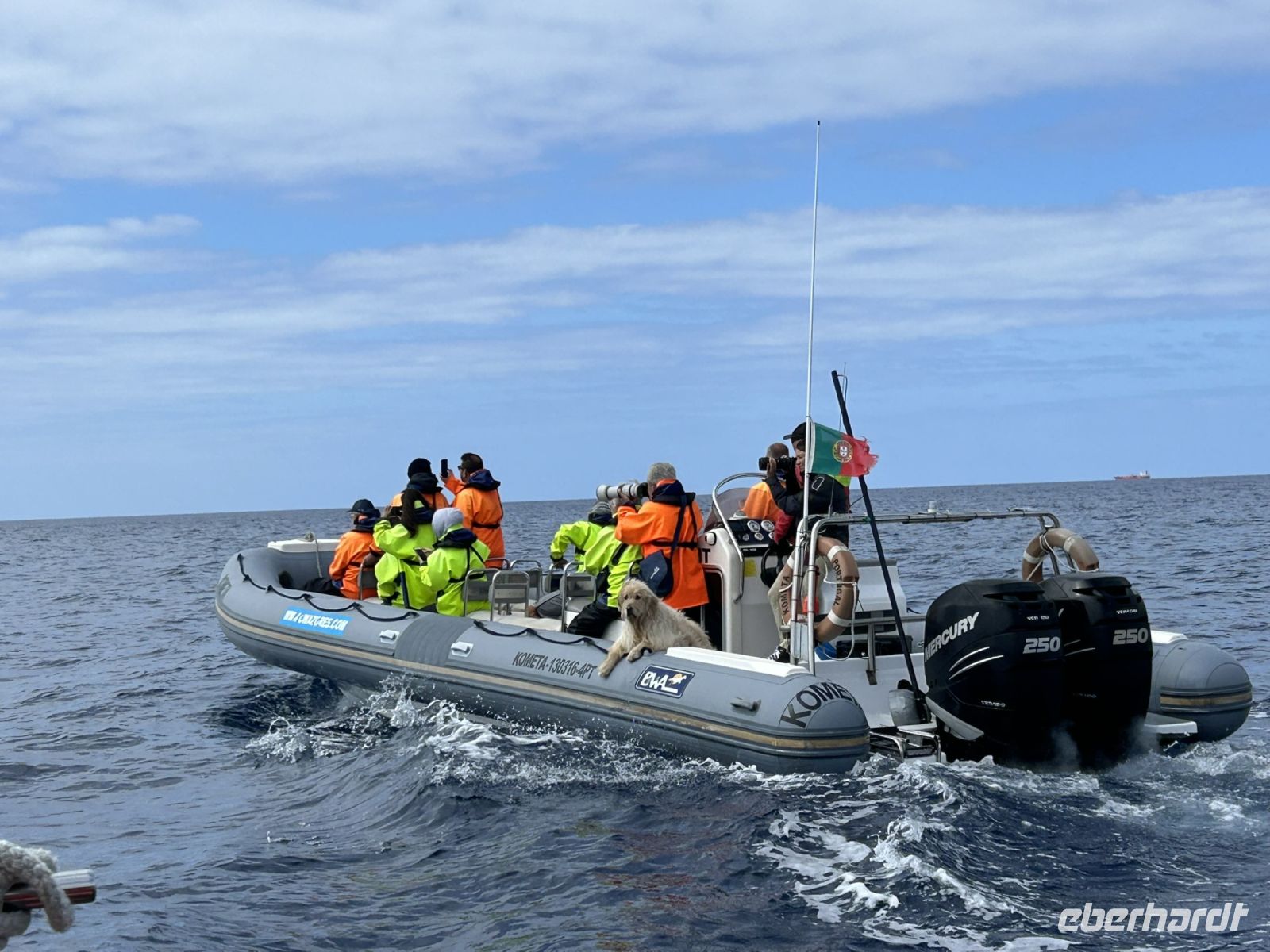 Nach einer kurzen Einweisung steigen wir in die Zodiacs, welche uns hoffentlich ganz nah an die Meerestiere bringen werden.