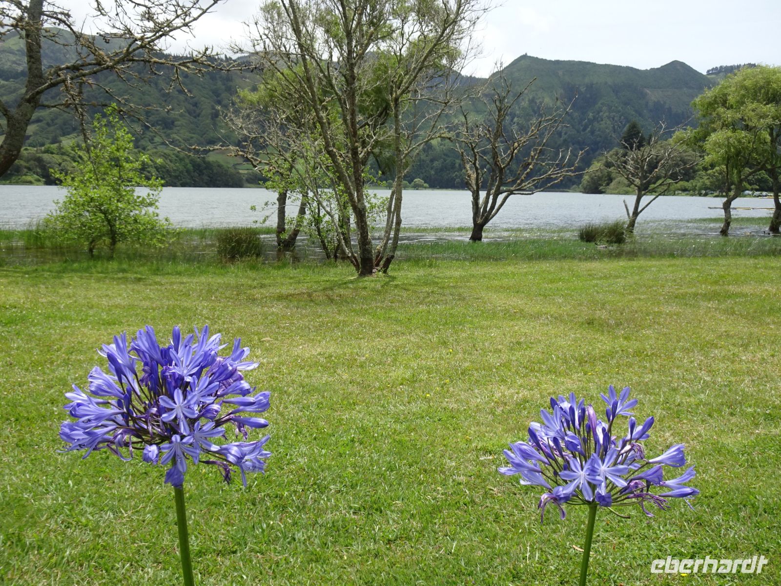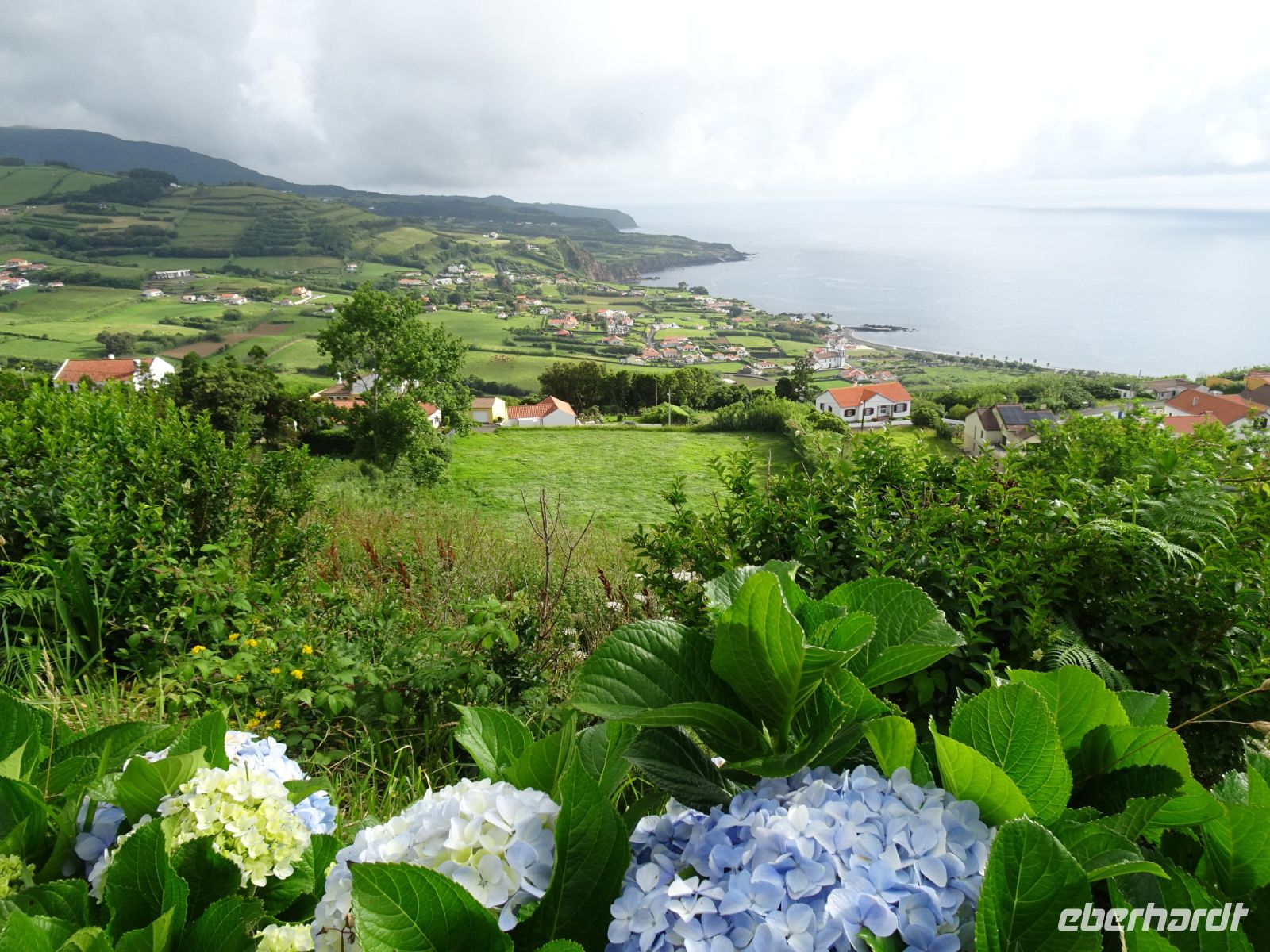 Das nächste Ziel war der sogenannte "Königsblick", der anlässlich des Besuches von König Carlos I. im Jahre 1901 angelegt wurde. Wunderbare Hortensien - wie überall auf der Insel und besonders entlang der Straßen - und am Boden der Caldera der Ort Sete Cidades mit den nur durch eine Brücke getrennten Seen in den Farben blau (Azul) und grün (Verde).