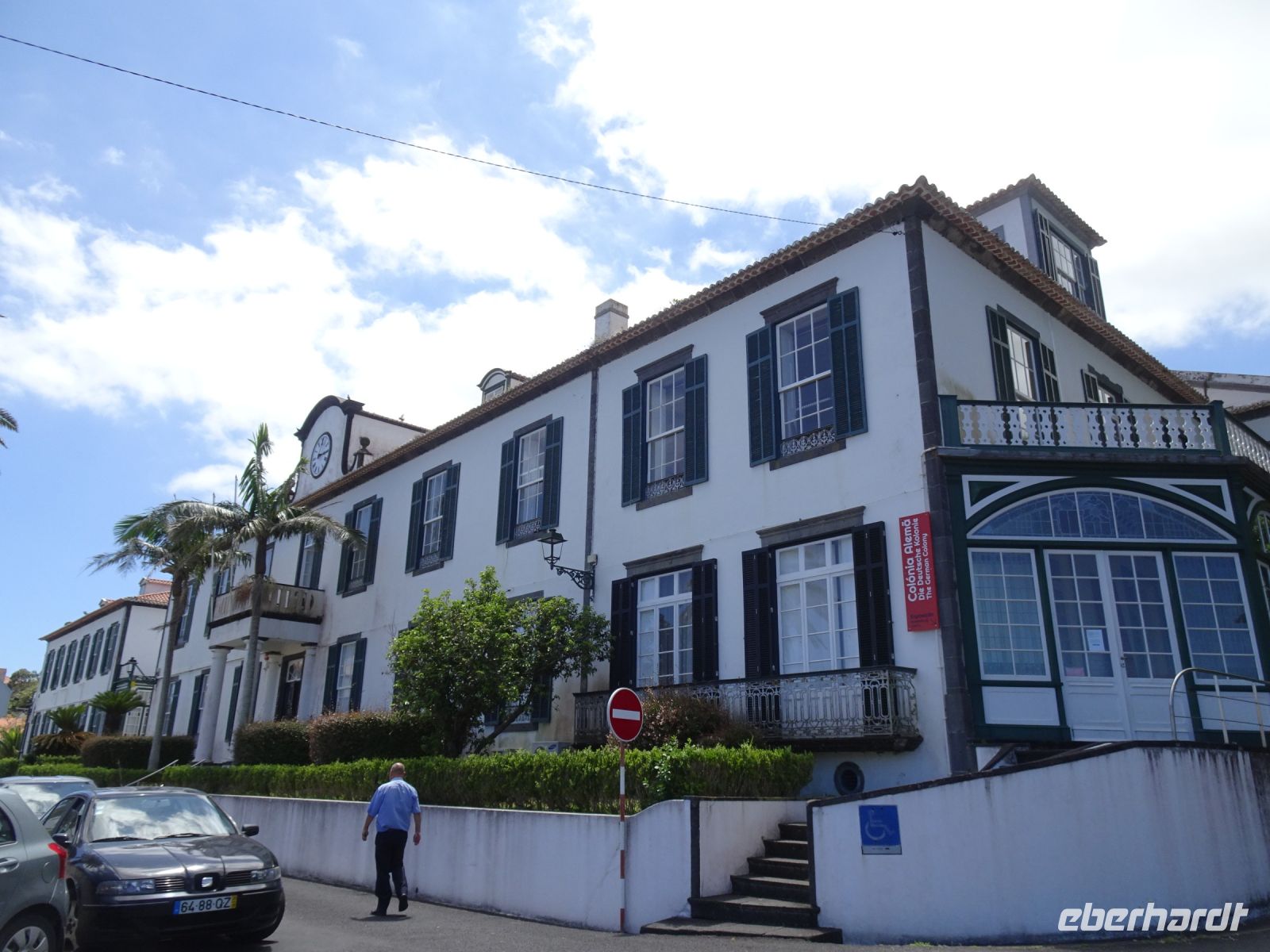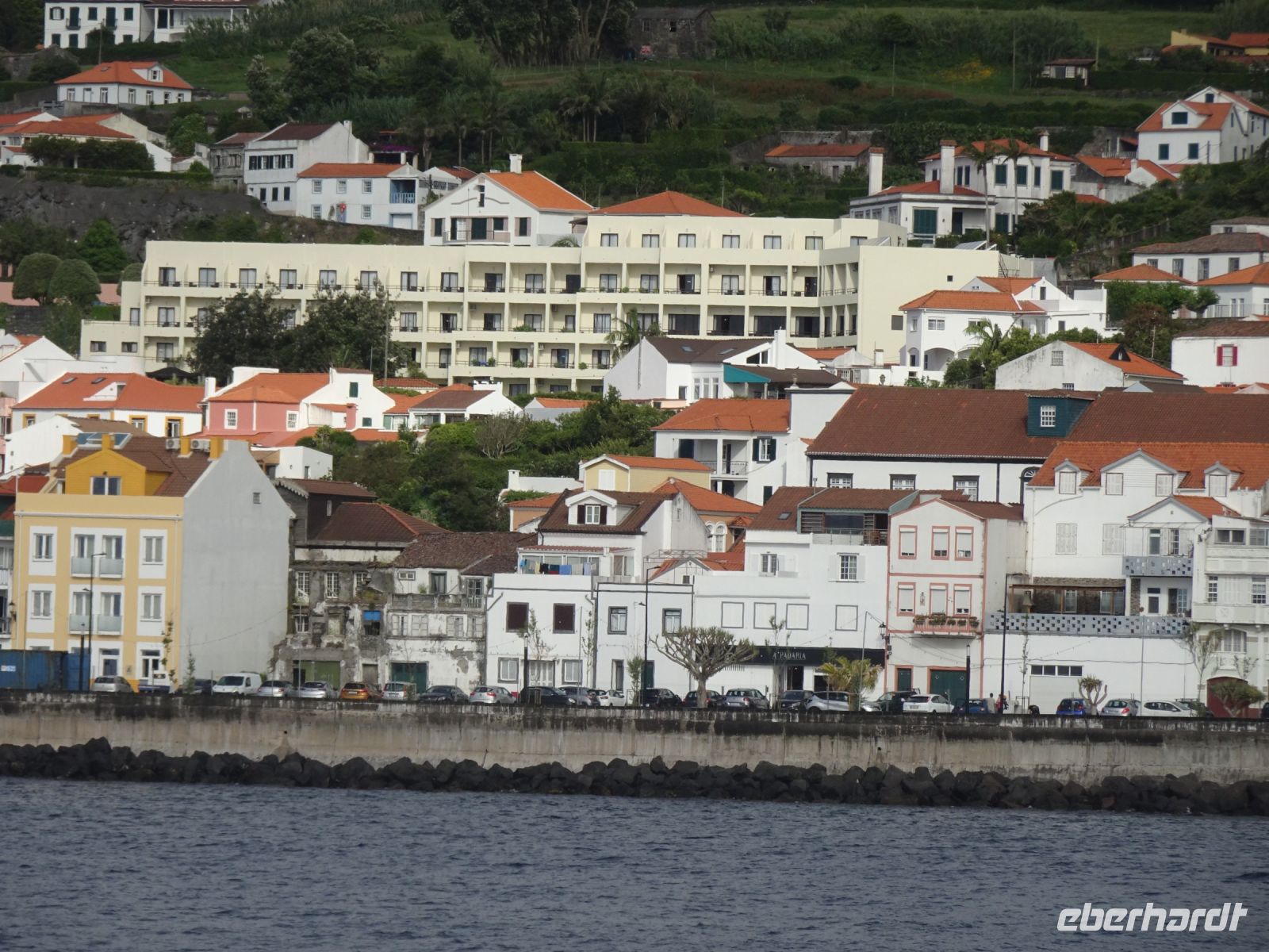 Am kleinen Inselflughafen erwartete uns bereits unsere örtliche Reiseleiterin Anja. Gemeinsam ging es zu unserem Hotel "Horta". Alle Zimmer des etwas erhöht am Berg liegenden Hotel hatten wunderbaren Blick zum Hafen und der Altstadt. Nach dem Einchecken und einer kleinen Ruhepause lud uns Anja zu einem Ortsrundgang ein. Erste Station war ein Gebäude der " Deutschen Kolonie", die hier zu Beginn des 20. Jahrhunderts im Zusammenhang mit der Bedeutung Hortas als Relaisstation für Telefonie- und Telegrafiekabel zwischen Europa und Nordamerika eingerichtet wurde. 17 Mitarbeiter der in Emden ansässigen Firma arbeiteten und lebten hier. Für Interessenten der Entwicklung der interkontinentalen Nachrichtentechnik ist die Beschäftigung mit der Entwicklung in Horta ein sehr zu empfehlender Aspekt. Aber unser Ortsrundgang ging weiter: ehemalige Jesuitenkirche, ehemaliges Kloster ( heute Senioren-und Pflegeheim), repräsentative Geschäftshäuser, das Parlamentsgebäude der Azoren und natürlich der Yachthafen waren weitere Stationen. Interessant ist, dass viele Gebäude durch Erdbeben in den Jahren 1926 und 1998 Schaden genommen hatten, die heute aber weitgehend beseitigt sind.