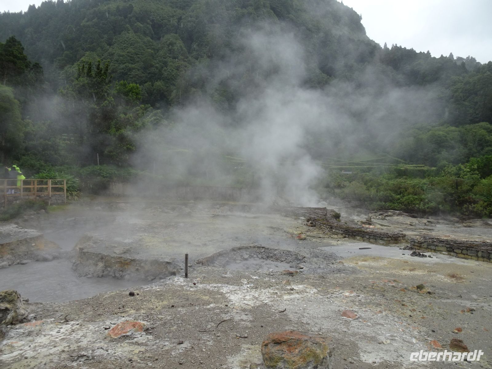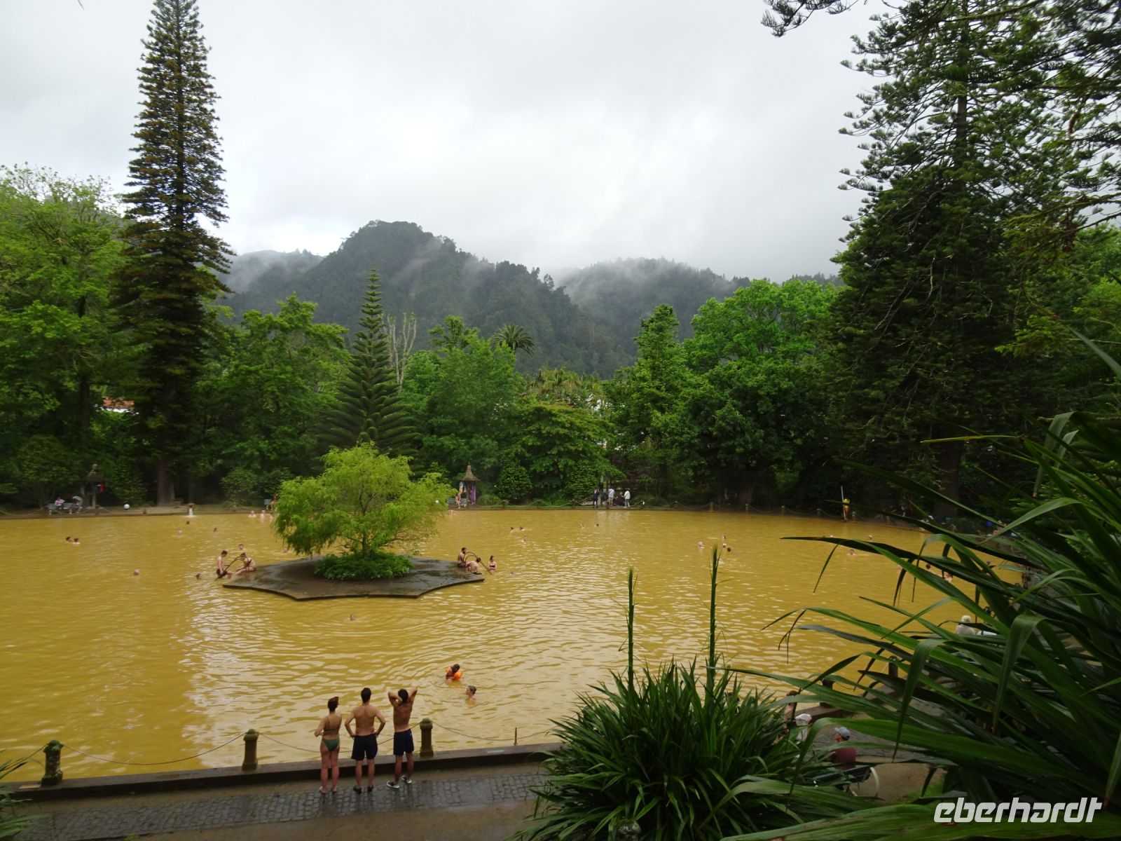 Weiter ging es dann nach Furnas, einem durch heiße Quellen und dampfende Erdlöcher geprägten Ort, der sich vor allem seit dem Ende des 18. Jahrhundert, vor allem durch Orangenhandel vermögend gewordenen Kaufleute, zu einem Kurort entwickelte. Imposant auch die im Ergebnis vulkanischer Tätigkeit geprägten Ringstrukturen, den sogenannten Calderas (= Kessel), mit heute oft mächtigen Seen in der Mitte. Unser konkretes Ziel war der dem heutigen Wellnesshotel (gegründet 1935 durch die einflussreiche Familie Bensaúde) angrenzende Botanische Garten Terra Nostra mit seinem von einer eisenhaltigen 30 Grad heißen Quelle gespeisten Naturthermalpool. Die Mehrzahl der Reisegruppe unternahm mit unserem Reiseleiter José einen Rundgang durch den Botanischen Garten ( Ursprünge des Gartens sind bis 1780 zurückzuverfolgen), einige Mutige nahmen nach einem kurzen Rundgang dann ein Bad im ockerfarbigen Bassin. Beeindruckend für alle.