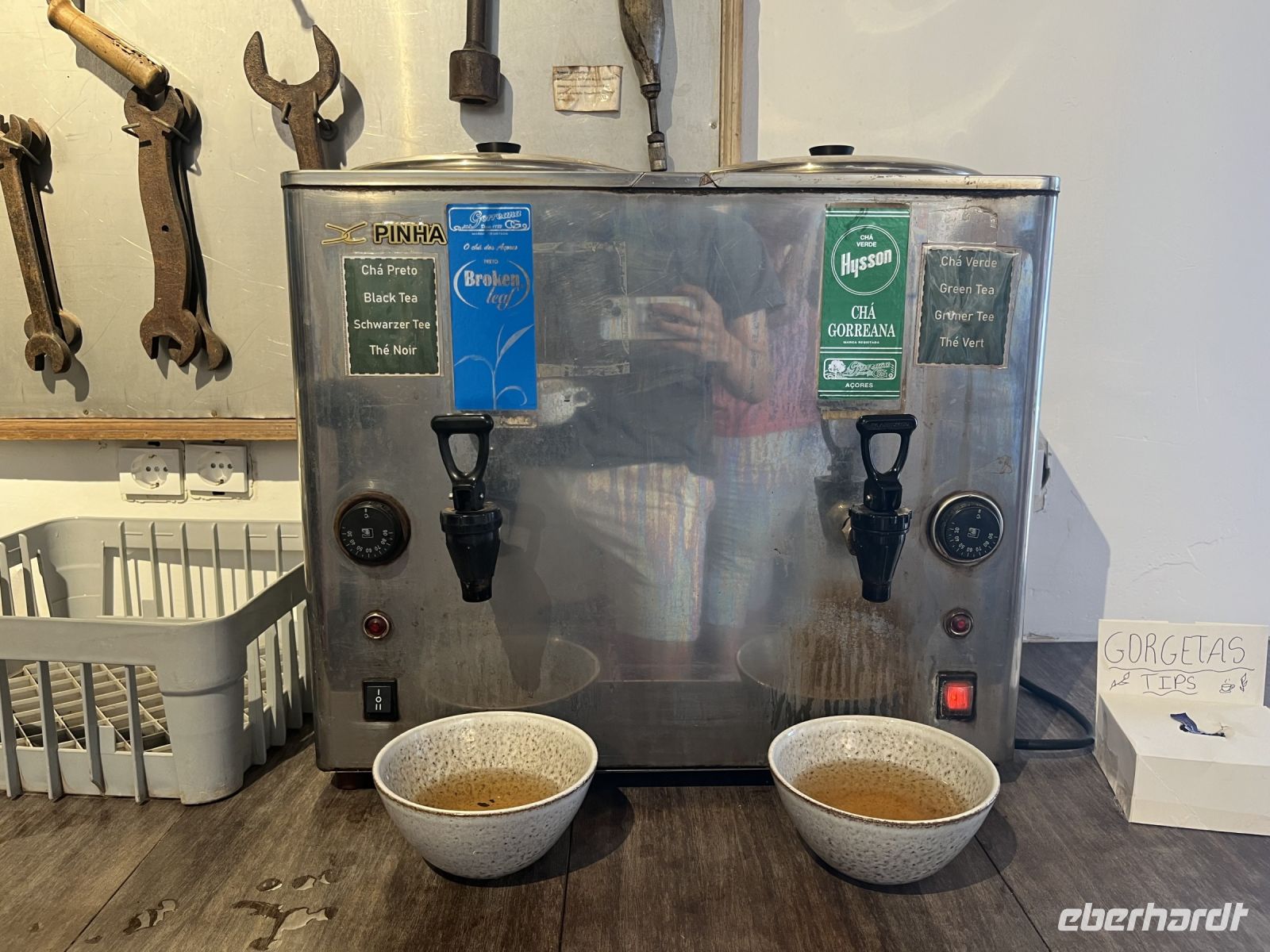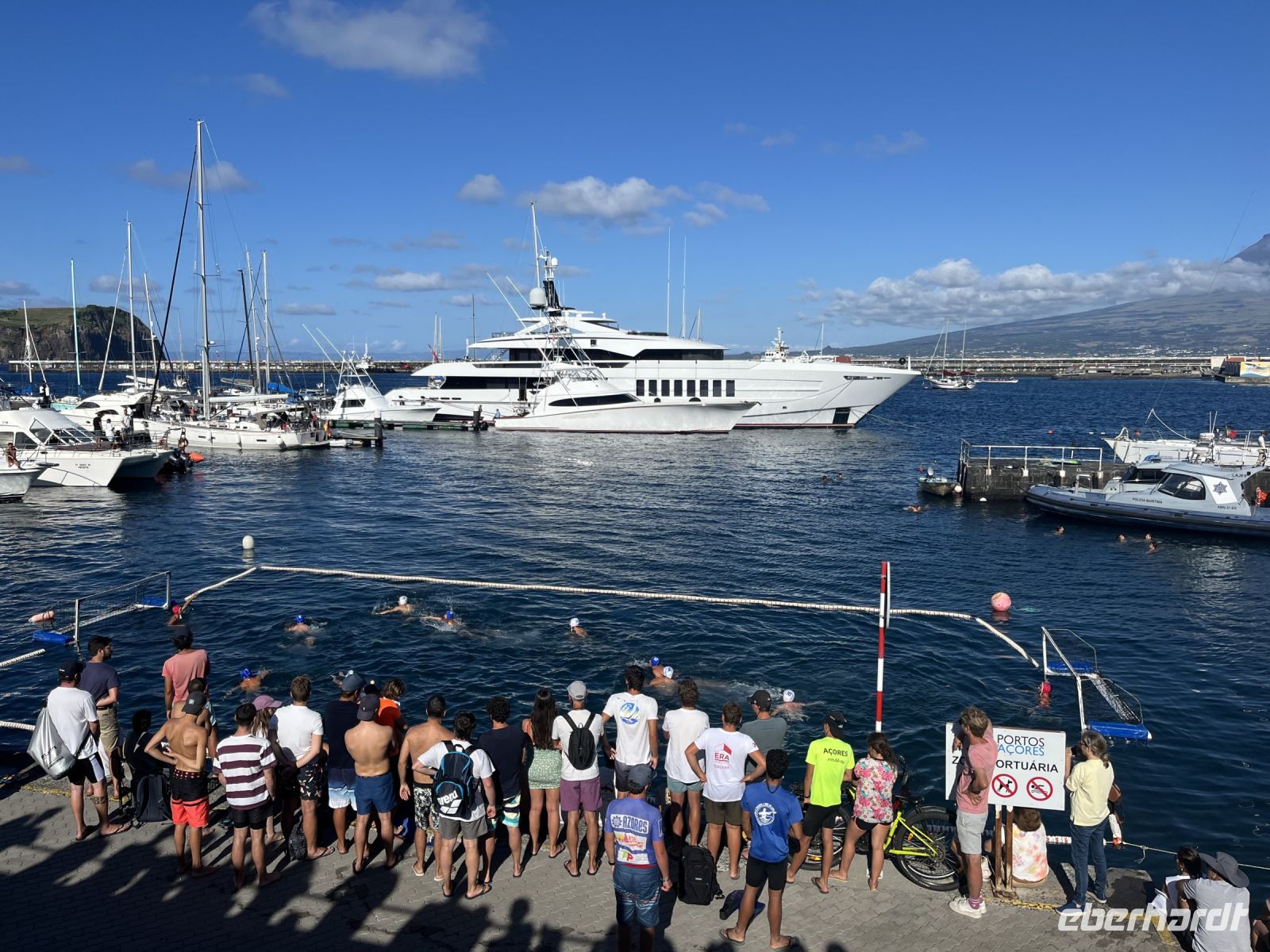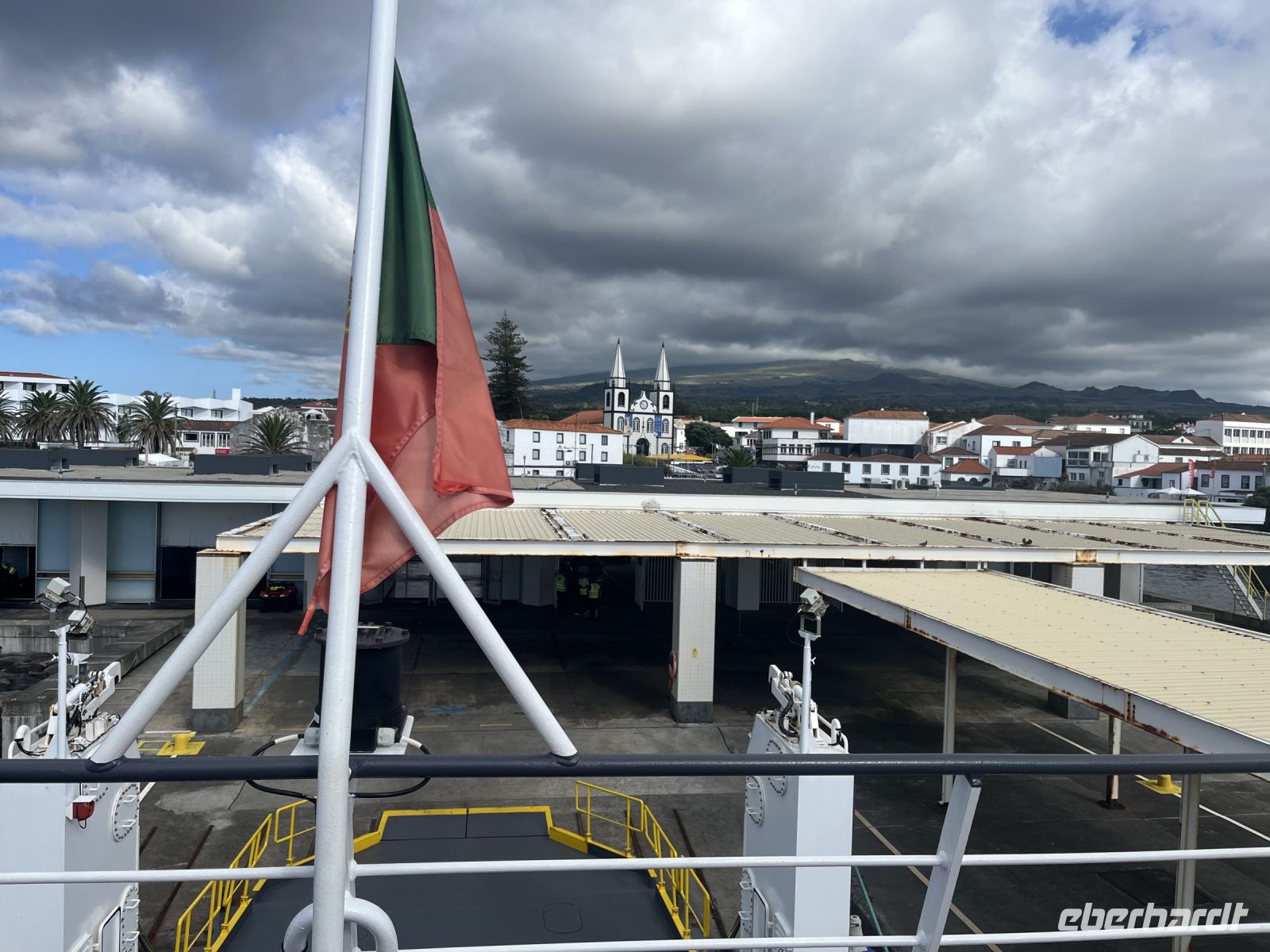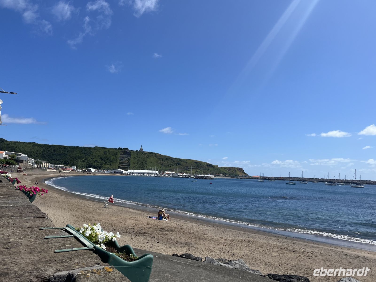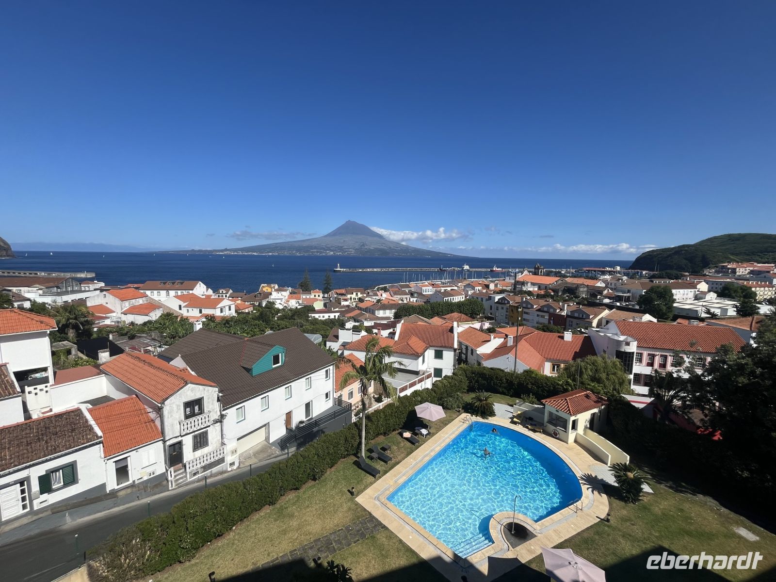 Heute können wir ausschlafen oder den Morgen nutzen, um noch ein letztes Bad im Atlantik zu nehmen. Um kurz vor 11 holen uns Serafina und Carlos vom Hotel ab und bringen uns zum Flughafen von Ponta Delgada. Am Morgen haben wir die Nachricht bekommen, dass wohl endlich der letzte Koffer eingetroffen sei und so können wir pünktlich zum Weiterflug nach Faial endlich das letzte vermisste Gepäck abholen, womit manche schon gar nicht mehr gerechnet haben. Pünktlich fliegen wir nach Faial und während des Anflugs auf Horta bietet sich uns ein fantastischer Blick auf den wolkenfreien Pico. Bei der Ankunft erwartet uns schon unsere Reiseleiterin, mit der wir die nächsten Tage die Inseln Faial und Pico entdecken werden. Wir fahren zum Hotel und stellen unsere Koffer ab, bevor wir einen ersten kleinen Stadtspaziergang unternehmen. Anja erzählt uns viele interessante Informationen und Fakten während wir vorbei am Parlament der Azoren, der alten deutschen Telegrafenstation, dem Markt und dem Hafen von Horta spazieren. Am Abend haben wir einen Tisch in der berühmten Segler-Bar "Peters Café Sport" reserviert. Das Café ist für seine Geschichte, für seine Gin Tonics und seinen Schokoladenkuchen bekannt und gilt als Standard-Zwischenstopp für Weltumsegler. Der Innenraum ist sehr schön eingerichtet, mit vielen Flaggen aus der ganzen Welt. Bei gutem Fisch und einigen Gin-Tonics lassen wir den Abend hier gemütlich ausklingen.