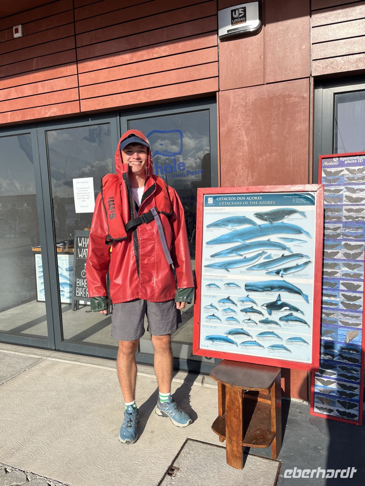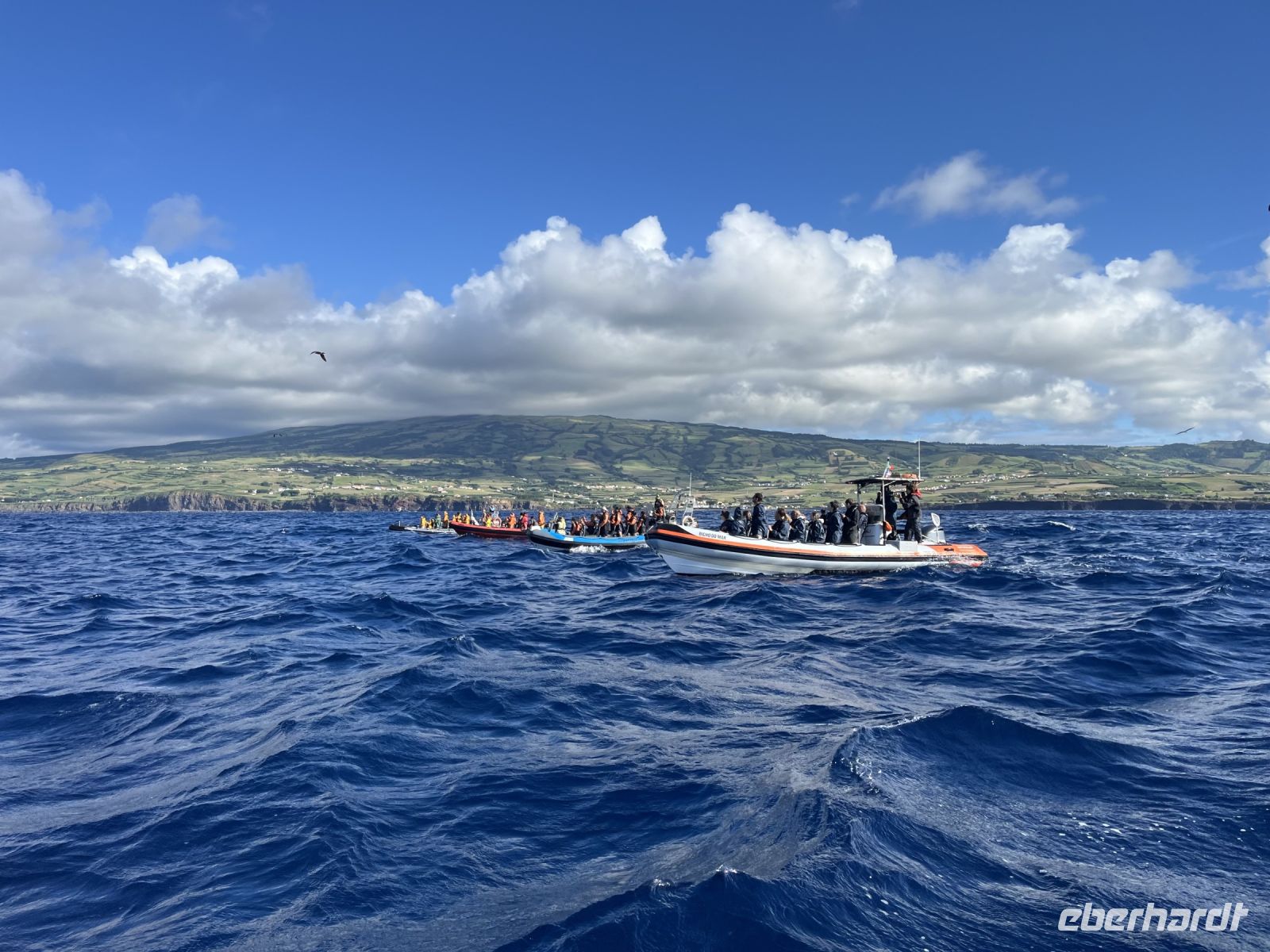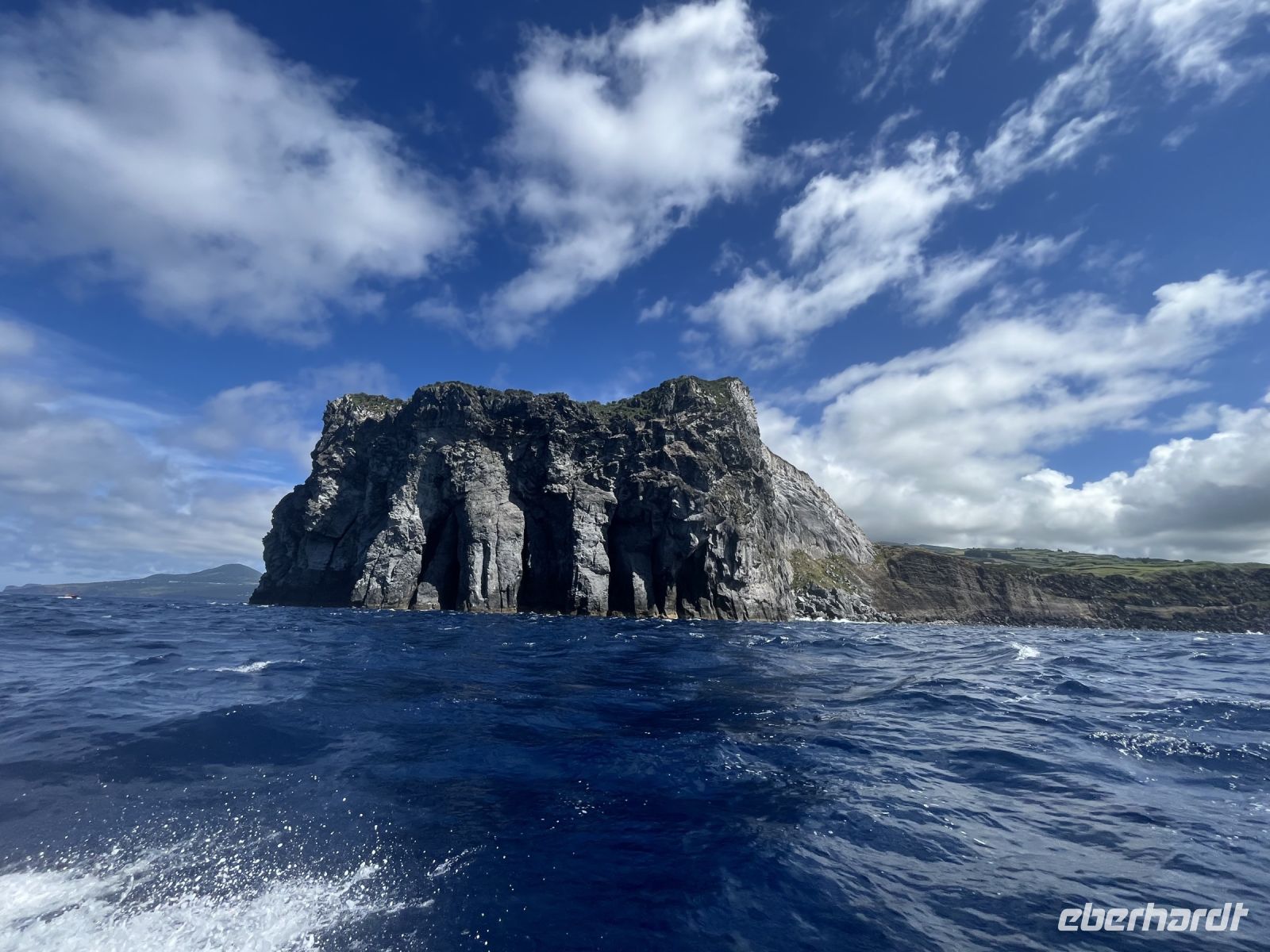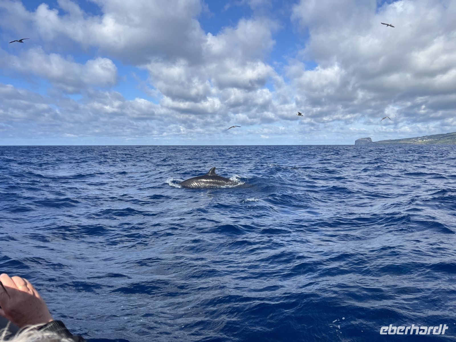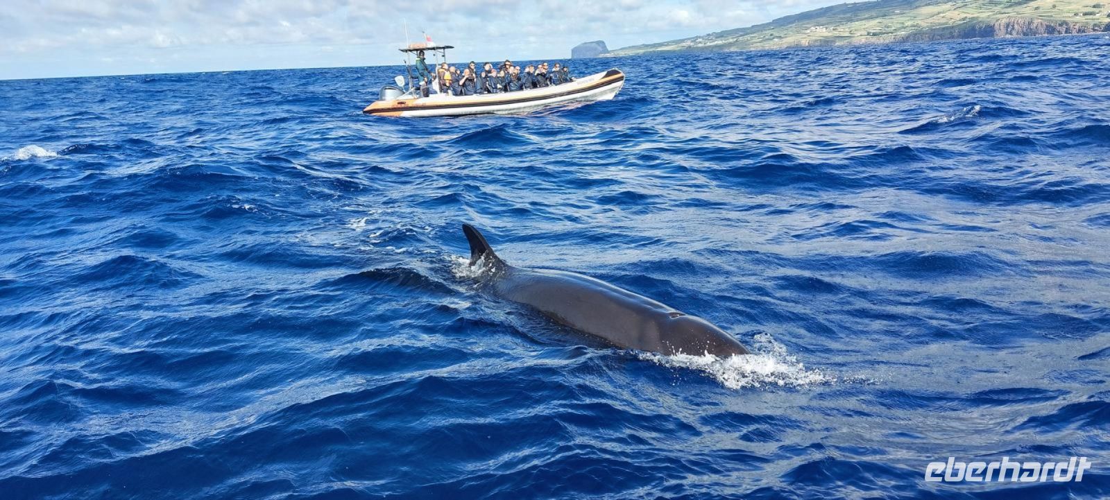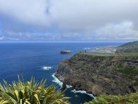 Heute geht es weiter auf die vierte und letzte Insel unserer Reise, Terceira. Doch da unser Flieger erst am Nachmittag abfliegt, haben wir am Morgen noch Zeit an einer fakultativen Walbeobachtung teilzunehmen. Der Großteil der Gruppe macht sich also früh am Morgen auf zum Hafen von Horta. Nach einer kurzen Einweisung begeben wir uns auf das Zodiac-Schlauchboot, eingepackt in Regenjacken und Schwimmwesten. Gemeinsam mit einer Meeresbiologin und unserem Skipper fahren wir auf die Südseite der Insel Faial, da hier am Morgen ein männlicher Pottwal gesichtet wurde. Der Seegang ist stark und wir kriegen viel Salzwasser ins Gesicht gespritzt. Aber dann treffen wir auch schon auf die ersten Tiere, eine Gruppe von großen Tümmlern, die sich einen großen Thunfisch hin und her schieben. Ein klasse Fotomotiv! Die Tiere schwimmen ganz nah am Boot vorbei und tauchen auch unter diesem hindurch. Dann kriegt unser Skipper einen Funkspruch, dass der Pottwal wieder gesichtet wurde. Schnell machen wir uns auf den Weg, immer weiter von der Küste weg. Endlich sehen wir ihn, wie er entspannt an der Oberfläche schwimmt, bevor er uns ein letztes Mal seine Fluke zeigt und abtaucht in die Tiefen des Atlantiks. Später sehen wir noch einen zweiten Pottwal und eine Delfinschule. Wieder am Hafen angekommen sind zwar alle nass und ordentlich durchgeschaukelt, aber dafür mit einmaligen Erinnerungen im Gepäck. Wir laufen zurück zum Hotel und machen uns frisch, bevor und Anja abholt und wir zum Flughafen von Horta fahren. Da wir noch etwas Zeit vor dem Abflug haben, trinken wir noch einen Café im Restaurant auf dem Dach des Flughafens. Auch hier verläuft der Check-in problemlos und mit ein bisschen Verspätung fliegen wir nach Terceira. Hier wartet bereits unser Reiseleiter Thomas und Busfahrer Mauro auf uns und bringen uns ins "Hotel Terceira Mar", das sehr idyllisch direkt an der Küste vor dem Monte Brasil liegt. Bei einer kurzen Orientierungsfahrt durch die UNESCO Weltkulturerbestadt Angra de Heroismo gibt uns Thomas einen kleinen Überblick über die Stadt und stellt das Programm für den nächsten Tag vor. Wir checken im Hotel ein und alle gehen individuell Abendessen.