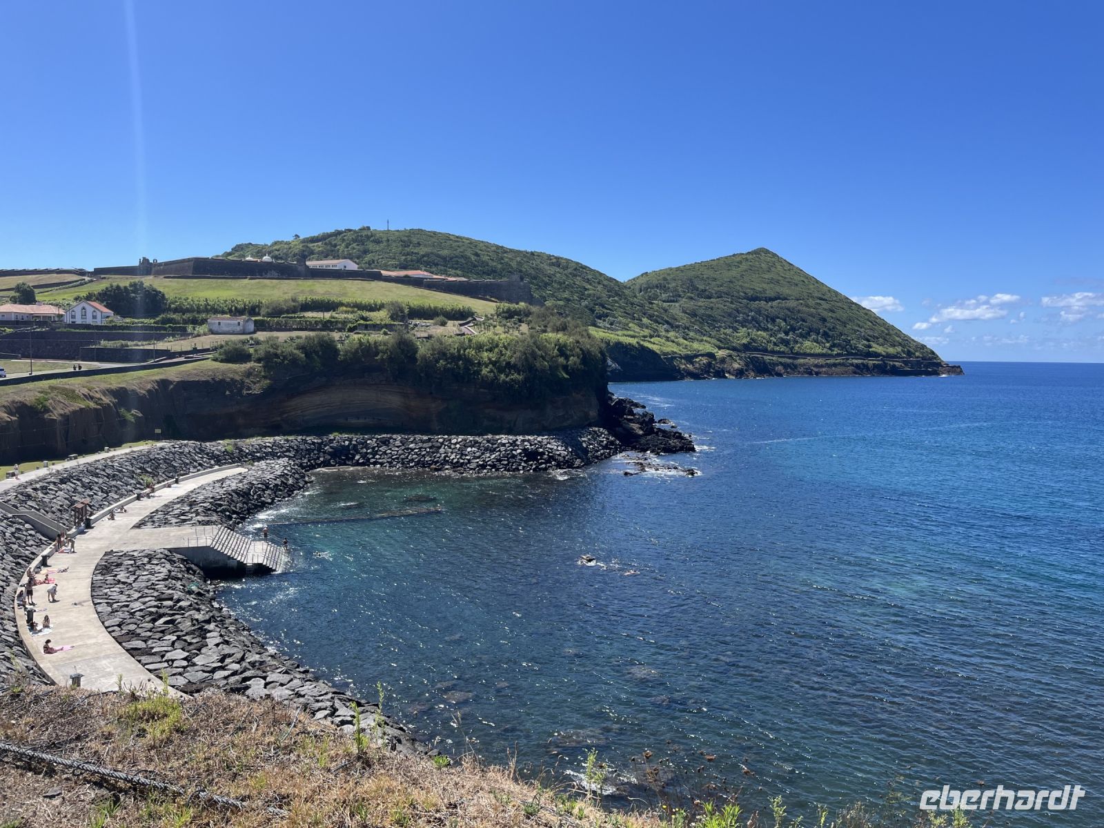 Heute steht ein Stadtspaziergang in der Weltkulturerbestadt Angra de Heroismo auf dem Programm, die älteste Stadt der Azoren. Nach dem Frühstück treffen wir uns mit unserem Reiseleiter Thomas am Hotel und laufen zu Fuß in die Innenstadt. Unser erster Stopp ist der Markt von Angra, auf dem an einem Montag allerdings nicht so viel los ist. Wir schauen uns die verschiedenen Obst-, Gemüse- und Fischstände an und Thomas erklärt uns viel Spannendes über die verschiedenen Fischsorten und Ihre Zubereitungsmöglichkeiten. Danach besuchen wir das Theater der Stadt, ein schönes Gebäude aus dem 19. Jahrhundert, in dem nicht nur azorianische Theatergruppen, sondern auch Künstler aus ganz Portugal auftreten. Weiter geht es durch die Stadt vorbei an der Kirche "Nossa Senhora de Carno" bis zum Garten "Duque da Terceira". Hier machen wir eine kleine Pause und lassen die schönen Pflanzen auf uns wirken. Er ist einer der bekanntesten Gärten der Azoren und beherbergt dutzende Pflanzen aus der ganzen Welt, so zum Beispiel den seltenen Zitronen-Eukalyptus. Nach der kleinen Pause laufen wir zum Hafen von Angra do Heroismo, der aufgrund seiner günstigen Lage früher einen wichtigen Umschlagsplatz darstellte. Wir laufen vorbei am Yachthafen und am Badestrand und können von hier das Fort auf dem Monte Brasil beobachten. An der Kathedrale von Angra endet unser Rundgang und der restliche Tag steht uns zur freien Verfügung. Einige nutzen die Zeit, um im Atlantik baden zu gehen oder die verschiedenen Pools des Hotels zu nutzen. Andere machen nochmal eine kleine Wanderung auf den Monte Brasil. Am Abend genießen wir alle zusammen unser Abschiedsabendessen im Hotel und lassen die Reise bei gutem Essen und netten Gesprächen ausklingen.