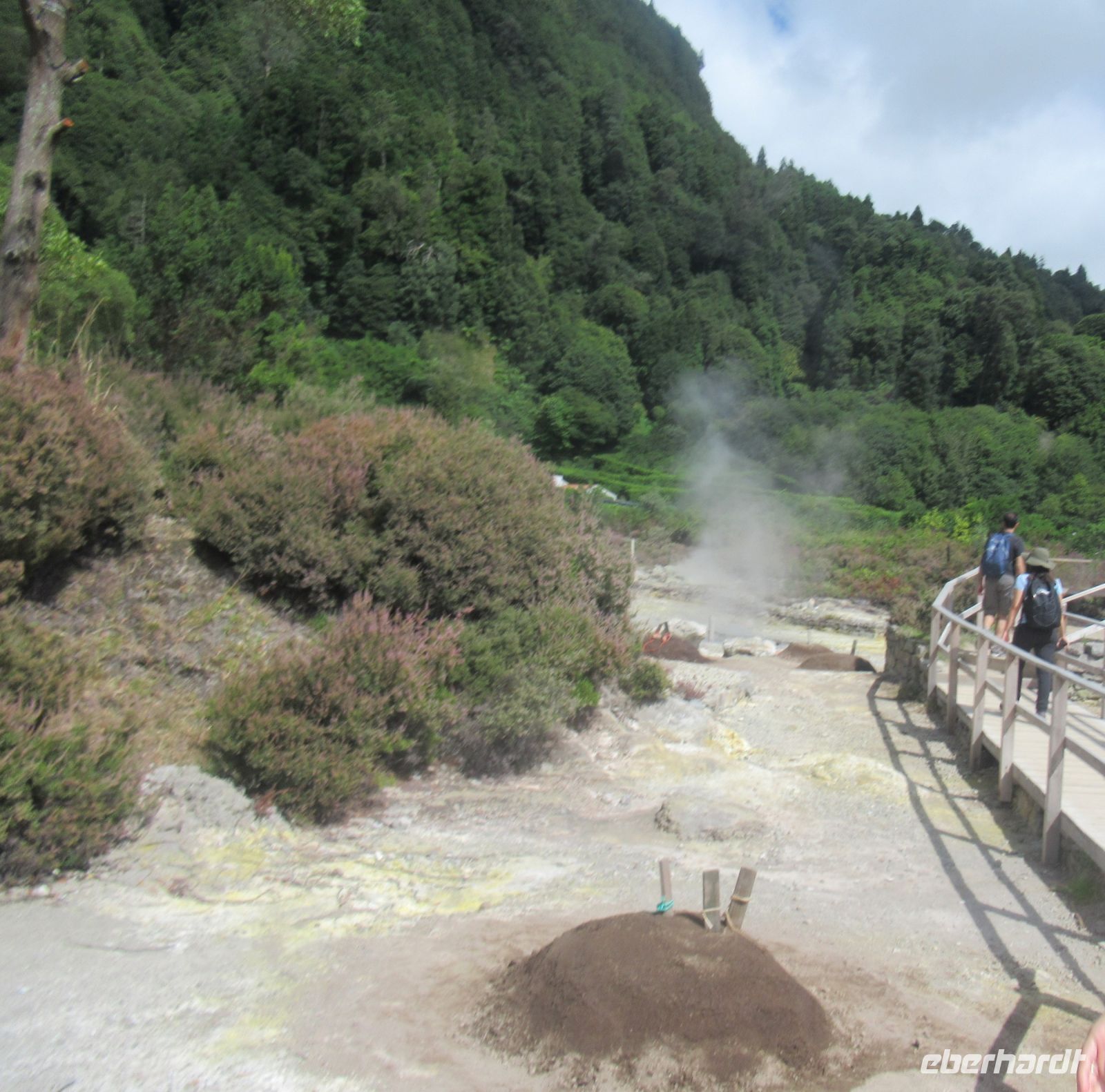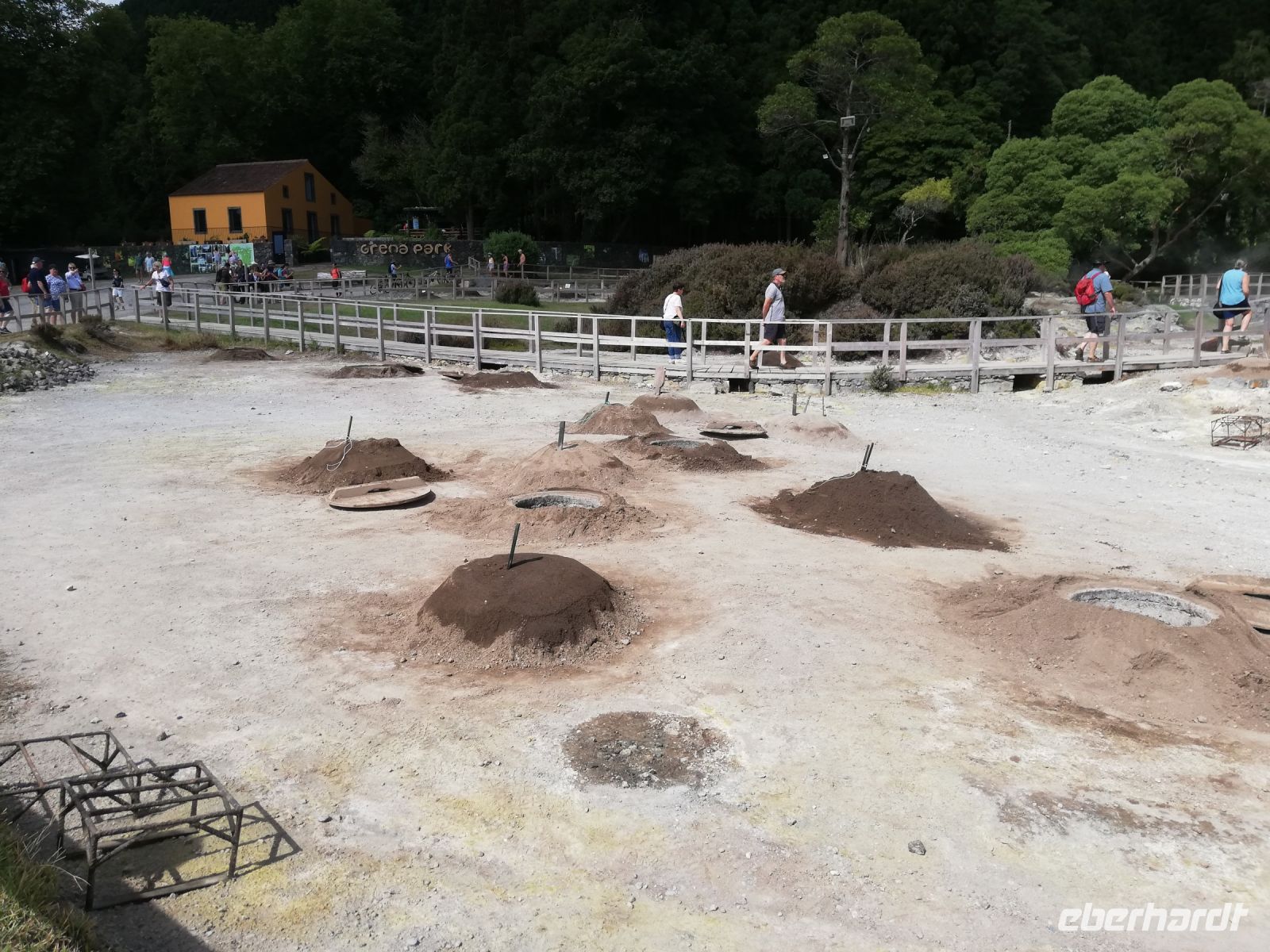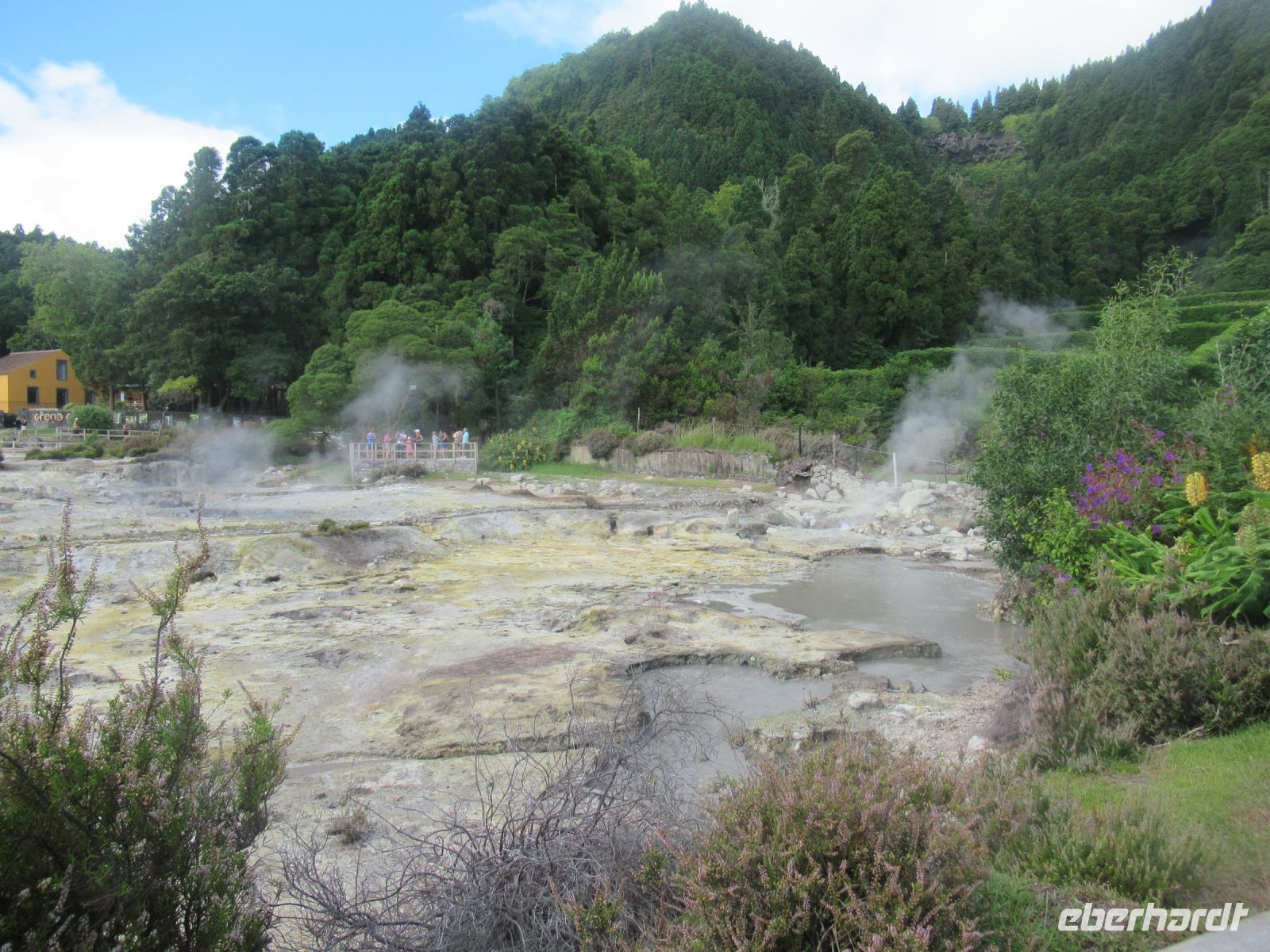 Nach diesem Spektakel möchten wir auch die Spezialität verkosten. So fahren wir in den Ort Furnas. Was ist so besonders an Furnas? Furnas liegt in einem vulkanisch aktiven Gebiet, und der letzte größere Ausbruch ereignete sich im Jahre 1630. Seitdem sind die geothermischen Aktivitäten ein charakteristisches Merkmal der Region. So entstanden auch viele Mineralquellen, Geysire und Thermalbäder.