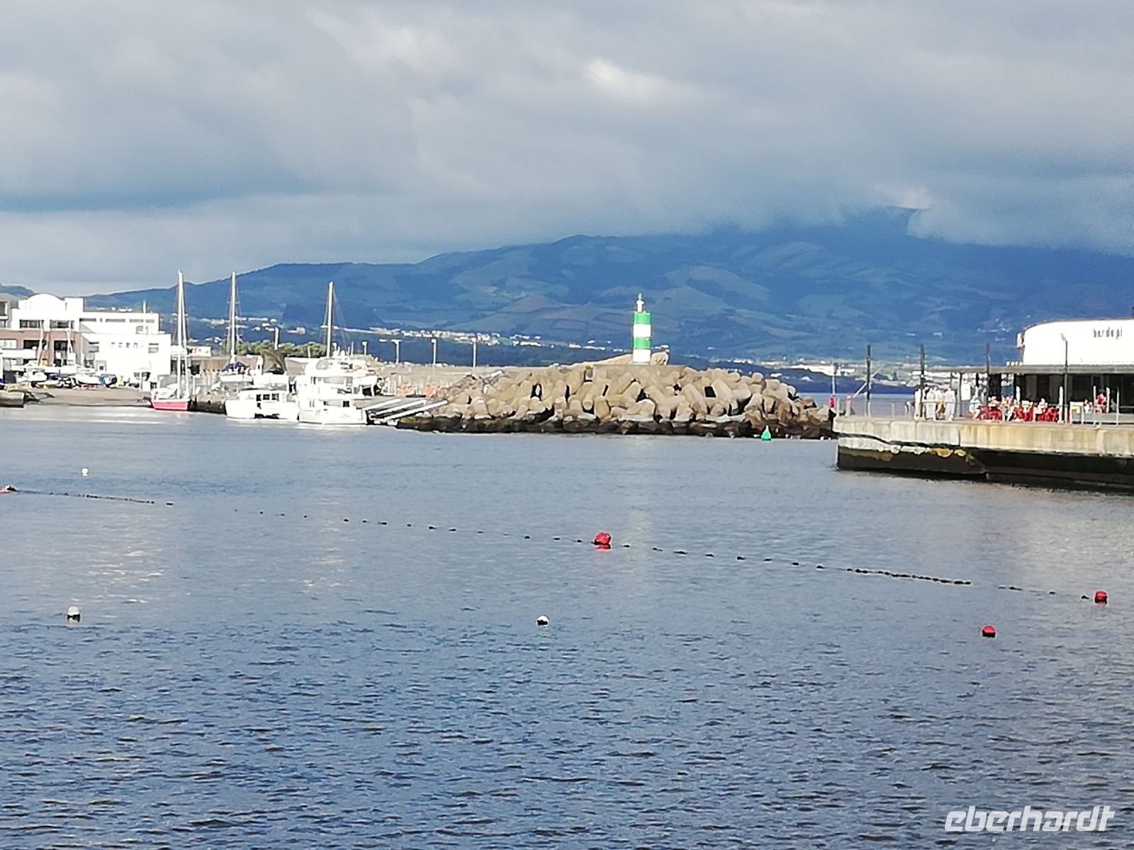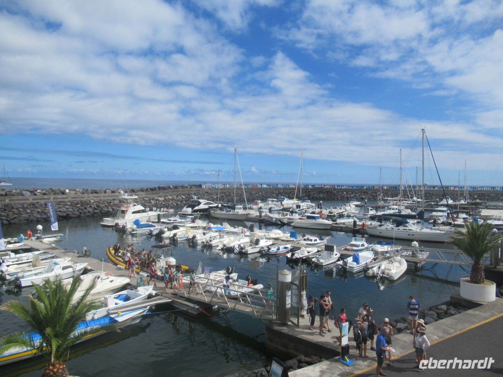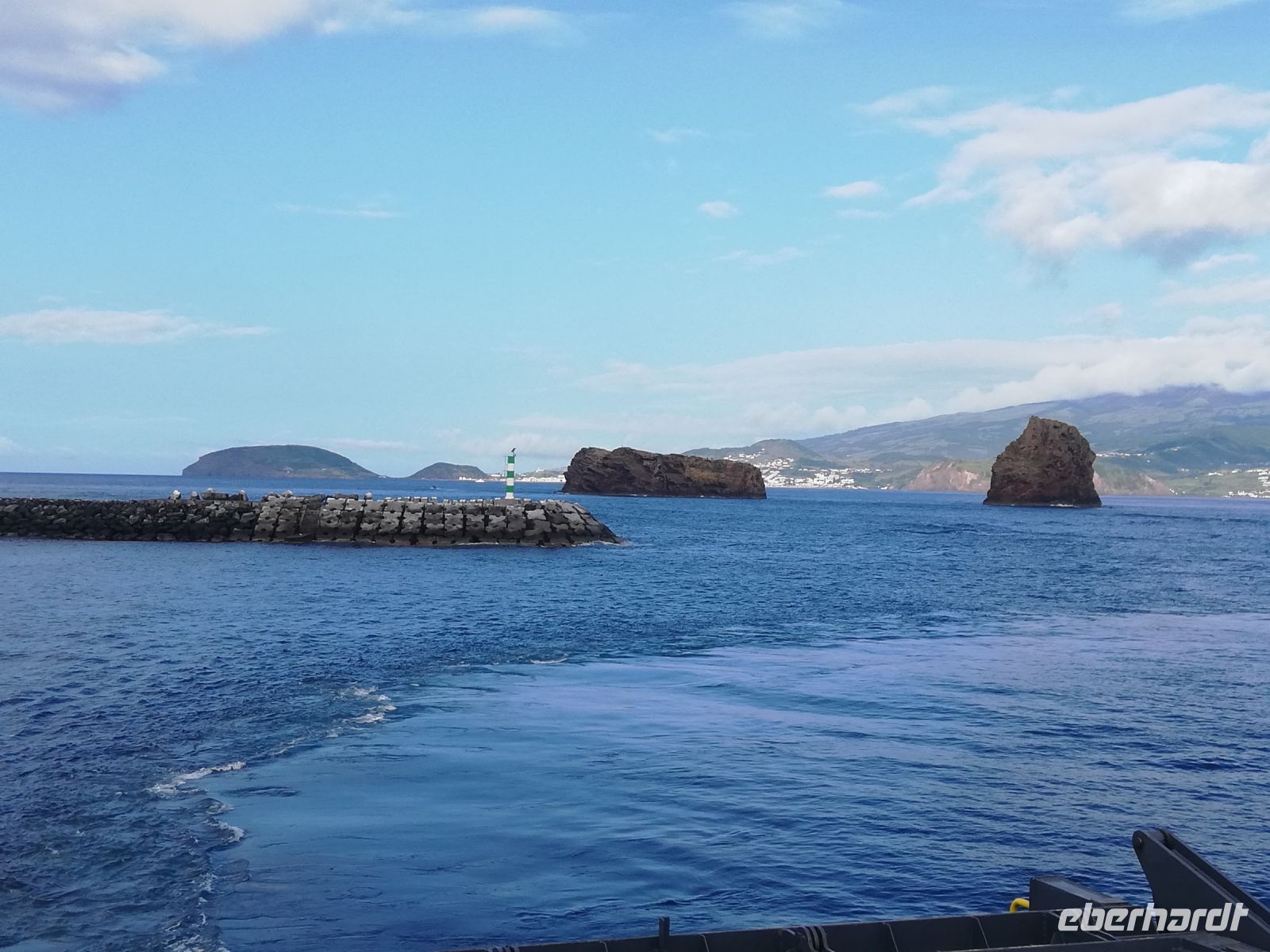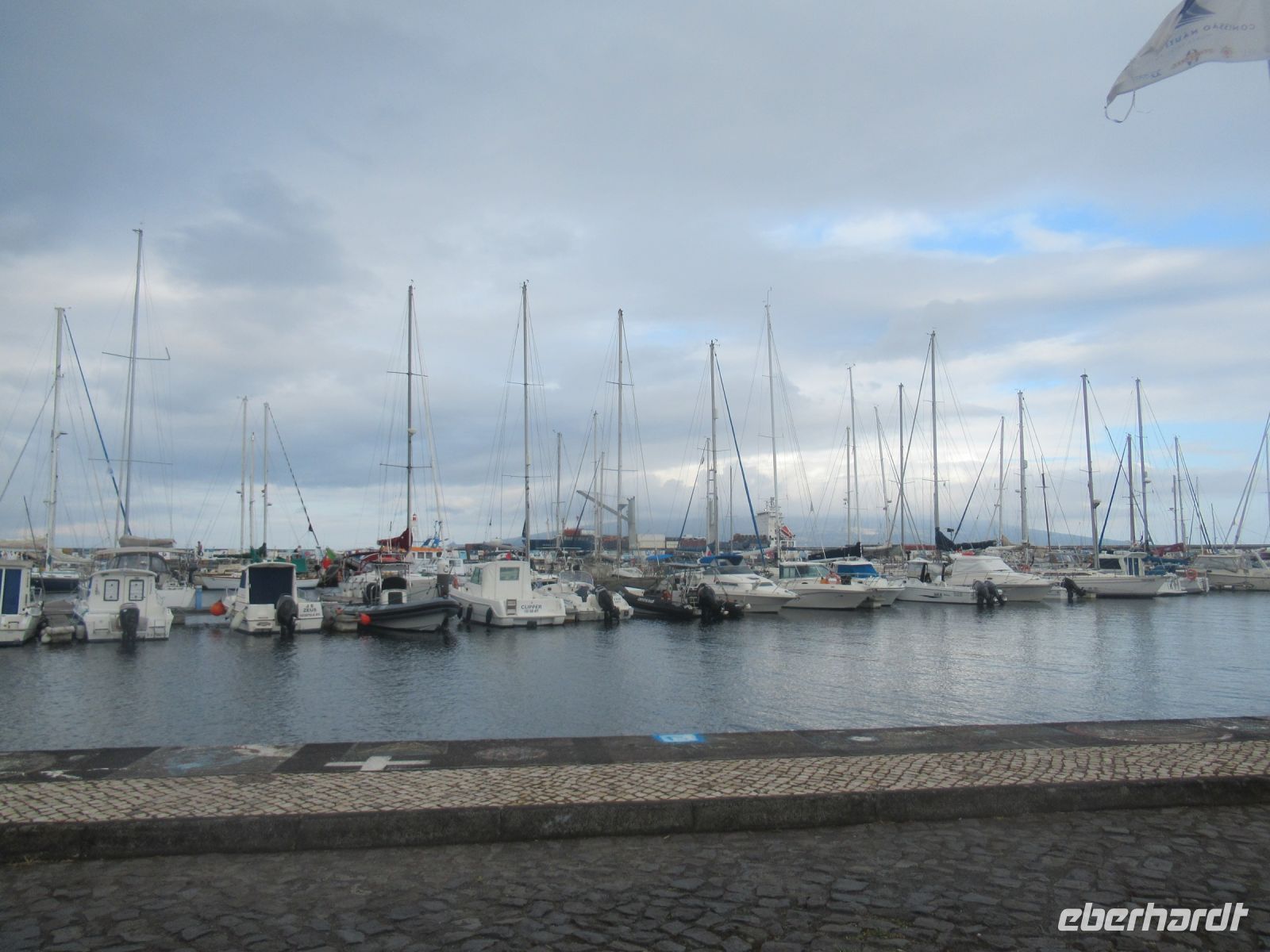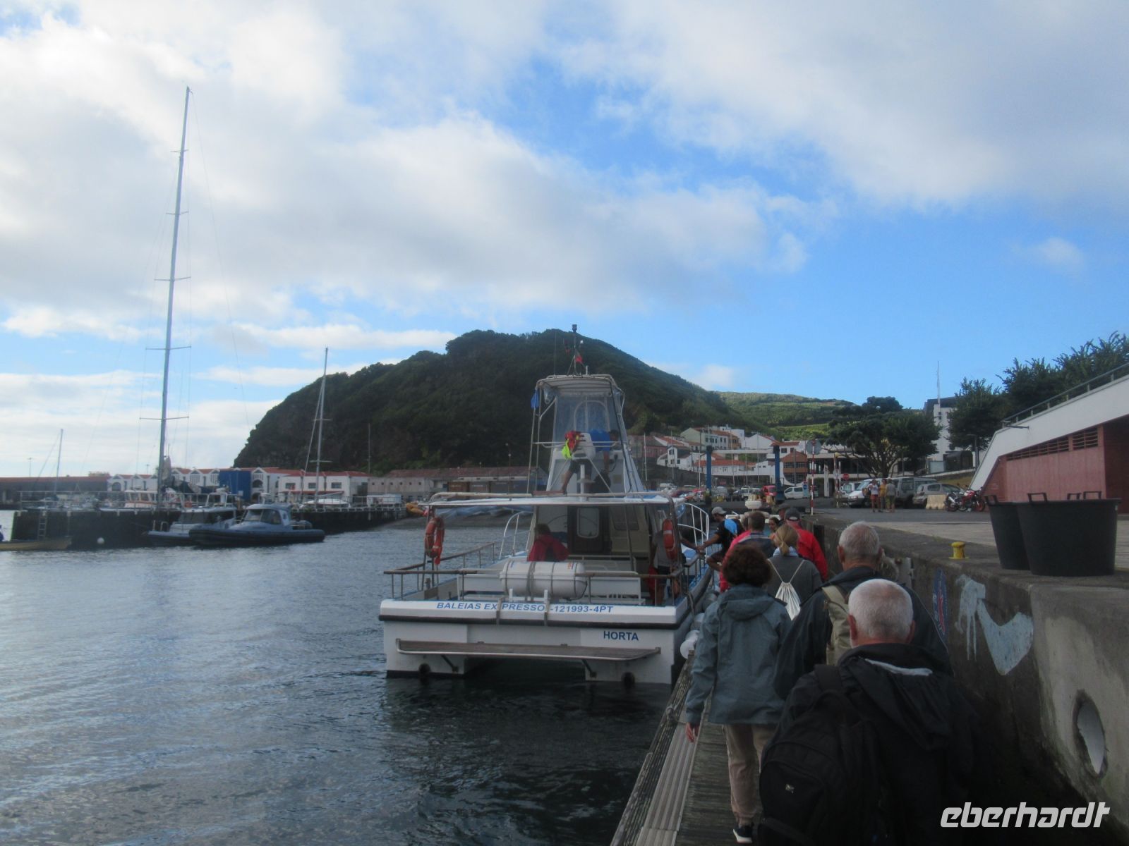 Nach dem Frühstück gut gestärkt, Koffer bereits gepackt, machen wir machen uns auf den Weg zum Hafen von Faial. Es beginnt etwas zu regnen, so stellen wir uns unter das Zelt von Peters Café – das Unternehmen Base Peter Zee gehört zu Peter´s Café. Ich erledige erst die Formalitäten im Büro und unsere Betreuerin Raquel kommt zu uns und erklärt uns, dass auf See aktuell starker Wind geht und bei Regen die Chance Wale zu sehen etwas gering ist. Wir warten auf weitere Infos des Kapitäns und es gibt die Wahl, die Tour teils oder ganz abzusagen oder mit der geringen Chance, die Wale zu sehen, loszufahren. Alle unsere Gäste sind entschlossen die Tour, auf die sich schon so freuen, zu machen. Der Kapitän gibt grünes Licht und es hört auf zu regnen.