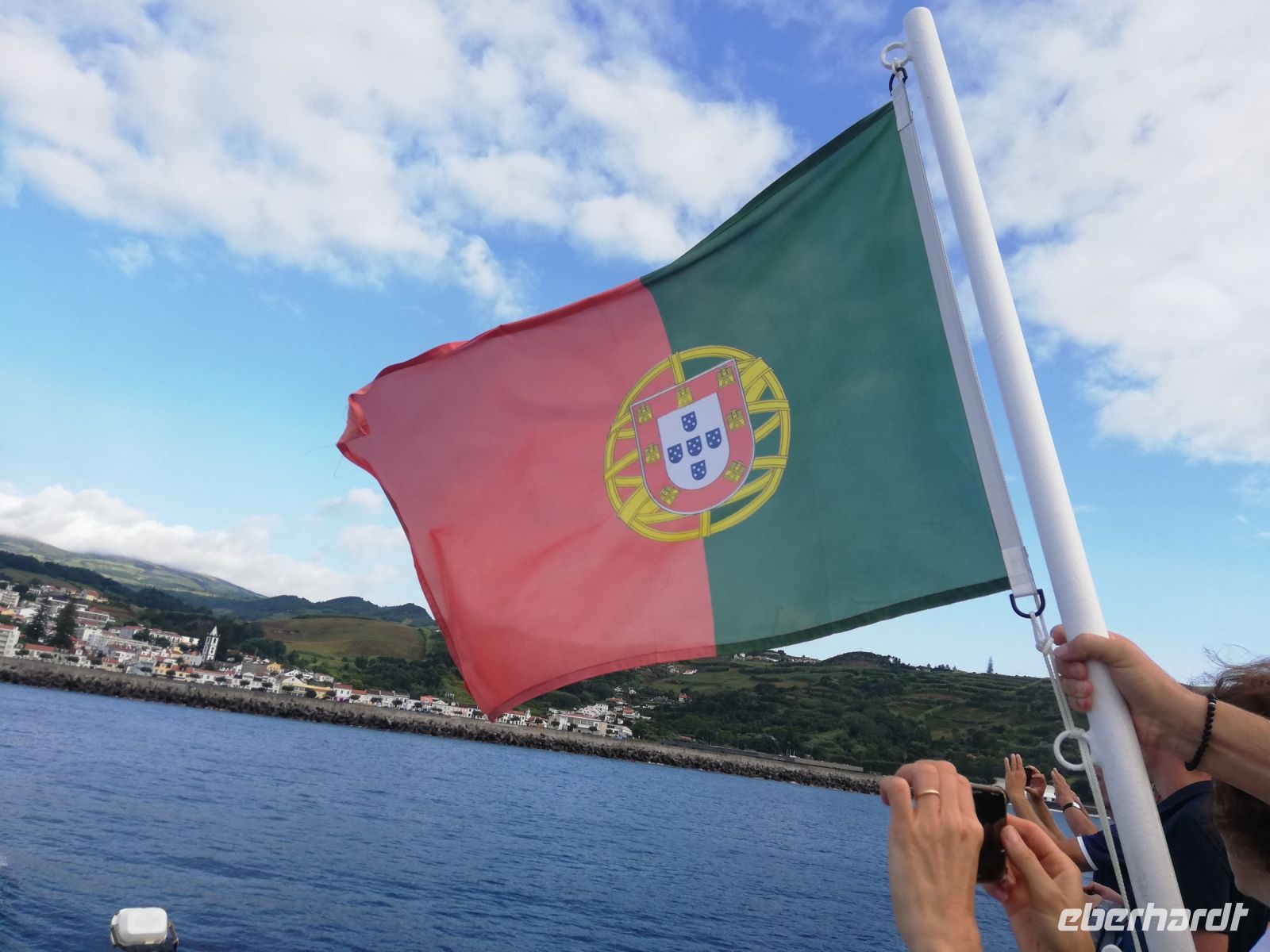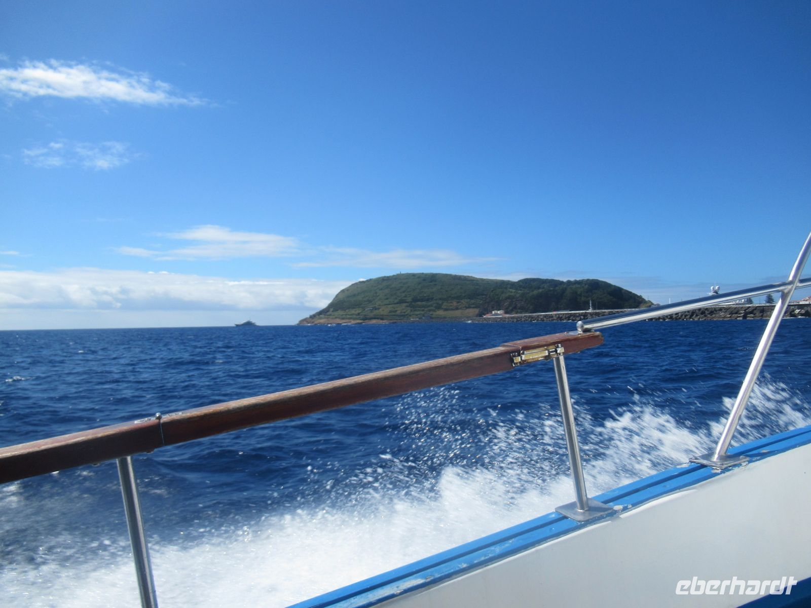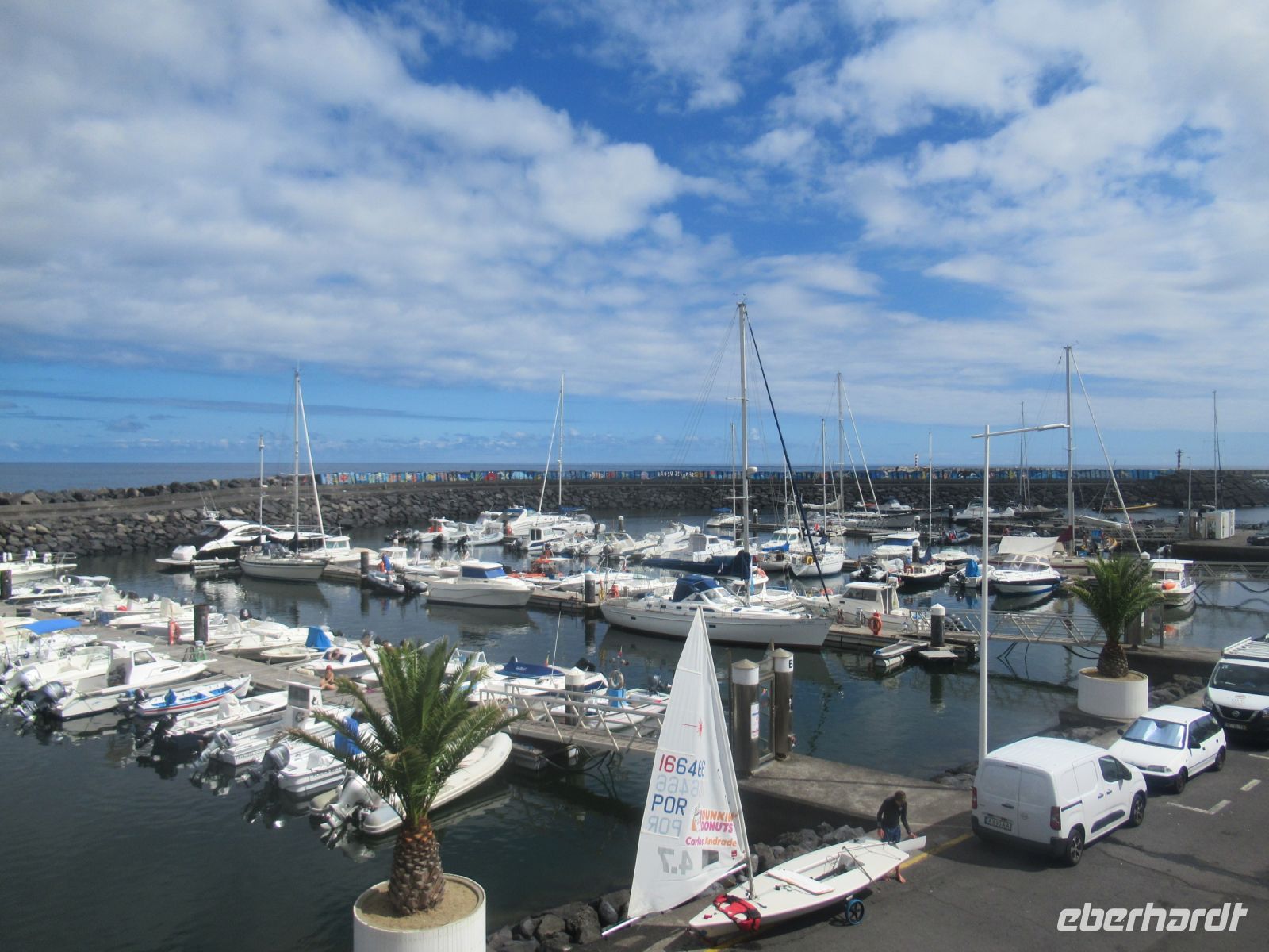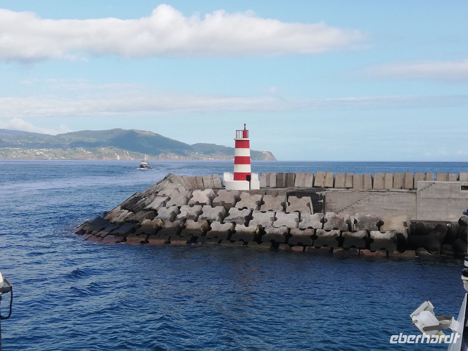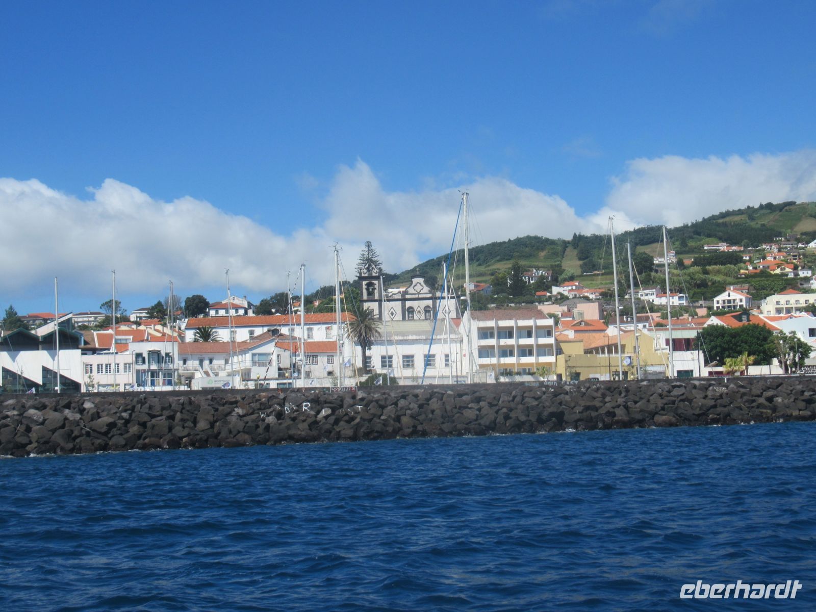 Nach dem Frühstück gut gestärkt, Koffer bereits gepackt, machen wir machen uns auf den Weg zum Hafen von Faial. Es beginnt etwas zu regnen, so stellen wir uns unter das Zelt von Peters Café – das Unternehmen Base Peter Zee gehört zu Peter´s Café. Ich erledige erst die Formalitäten im Büro und unsere Betreuerin Raquel kommt zu uns und erklärt uns, dass auf See aktuell starker Wind geht und bei Regen die Chance Wale zu sehen etwas gering ist. Wir warten auf weitere Infos des Kapitäns und es gibt die Wahl, die Tour teils oder ganz abzusagen oder mit der geringen Chance, die Wale zu sehen, loszufahren. Alle unsere Gäste sind entschlossen die Tour, auf die sich schon so freuen, zu machen. Der Kapitän gibt grünes Licht und es hört auf zu regnen.