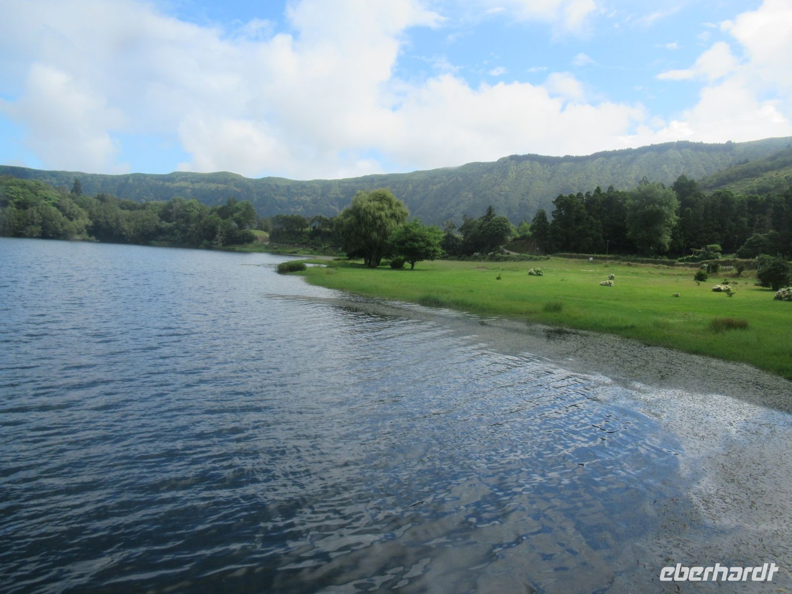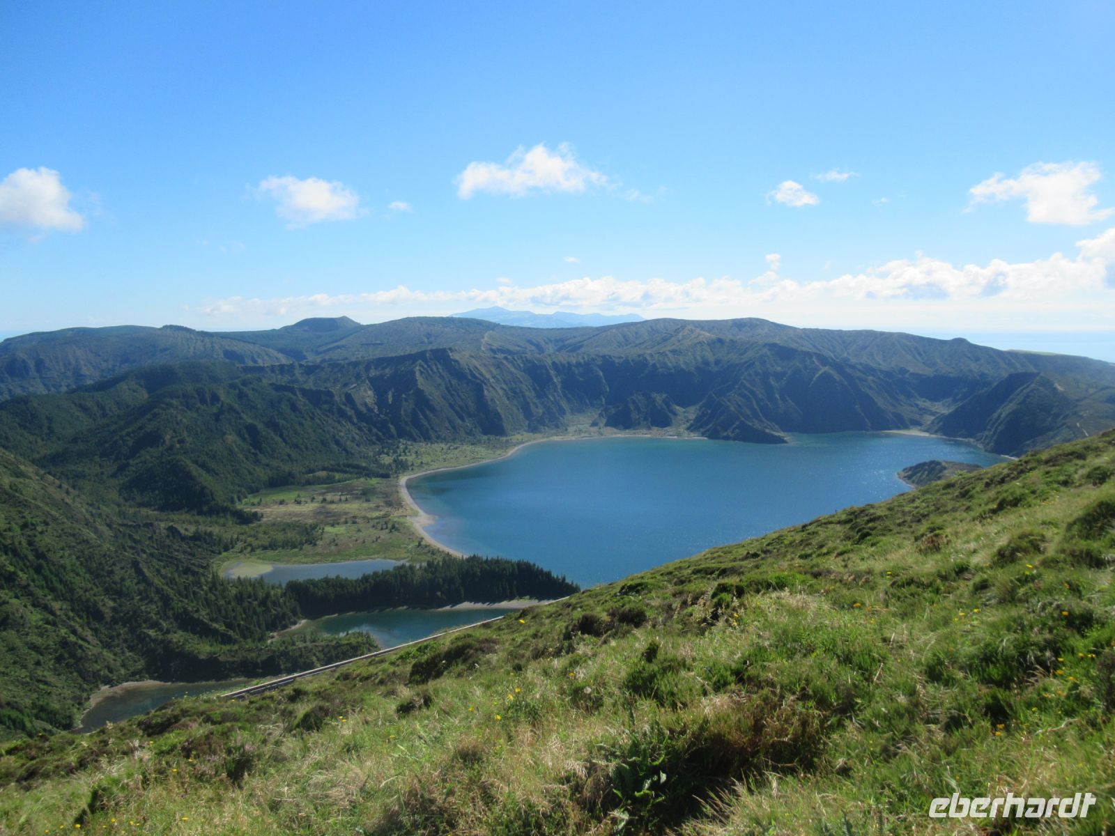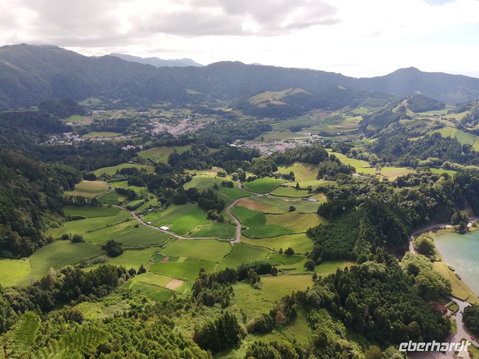 Mit Respekt zur Arbeit, aber auch Erhaltung der Tradition verlassen wir die Manufaktur und Juan nimmt jetzt die Serpentinen nach oben zu einem der schönsten Seen der Insel – Lagoa do Fogo – oder auch Feuersee. Es eröffnen sich wunderschöne Ausblicke auf die Landschaften, von einer Stelle sehen wir die beiden Ufer der Insel São Miquel. Wir kommen am Parkplatz unterhalb von Pico Barossa (947 M) an.