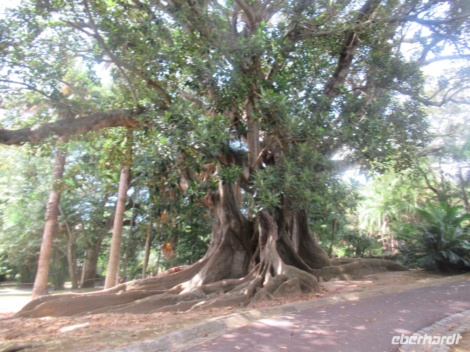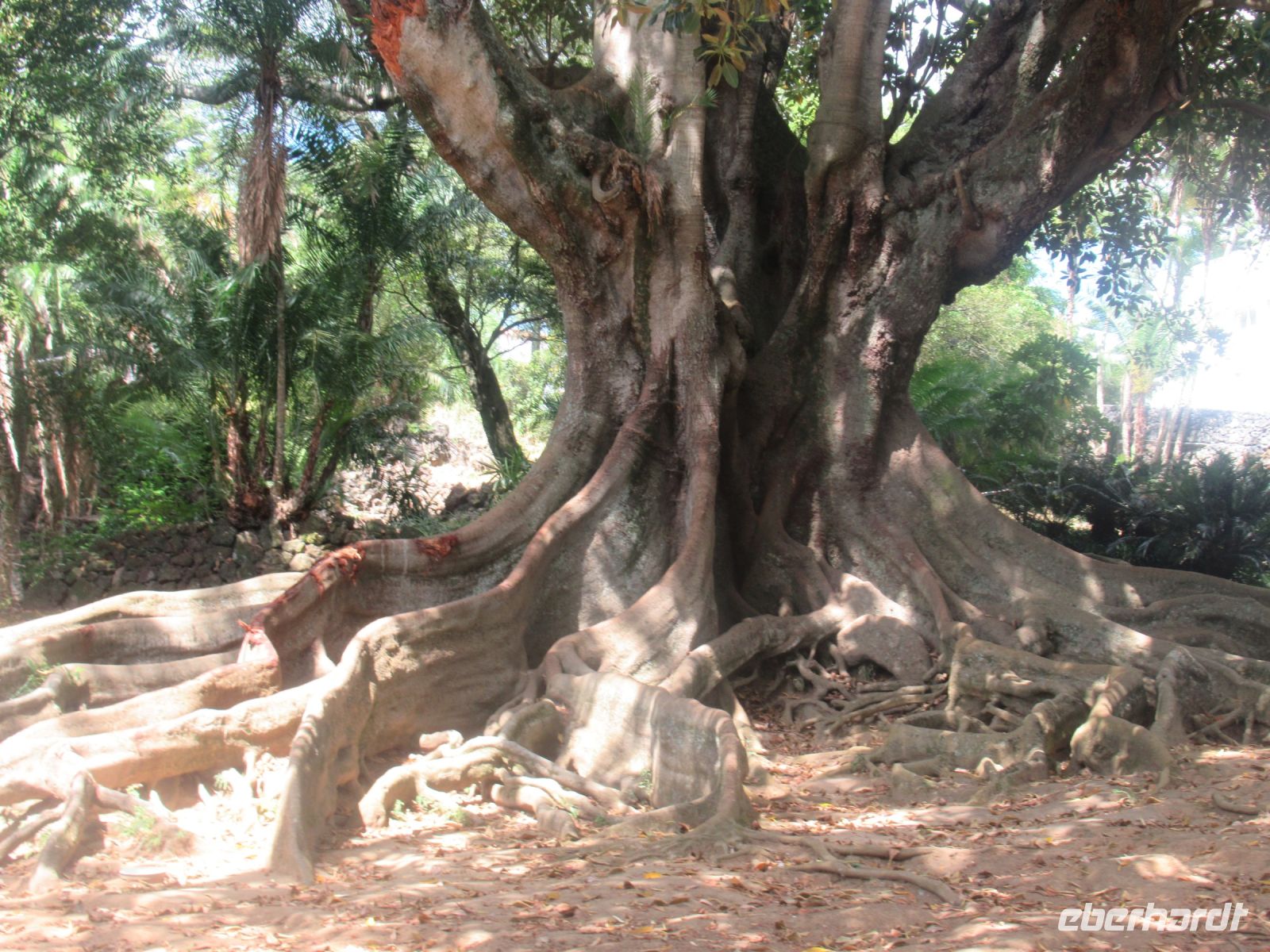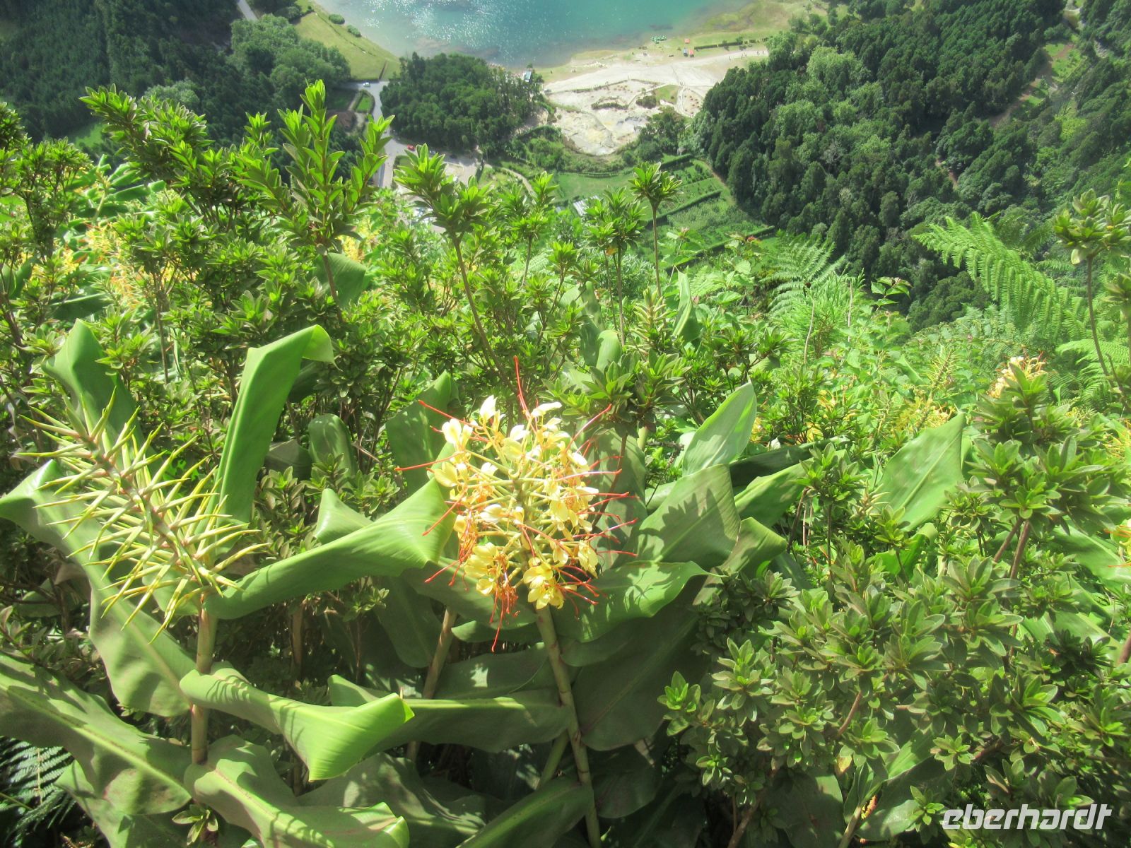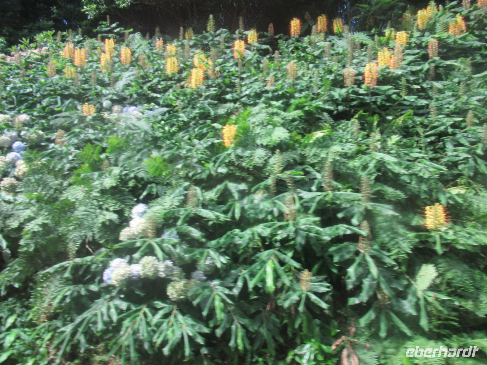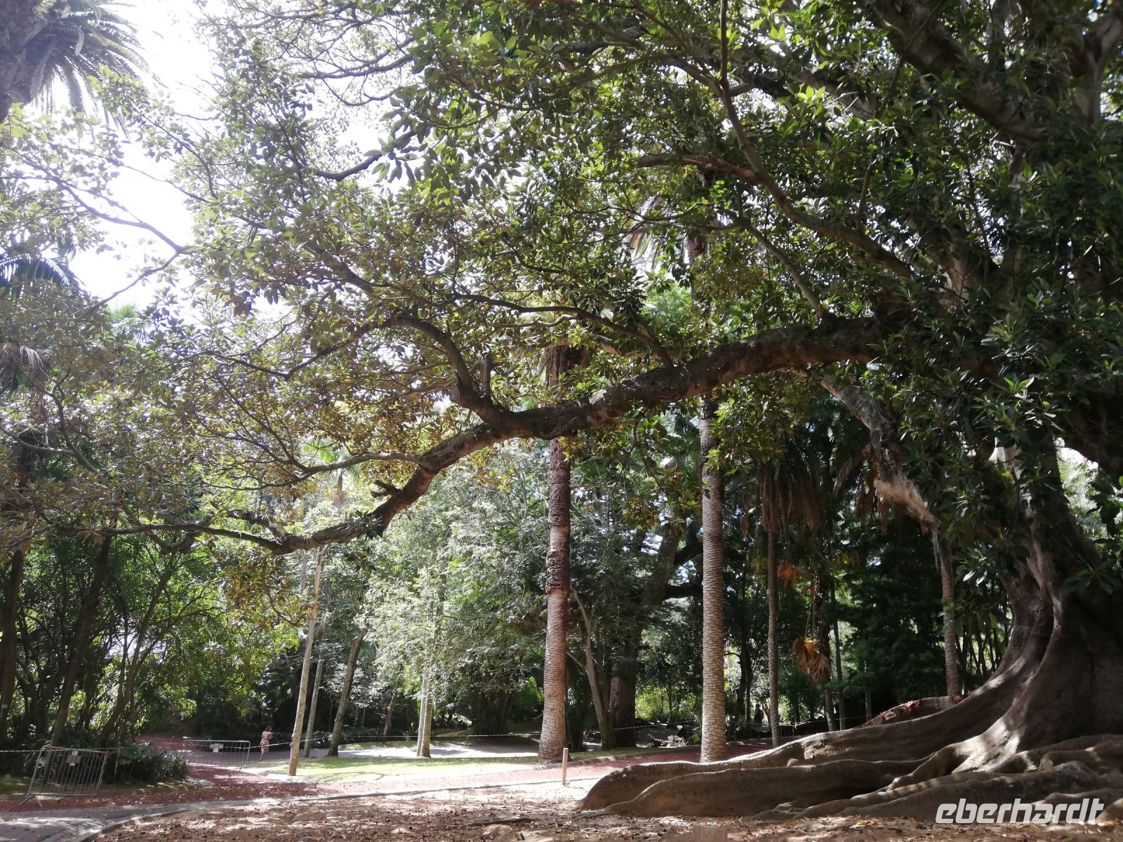 Tiago hat viel Wissen über die Pflanzenwelt, ich übersetze, soweit mein “botanisches Englisch" ausreicht…“. Beindruckend ist der riesengroße Baum ein „Ficus macrophylla“ mit Außenwurzeln. Interessant war die Frage, beziehungsweise die Antwort, welche Pflanzen sind ursprünglich- endemisch auf den Azoren, dann hieß es: nur die Gräser, bzw. auch noch die Lorbeerwäldern und Baumheiden.… alles andere wurde hier eingeführt und eingepflanzt und gedeiht prächtig.