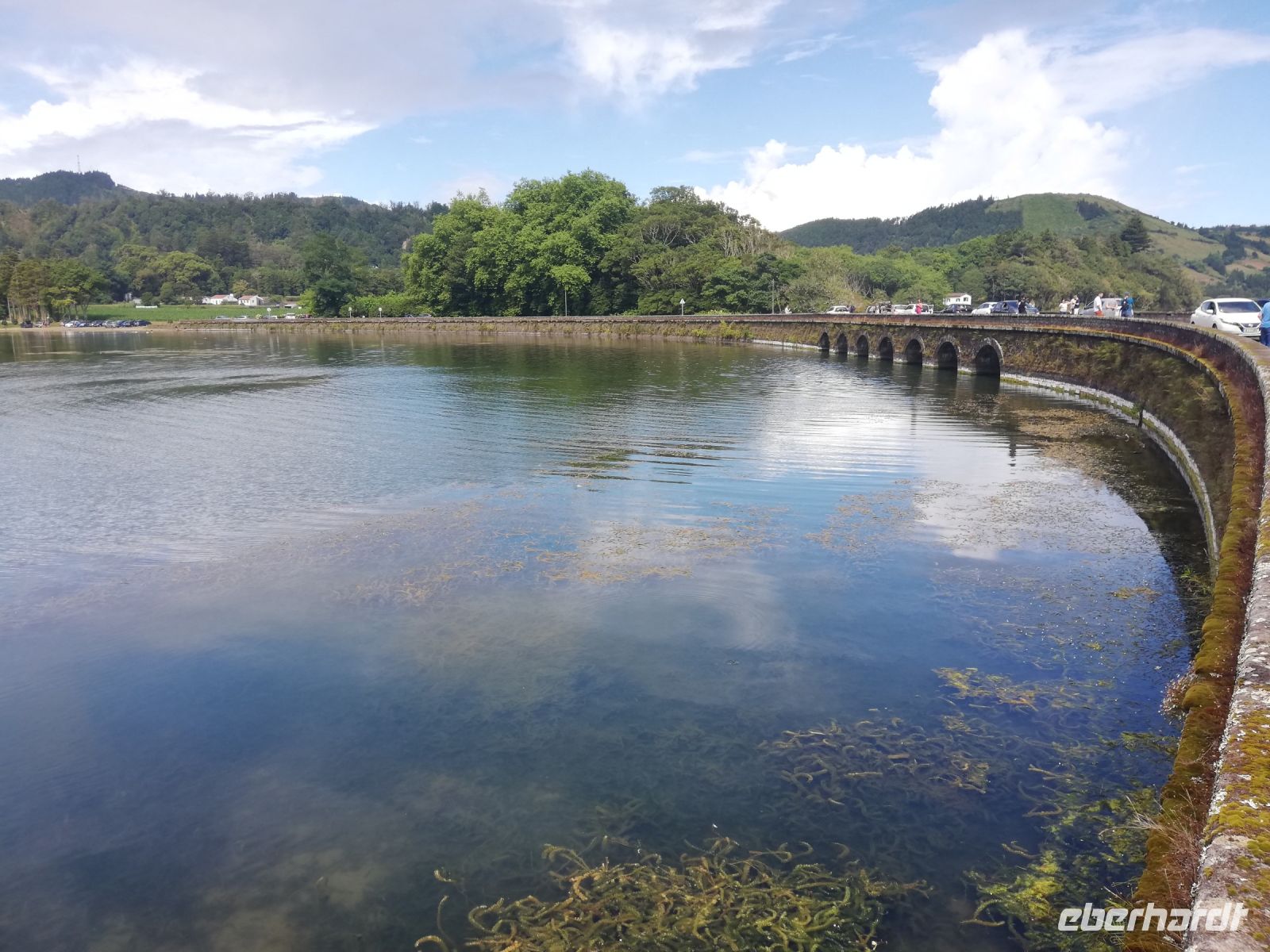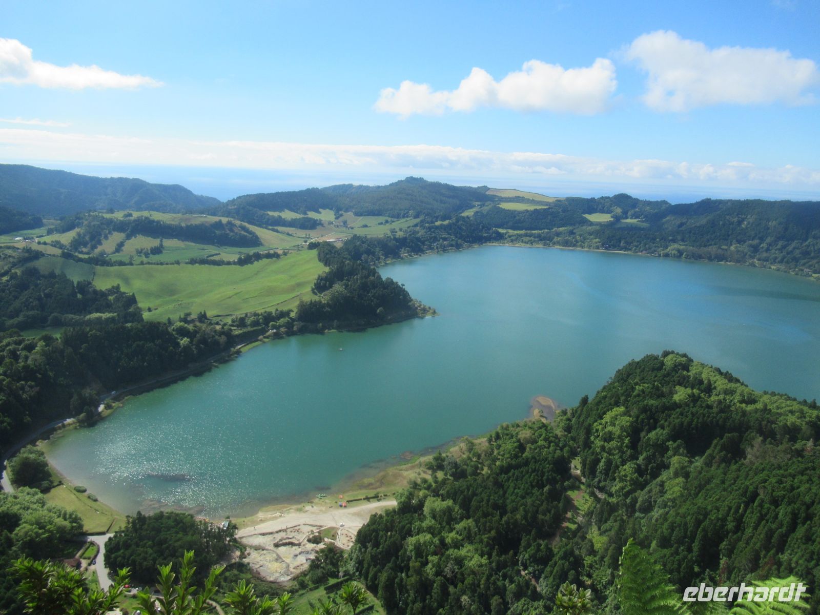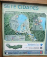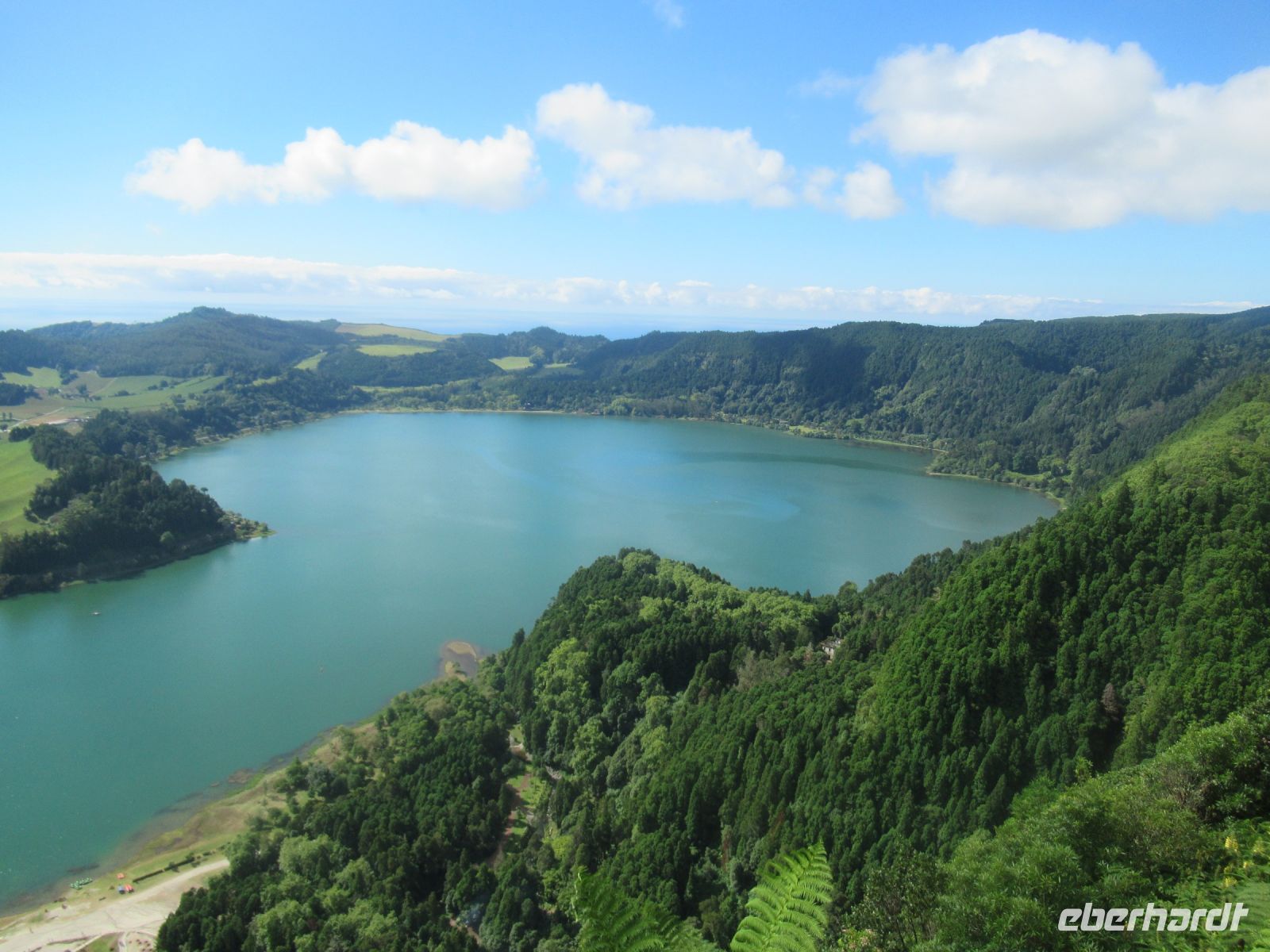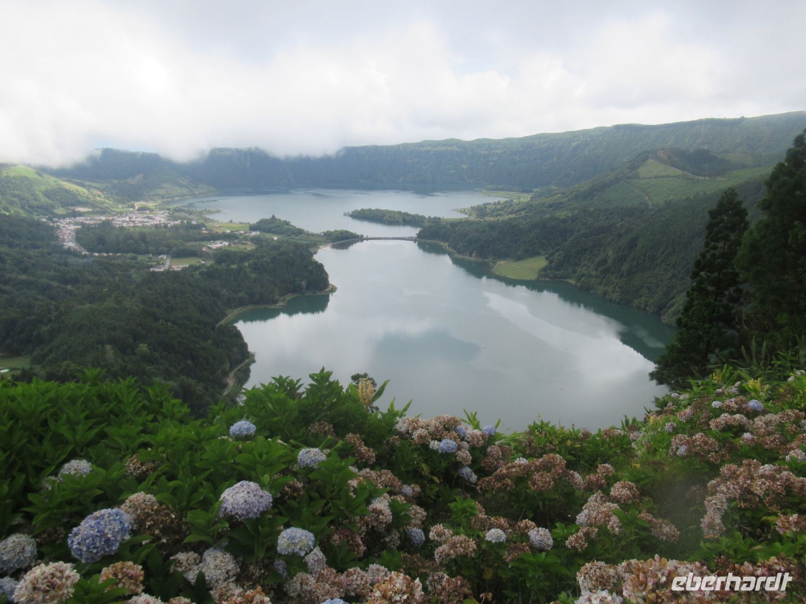 Früher erhob sich hier ein etwa 1200 m hoher Vulkan, dessen Hänge noch von den ersten Siedlern auf São Miguel bewirtschaftet wurden. Etwa Mitte des 15. Jahrhunderts brach jedoch der Vulkan mit einer gewaltigen Eruption aus. Der Vulkankegel wurde dabei zerstört und der heutige Krater – Caldera geschaffen. Die Caldera von Sete Cidades ist fast kreisförmig mit einem Durchmesser von etwa 5,3 Kilometern und einer Tiefe von rund 625 Metern. So entstanden die zwei Seen - "Lagoa Azul und Lagoa Verde“. Mit einer Fläche von 4,37 km².ist Lagoa das Sete Cidades der größte See der Azoren. Der Krater ist mit Regenwasser gefühlt, die jedoch keinen natürlichen Abfluss haben und das hat früher Überschwemmungen verursacht. Seit Jahren gibt es aber einen Kanal, dass das Wasser ins Meer ableitet. Da die Färbung so außergewöhnlich ist, entstehen natürlich die romantischen Mythen und Legenden: „Laut der Geschichte verliebten sich eine Prinzessin und ein Hirtenjunge ineinander, aber ihre Liebe war aufgrund ihrer unterschiedlichen sozialen Stände verboten. Ihre Tränen füllten die beiden Seen, wobei der blaue See die Tränen der Prinzessin und der grüne See die des Hirten symbolisieren soll.“ Die pragmatische Erklärung ist eher die Reflexion der Umgebung und Pflanzen durch das Sonnenlicht. Wir fahren jetzt zur Brücke, die die beiden Seen teilt, hier kommt die Sonne wieder und lässt uns die beiden Seen wieder bei blauem Himmel erleben.