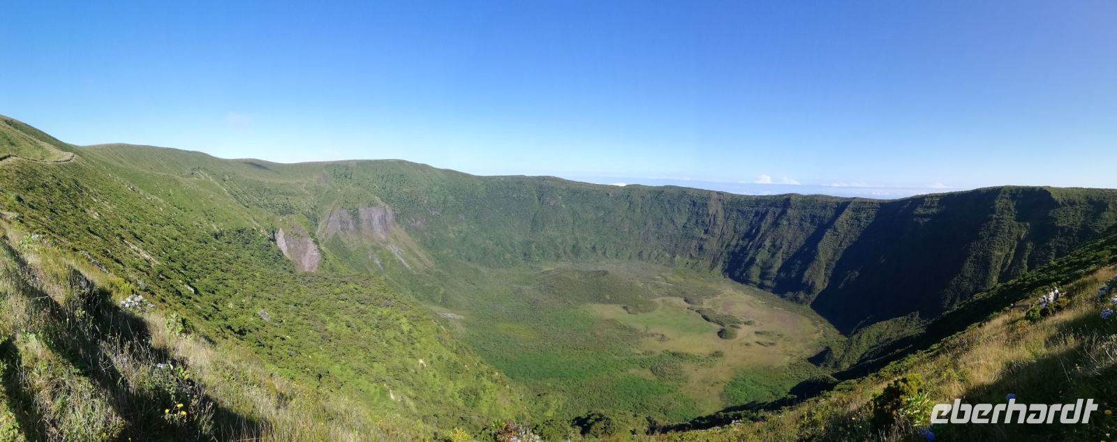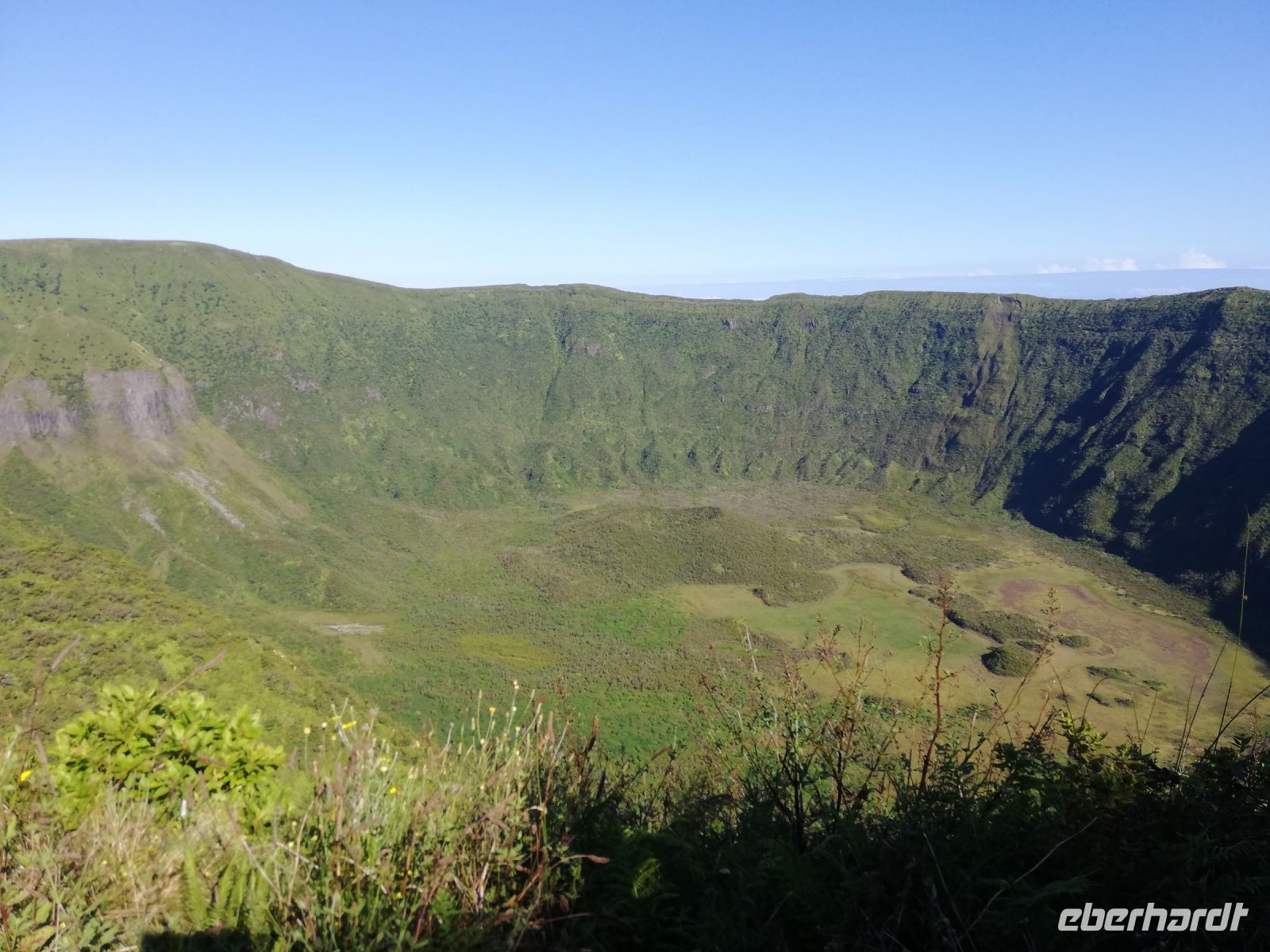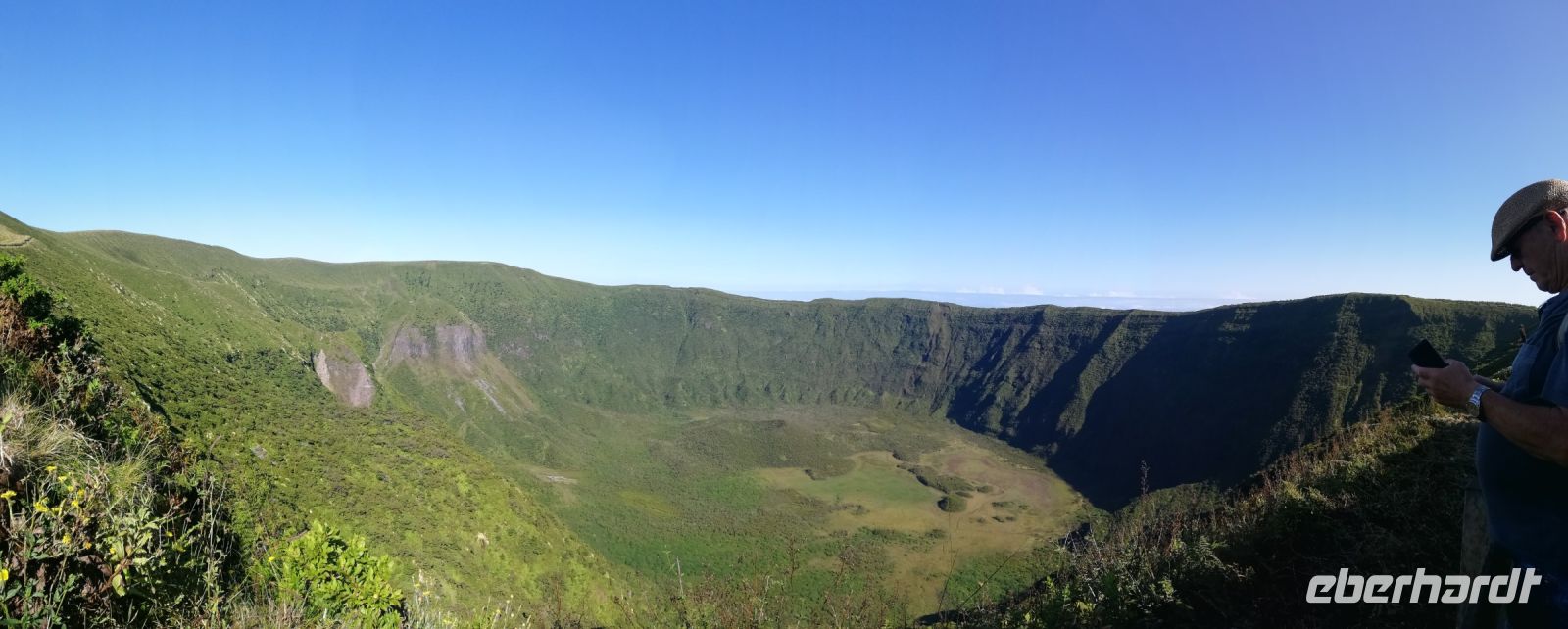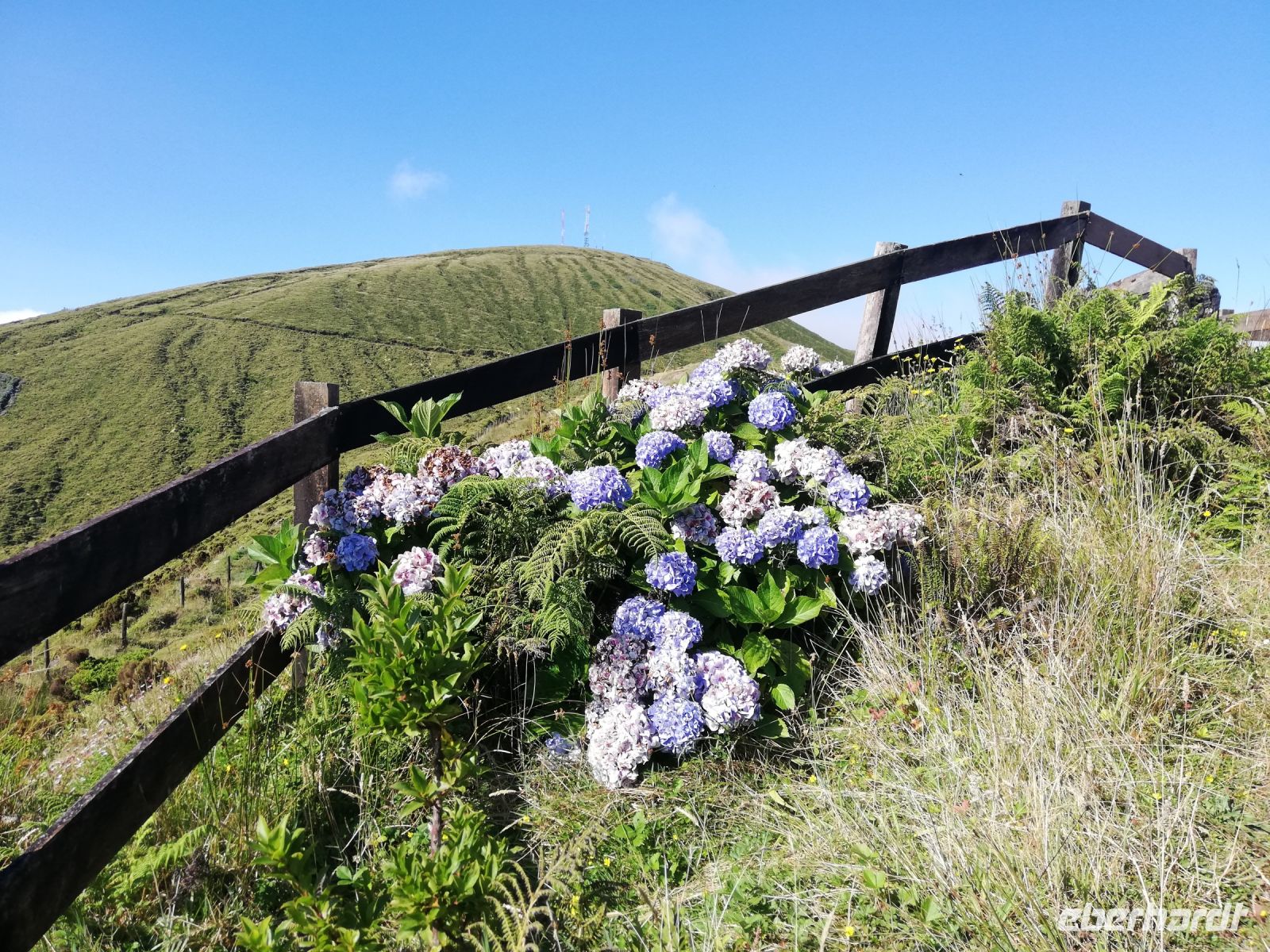 Der höchste Berg auf Faial ist der 1043 Meter hohe Cabeço Gordo, der sich im Zentrum der Insel befindet und ist ein Teil des Vulkankraters Caldeira do Faial. Da fahren wir jetzt hin – über einen kleinen Steintunnel oder über die Treppen erreichen wir die gigantische Aussicht auf den Caldeira do Faial. Wir stehen vor einem riesigen grünen Kessel mit Durchmesser von ca. 2 km und Kratertiefe von ca. 400 Meter. Die Caldera entstand durch einen Vulkanausbruch, der vor etwa 400.000 Jahren stattfand. Mehrere kleinere Ausbrüche folgten in jüngeren Zeiten. Die Caldera ist komplett bewachsen und ist heute ein Naturschutzgebiet. Auf einem Wanderweg kann man die in ca. 2 Stunden umrunden. Hier kam eine Frage auf, ob man auch unten in der Caldera wandern kann. Es ist nur mit einem Guide möglich, wird streng reglementiert und laut Anjas Erfahrung auch recht beschwerlich, da der Boden auch nass und oft stachelig ist. Wir werfen Blick auf die andere Seite und sehen den Pico in Wolken – etwas mystisch. Hier in der Höhe blühen noch die weiß-blauen Hortensien – was für ein Panorama…