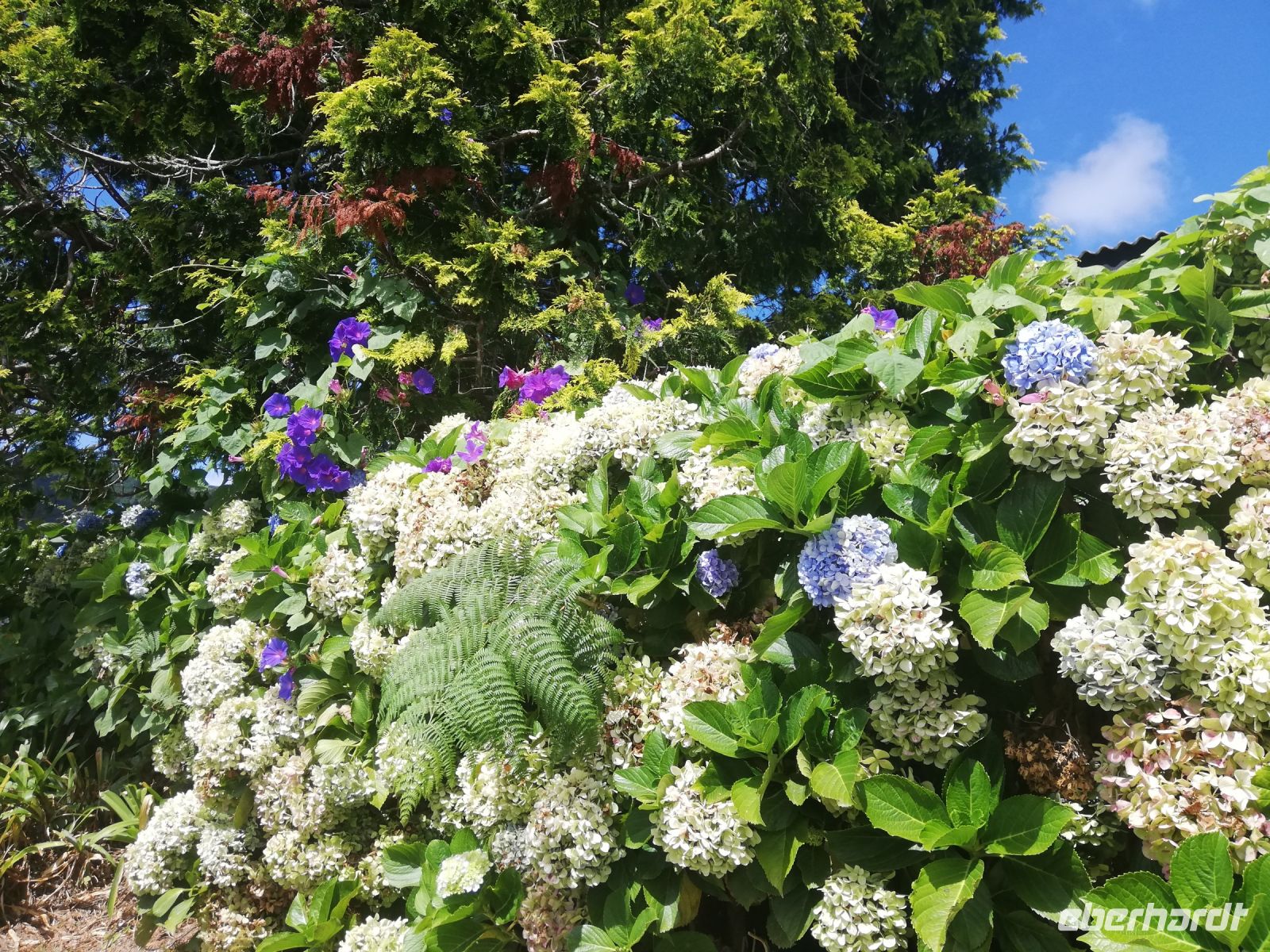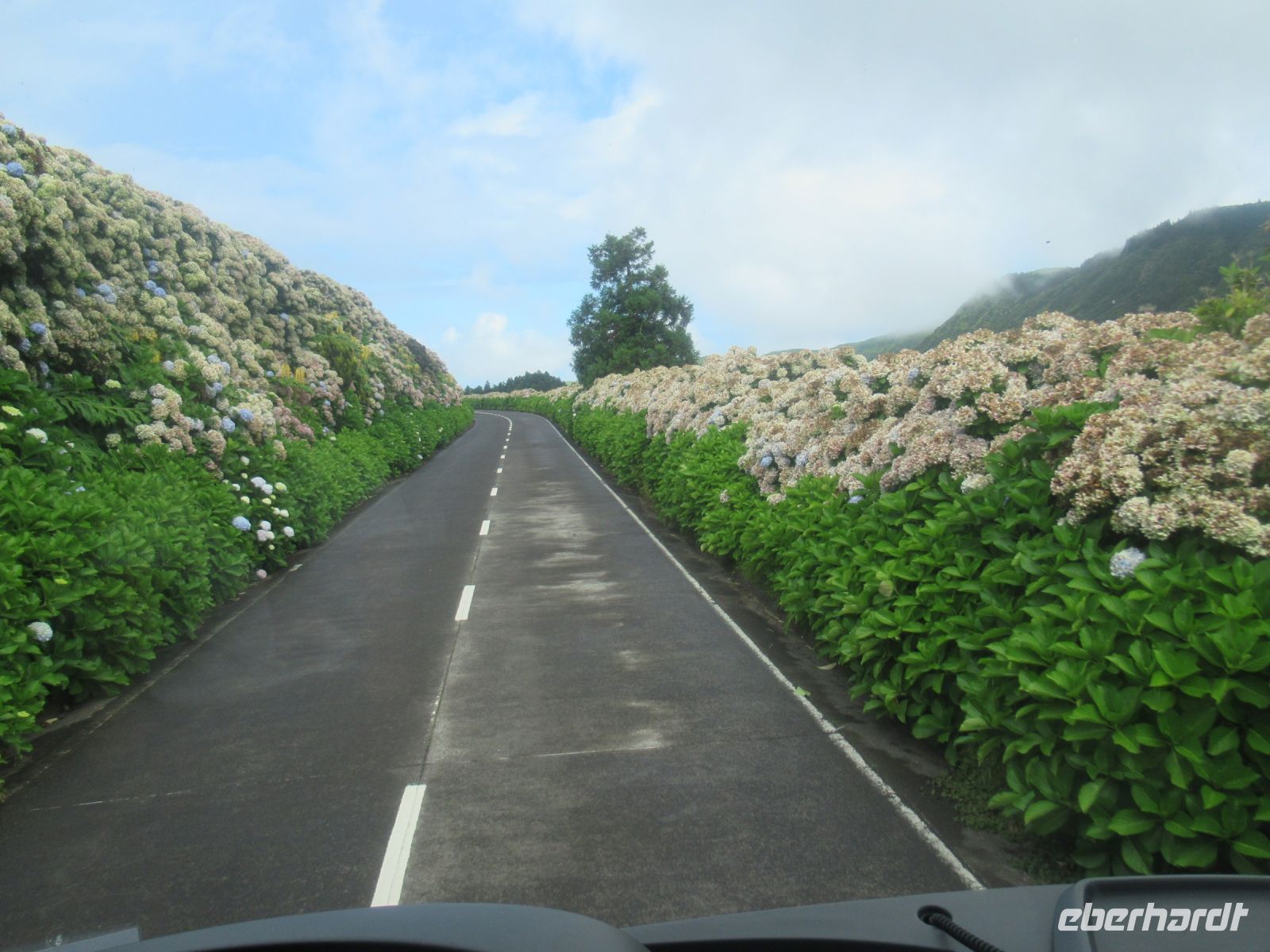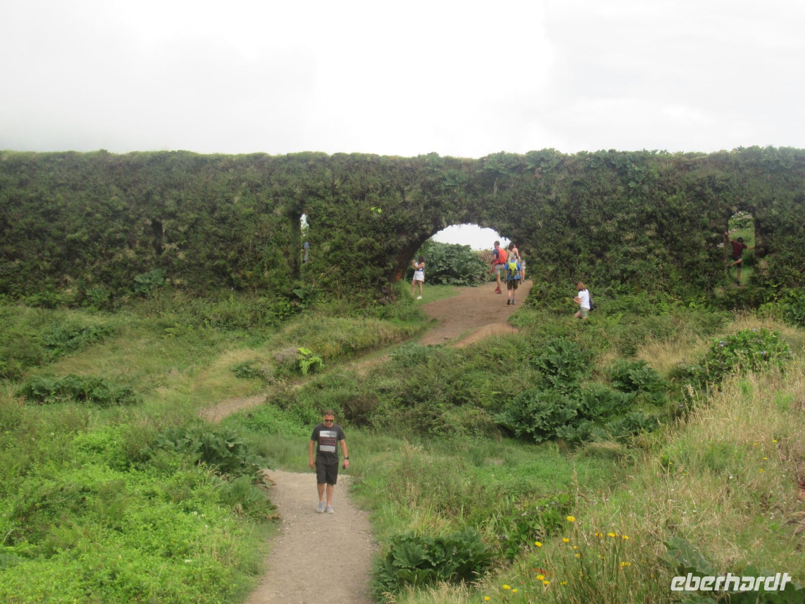 Der höchste Berg auf Faial ist der 1043 Meter hohe Cabeço Gordo, der sich im Zentrum der Insel befindet und ist ein Teil des Vulkankraters Caldeira do Faial. Da fahren wir jetzt hin – über einen kleinen Steintunnel oder über die Treppen erreichen wir die gigantische Aussicht auf den Caldeira do Faial. Wir stehen vor einem riesigen grünen Kessel mit Durchmesser von ca. 2 km und Kratertiefe von ca. 400 Meter. Die Caldera entstand durch einen Vulkanausbruch, der vor etwa 400.000 Jahren stattfand. Mehrere kleinere Ausbrüche folgten in jüngeren Zeiten. Die Caldera ist komplett bewachsen und ist heute ein Naturschutzgebiet. Auf einem Wanderweg kann man die in ca. 2 Stunden umrunden. Hier kam eine Frage auf, ob man auch unten in der Caldera wandern kann. Es ist nur mit einem Guide möglich, wird streng reglementiert und laut Anjas Erfahrung auch recht beschwerlich, da der Boden auch nass und oft stachelig ist. Wir werfen Blick auf die andere Seite und sehen den Pico in Wolken – etwas mystisch. Hier in der Höhe blühen noch die weiß-blauen Hortensien – was für ein Panorama…