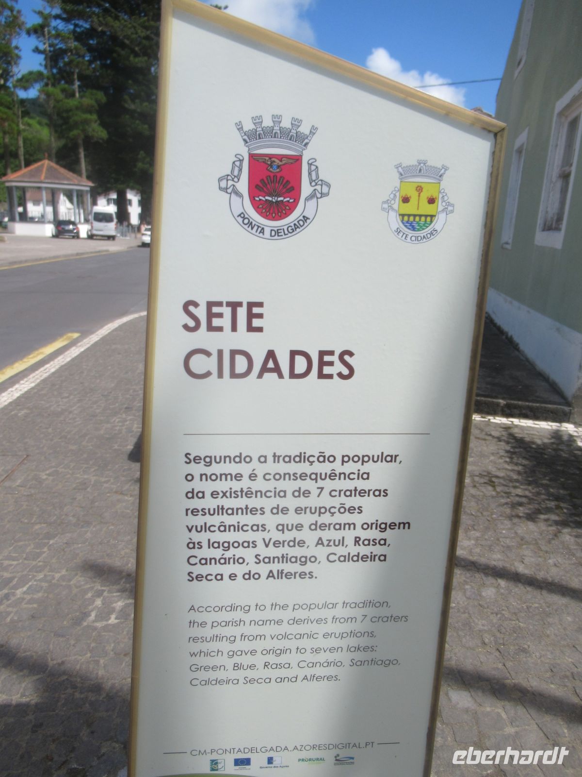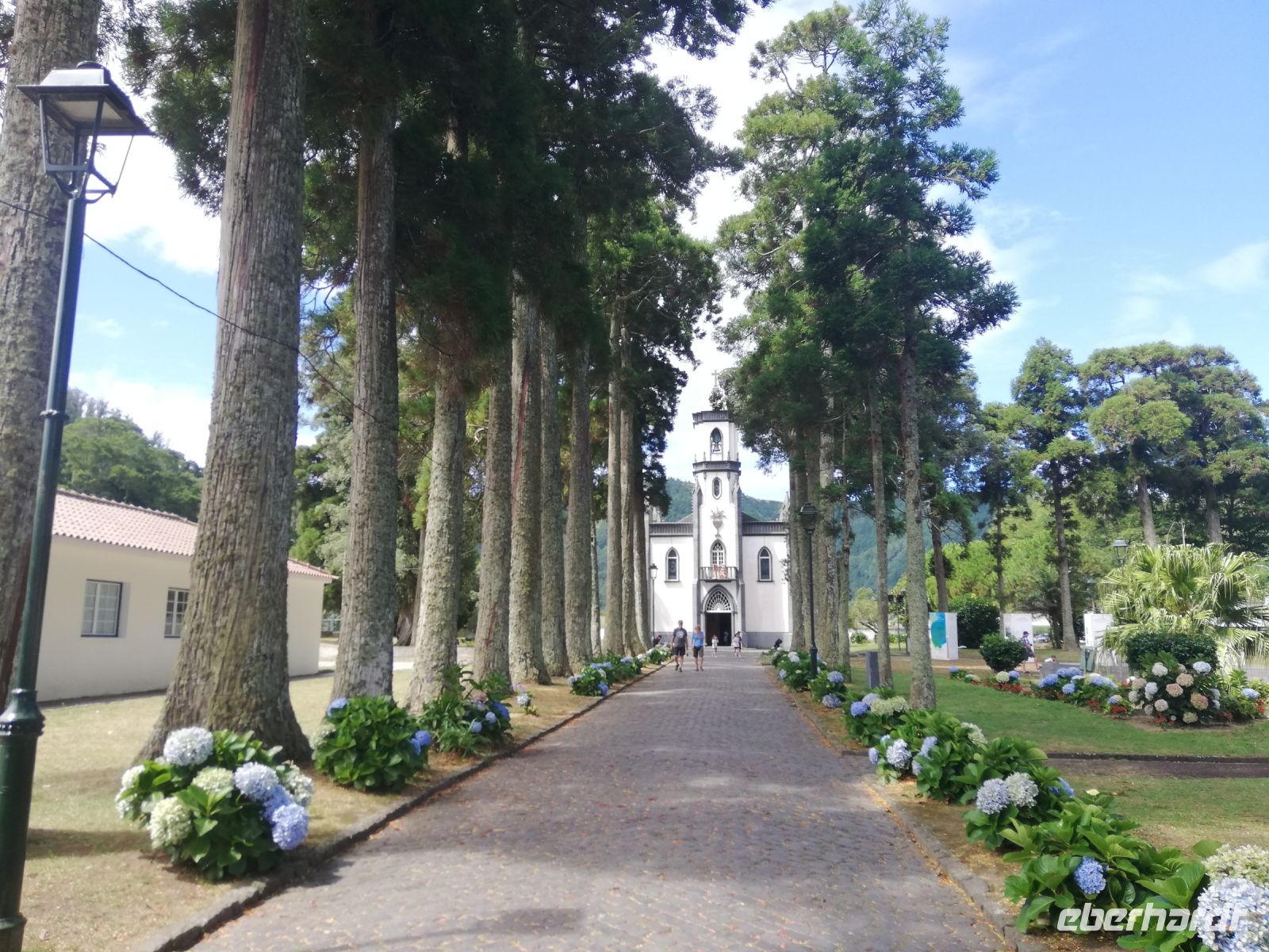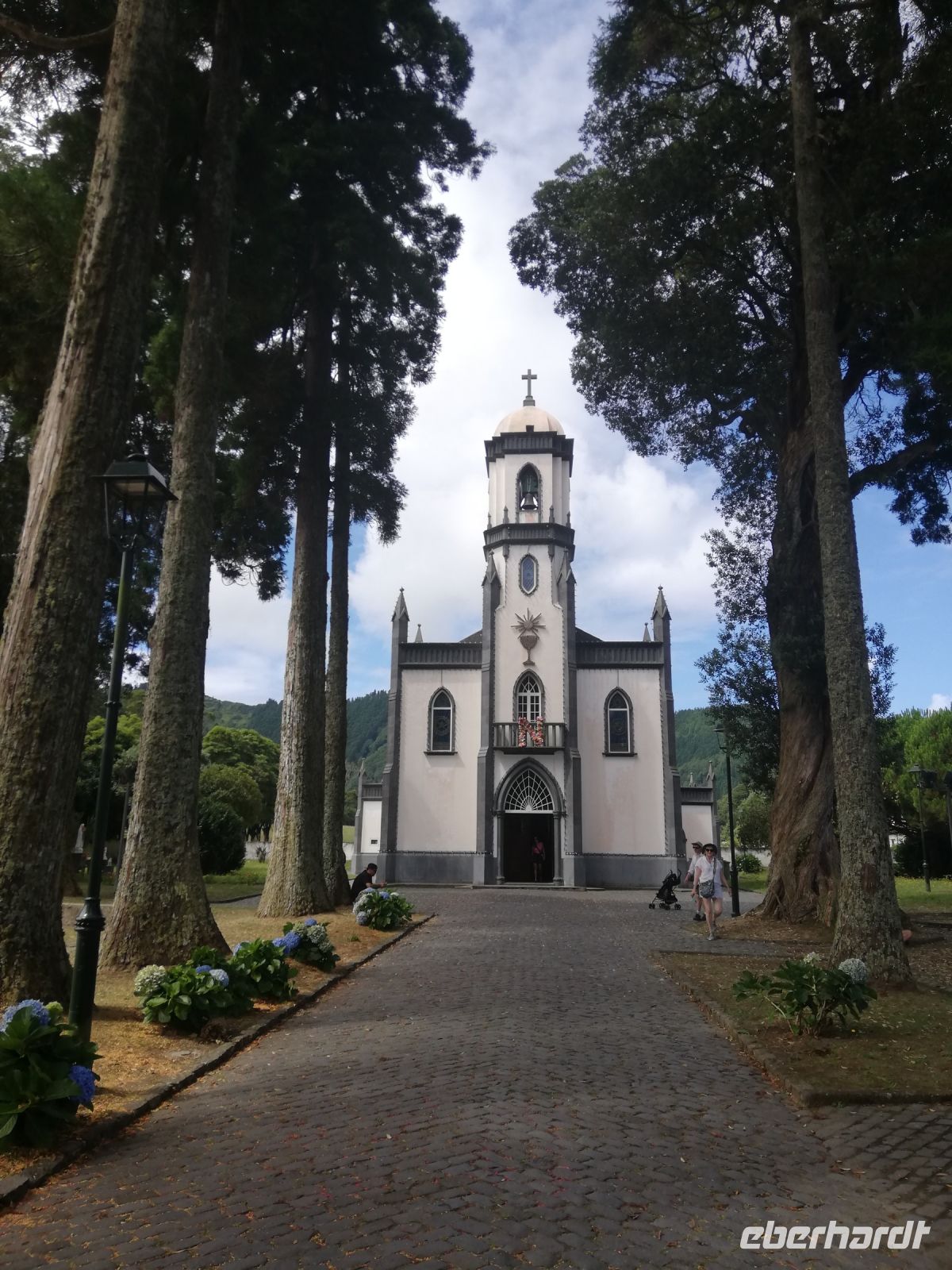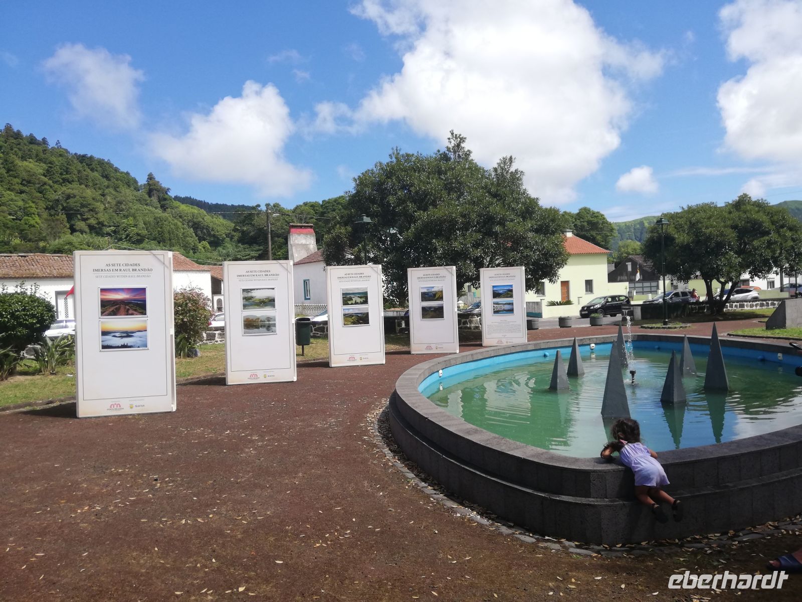 Jetzt fahren wir in das beschauliche Örtchen Sete Cidades – hier legen wir eine kleine Mittagspause ein, einige Gäste machen noch einen Spaziergang zu See, einige nehmen Snack in einem Ausflugslokal oder besichtigen die kleine Kirche in einem Park, wo gerade eine Künstlerausstellung der Bilder der Region stattfindet.