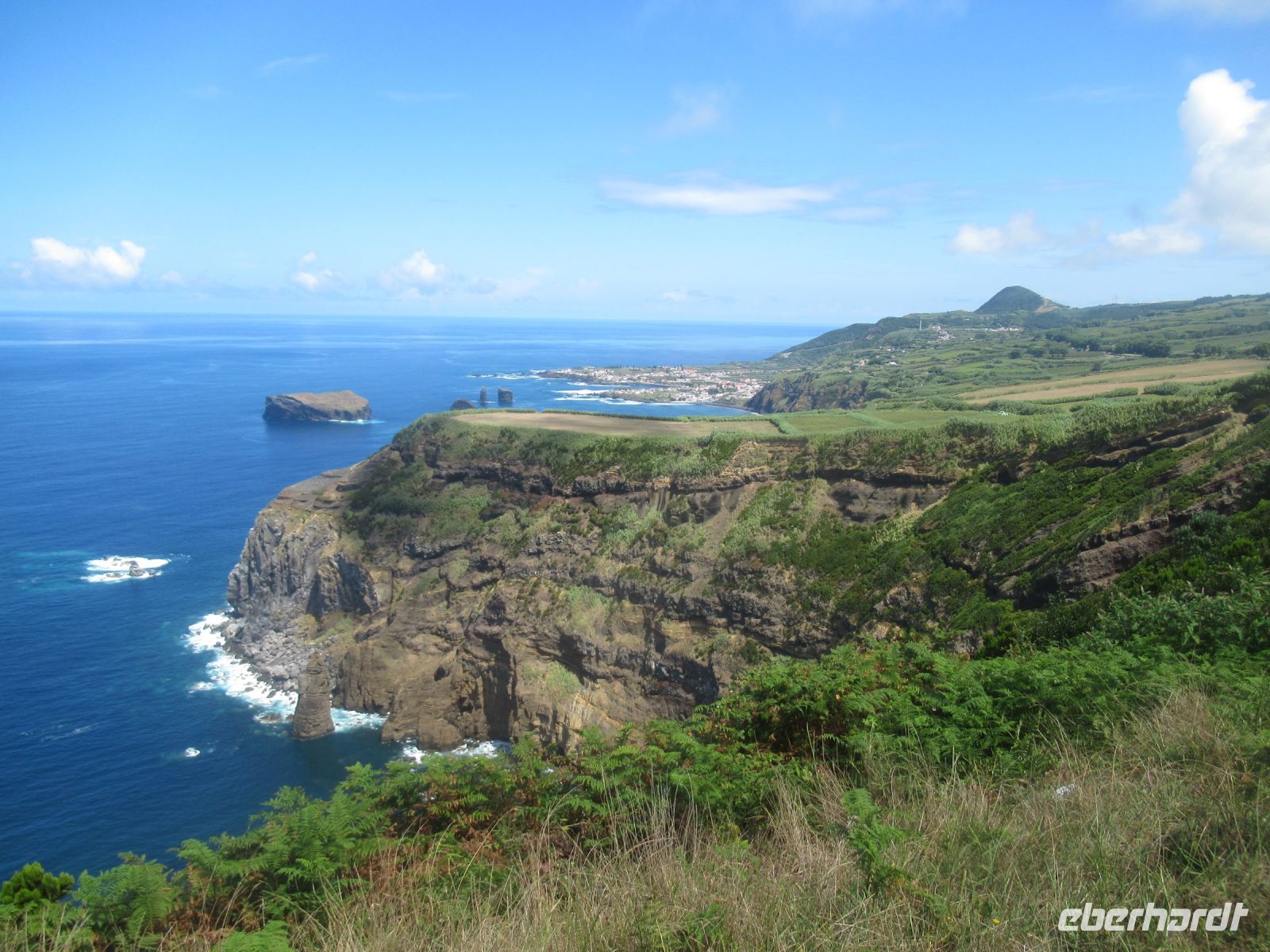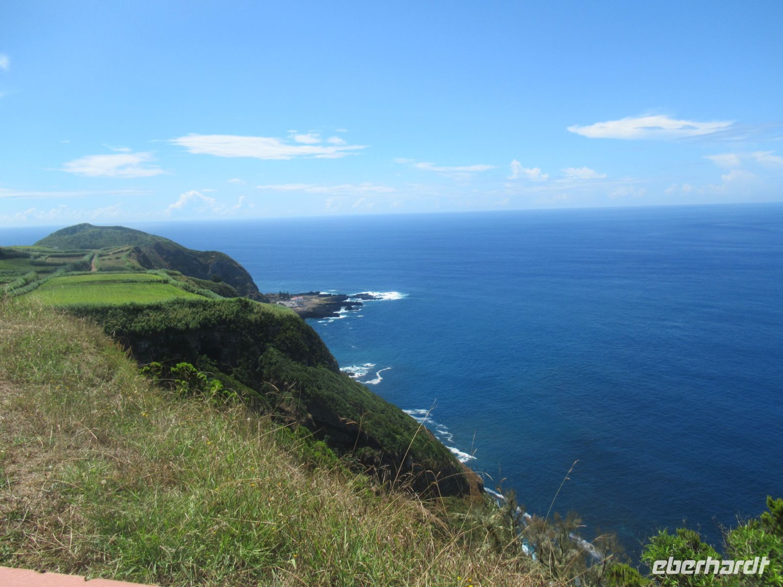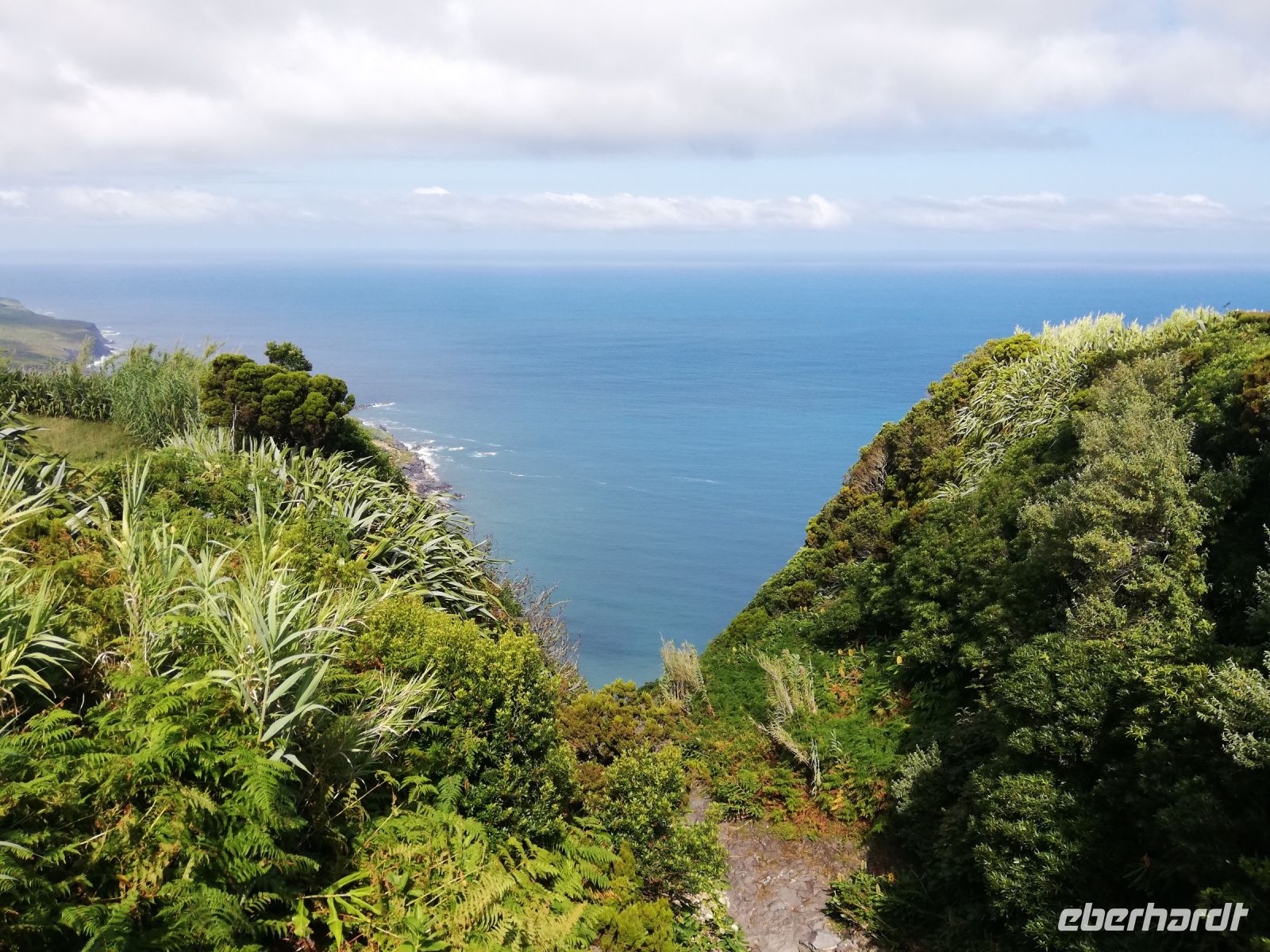 Wir fahren weiter durch kleinere Waldwege und machen einen Stopp – Anja erzählt uns über die Flora der Insel, vor allem die Japanische Sicheltanne –" Criptomeria" und die endemischen Pflanzen, wie Wachholder, Baumheide, Heidelbeeren und Lorbeerarten. Langsam kommen wir wieder an die Küste zum Aussichtspunkt „Miradouro da Ribeira das Cabras“, wo man die umliegende Berge und die zerklüftete Küste sehen kann.