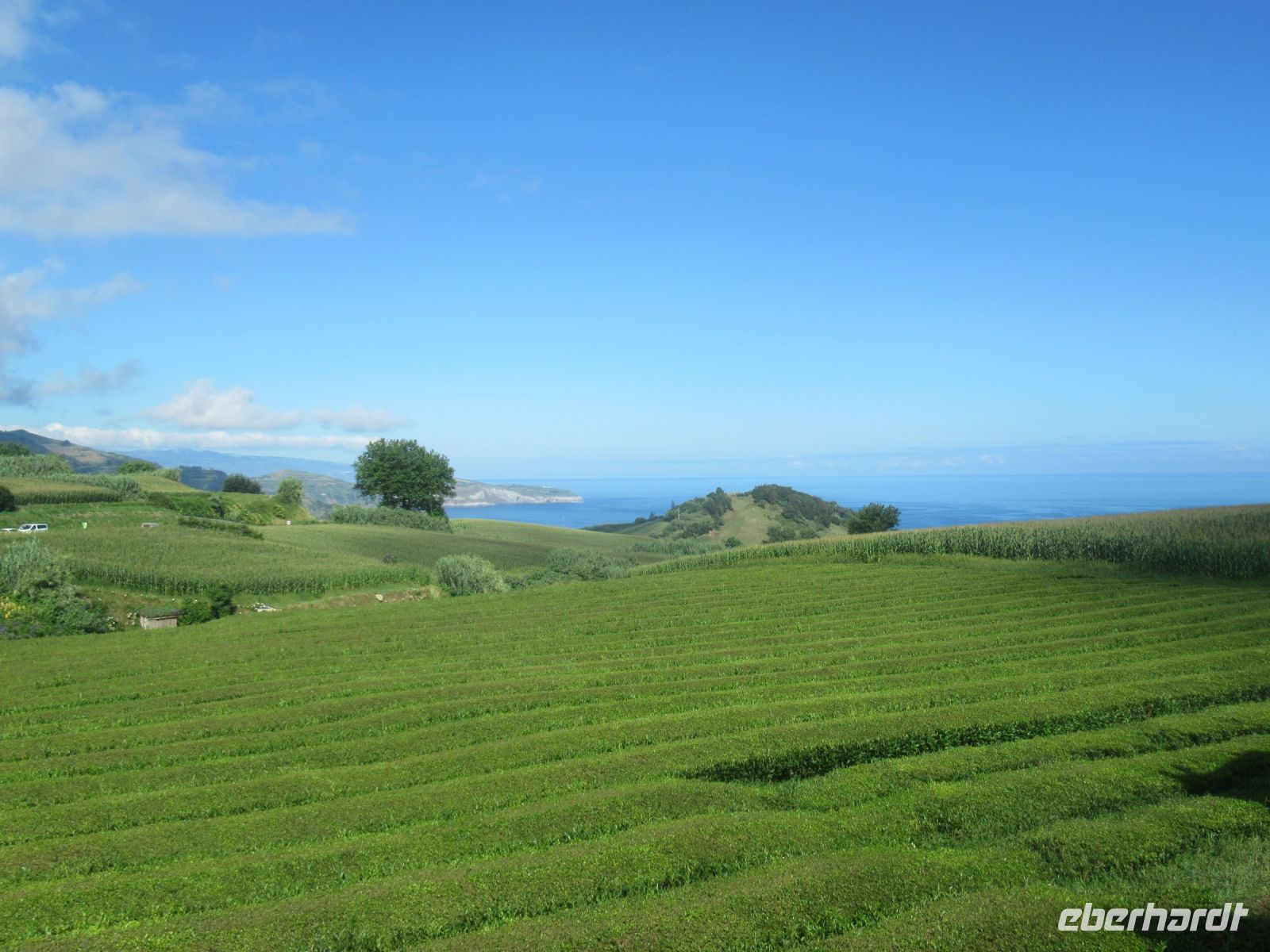 Bei Gorreana wird der Tee noch immer auf traditionelle Weise angebaut, geerntet und verarbeitet. Die Teeblätter werden von Hand gepflückt und in der Fabrik verarbeitet, die ebenfalls auf dem Gelände der Plantage liegt. Alte ursprüngliche Maschinen zur Verarbeitung werden hier noch eingesetzt - lebendige Produktion mit fast Museums-Charakter. Nach der Besichtigung dürfen wir noch den Tee probieren, oder auch schön verpackt kaufen. An Ende der Führung stehen wir vor den weitläufigen Teefeldern begrenzt von der Meeresküste.