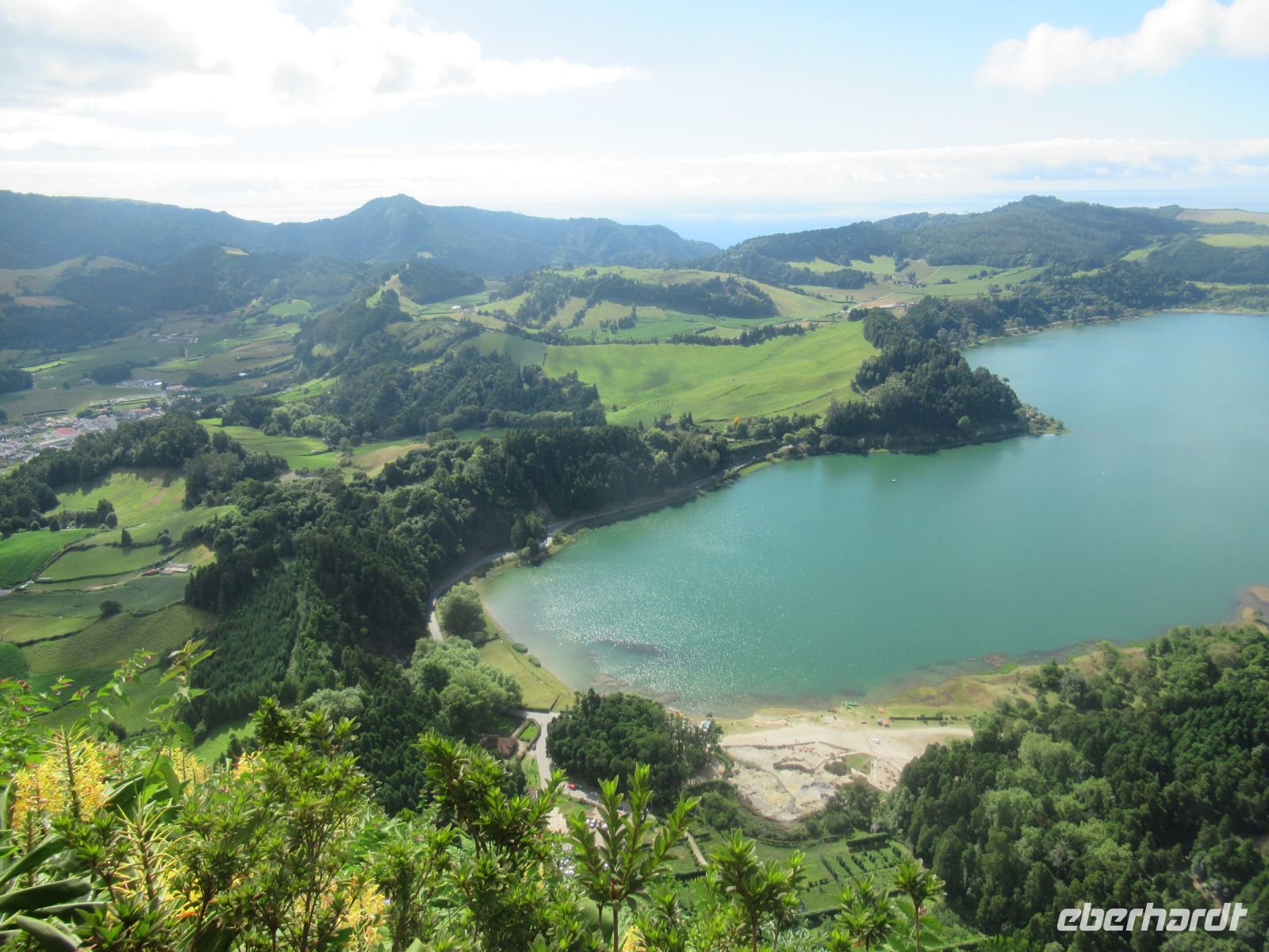Wir steigen wieder im Bus und unser nächster Stopp ist Furnas. Hier auf der Anhöhe können wir den Furnas See von oben betrachten. Eine Bilderbuchansicht öffnet sich vor uns bei einem sonnigen Wetter mit klarer Sicht.