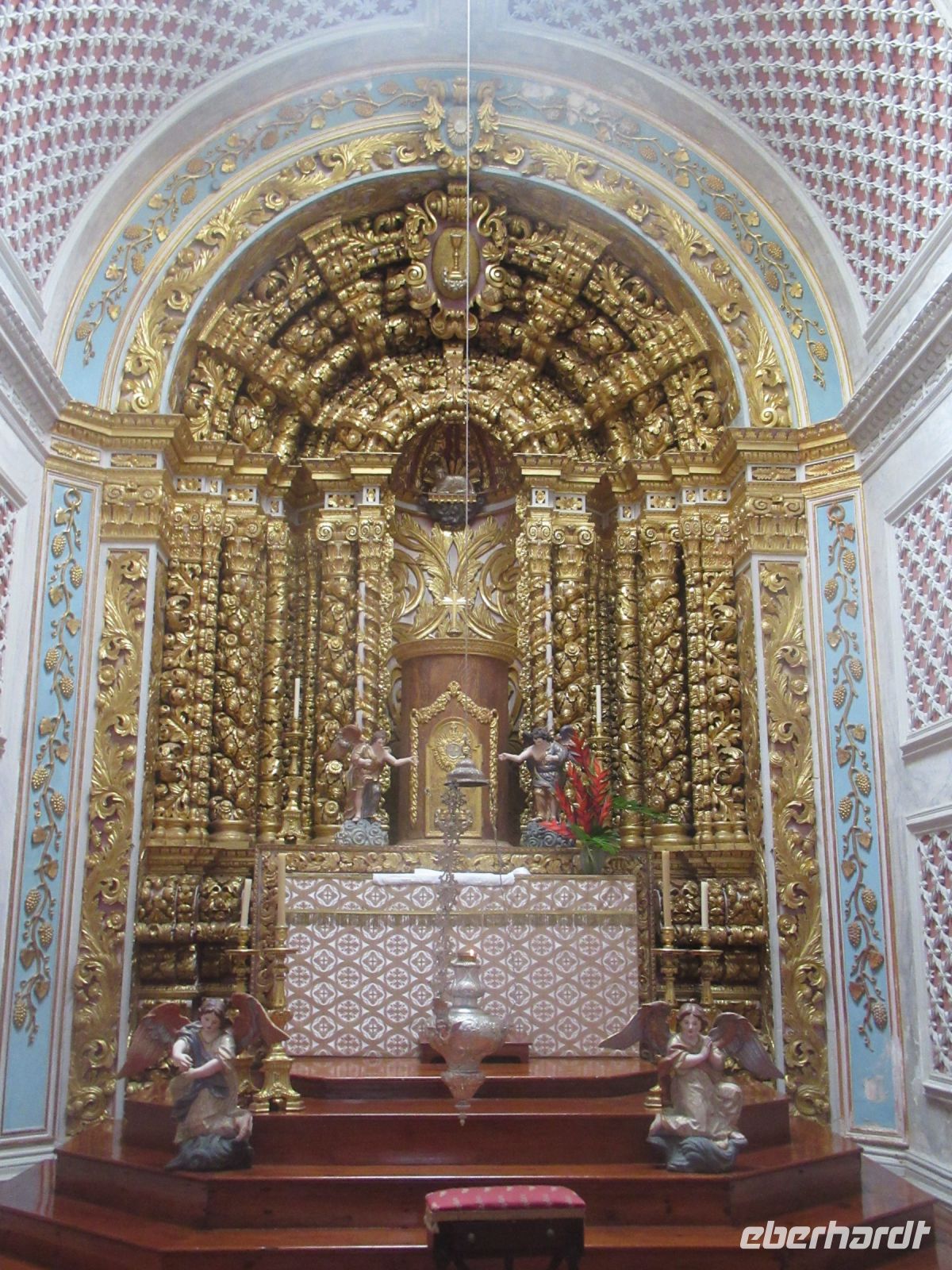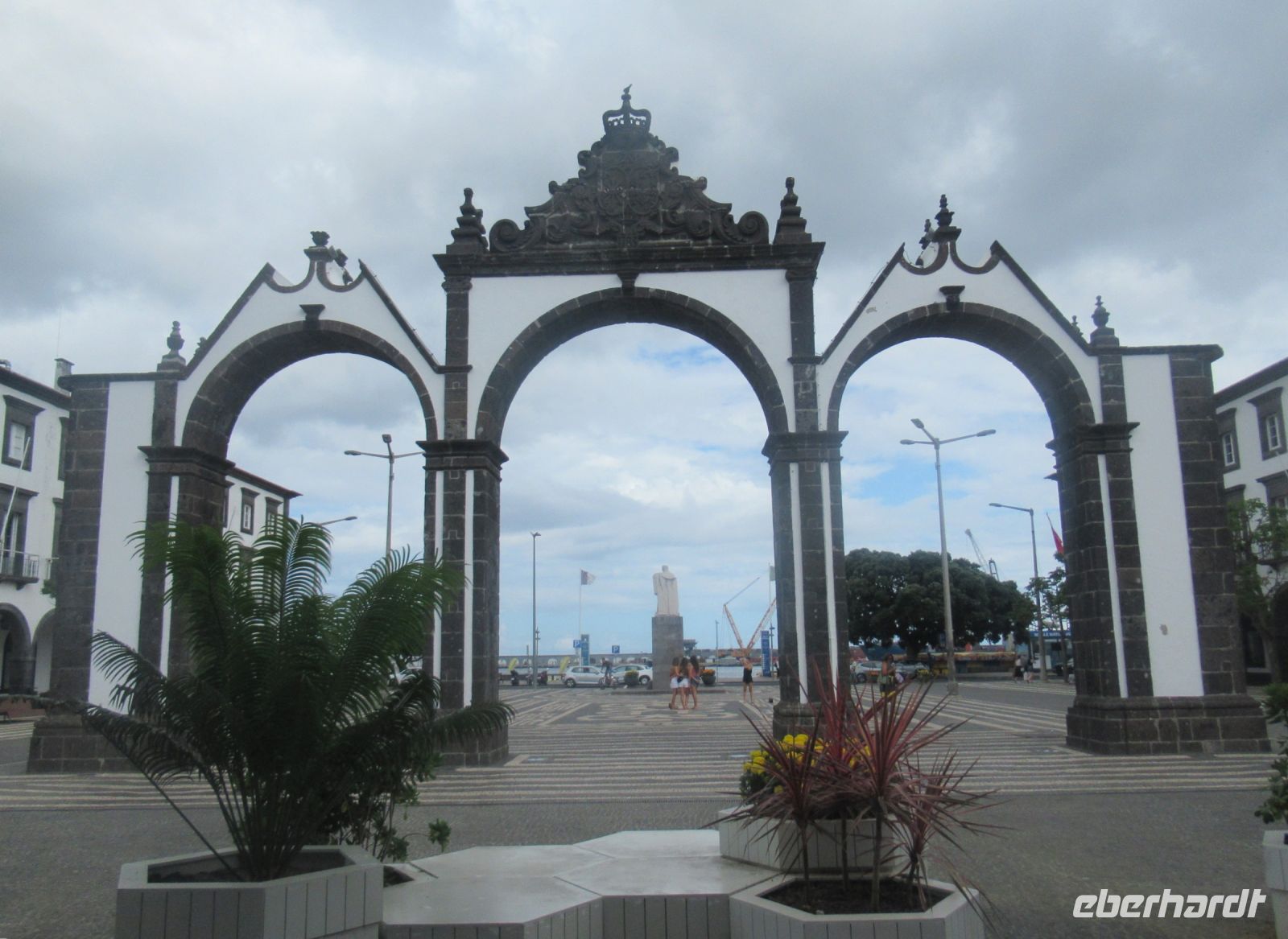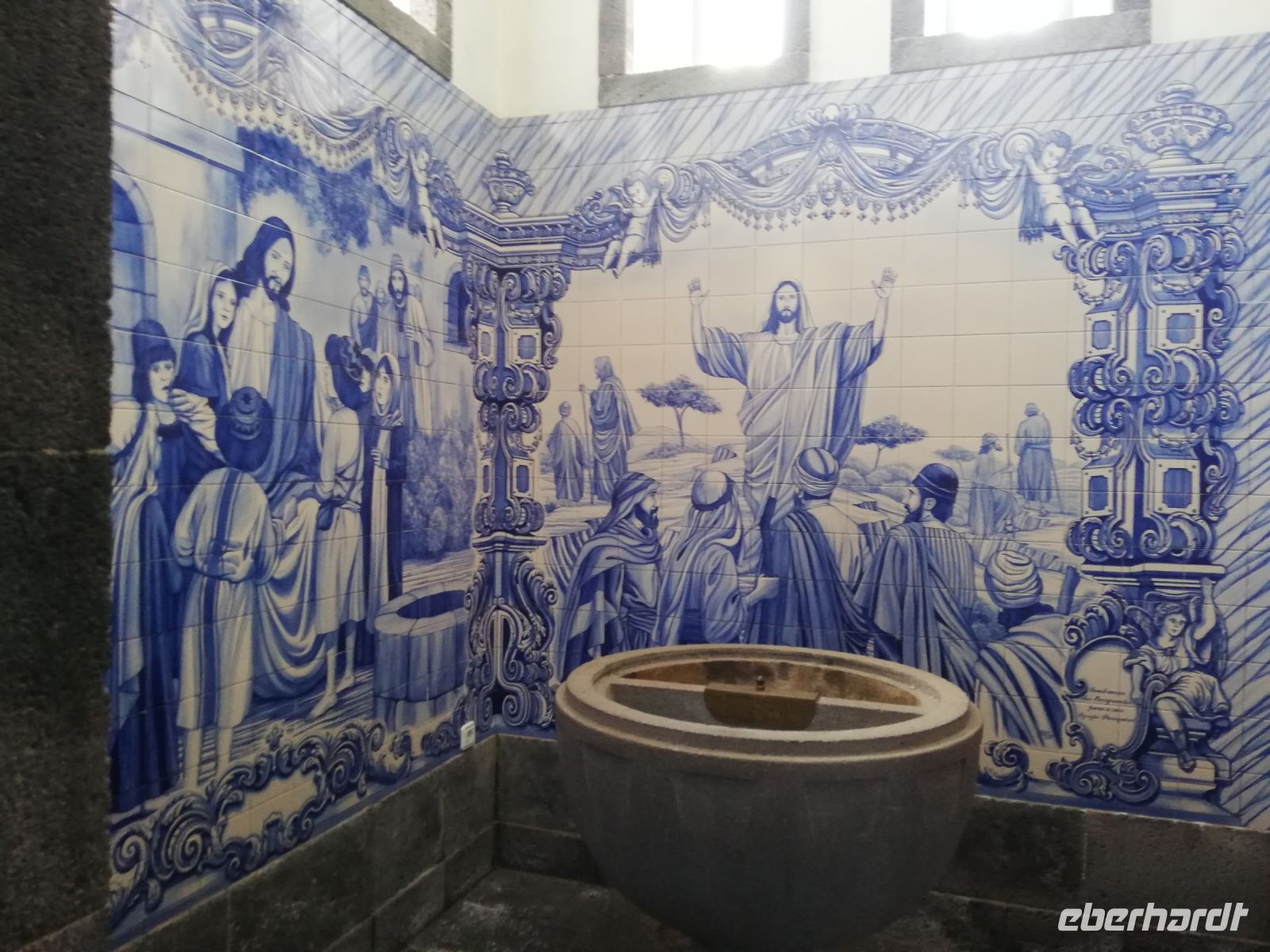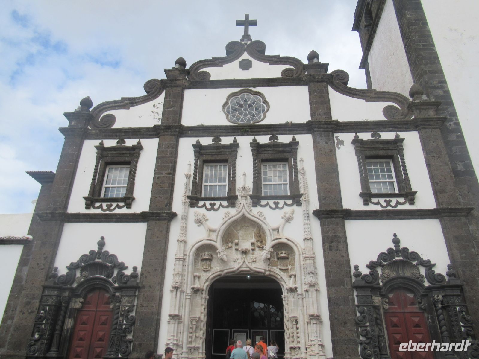 Ponta Delgada wurde im 15. Jahrhundert gegründet und entwickelte sich im Laufe der Jahrhunderte zu einem wichtigen Handels- und Verwaltungszentrum der Azoren. Christina erzählt uns noch die über die Entwicklung des Hafens und Historie der Stadt, die stark von Seefahrt und Religion geprägt wurde. Wir machen Stationen an Portas da Cidade, dem Stadttor, Forte de São Brás – der Festung aus 16. Jh. die ebenfalls von den Piratenangriffen schützen sollte. Von den zahlreichen Kirchen der Stadt besichtigen wir die Kirche - "Santuário do Senhor Santo Cristo dos Milagres". Diese Kirche ist das Zentrum des wichtigsten religiösen Festes der Azoren, dem Fest des Herrn Santo Cristo der Wunder. Die Kirche und das angrenzende Kloster beherbergen das berühmte Bildnis des Santo Cristo. Die Kirche ist im Barockstil gehalten und das Innere ist reich verziert, besonders der Altar, der das berühmte Bildnis enthält.