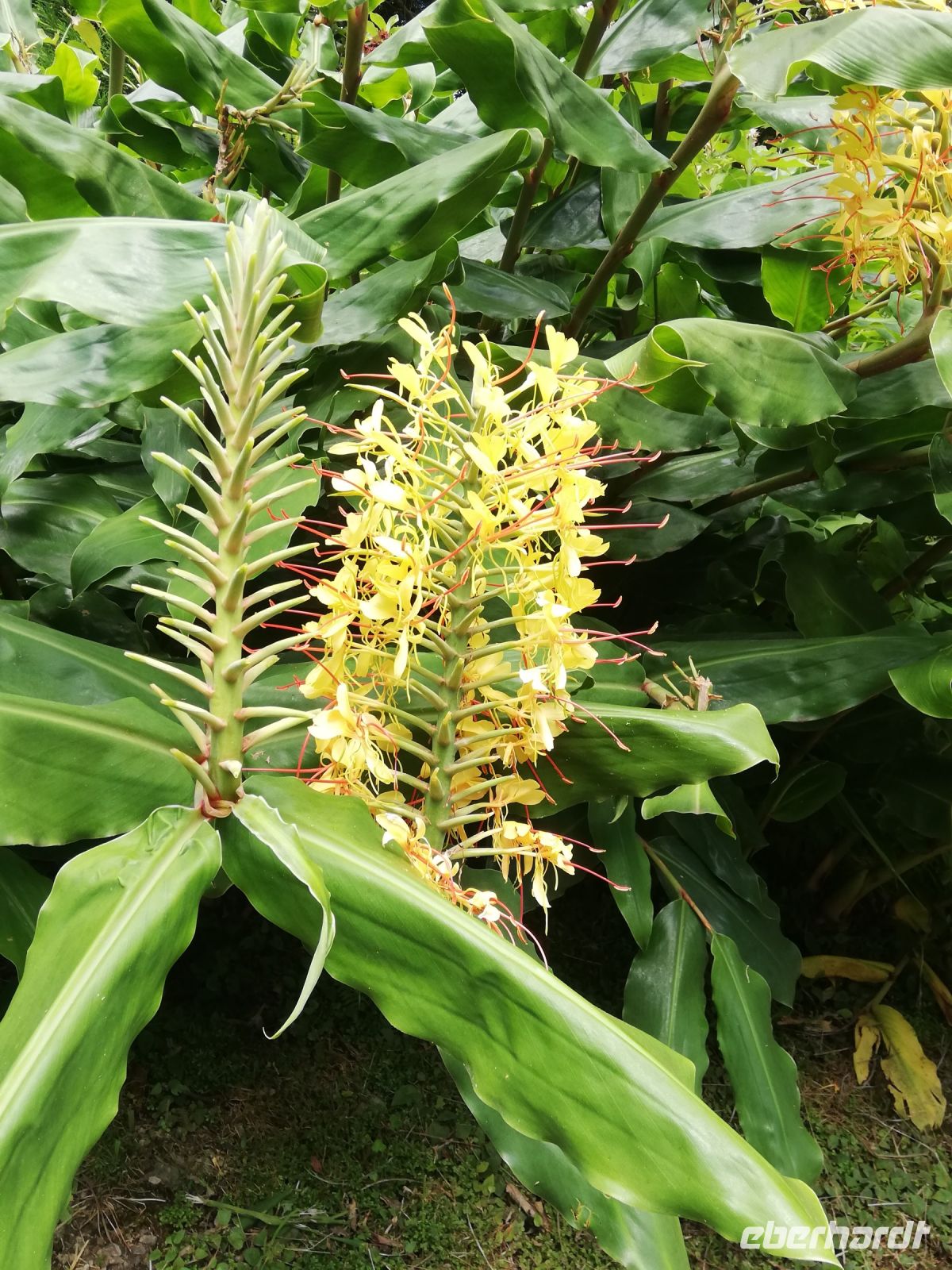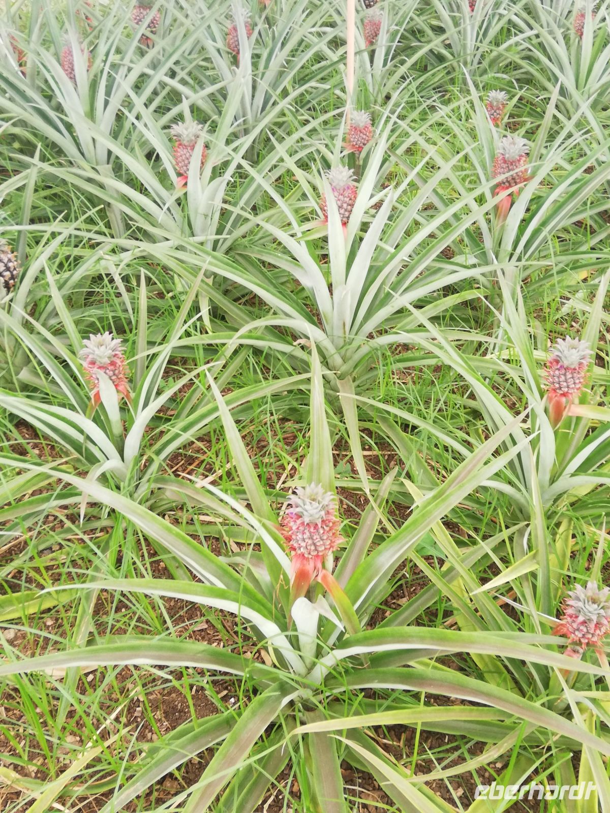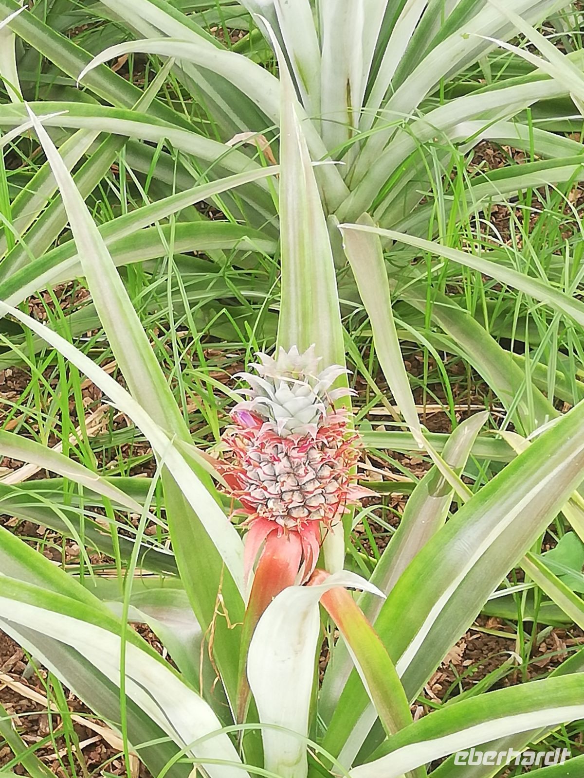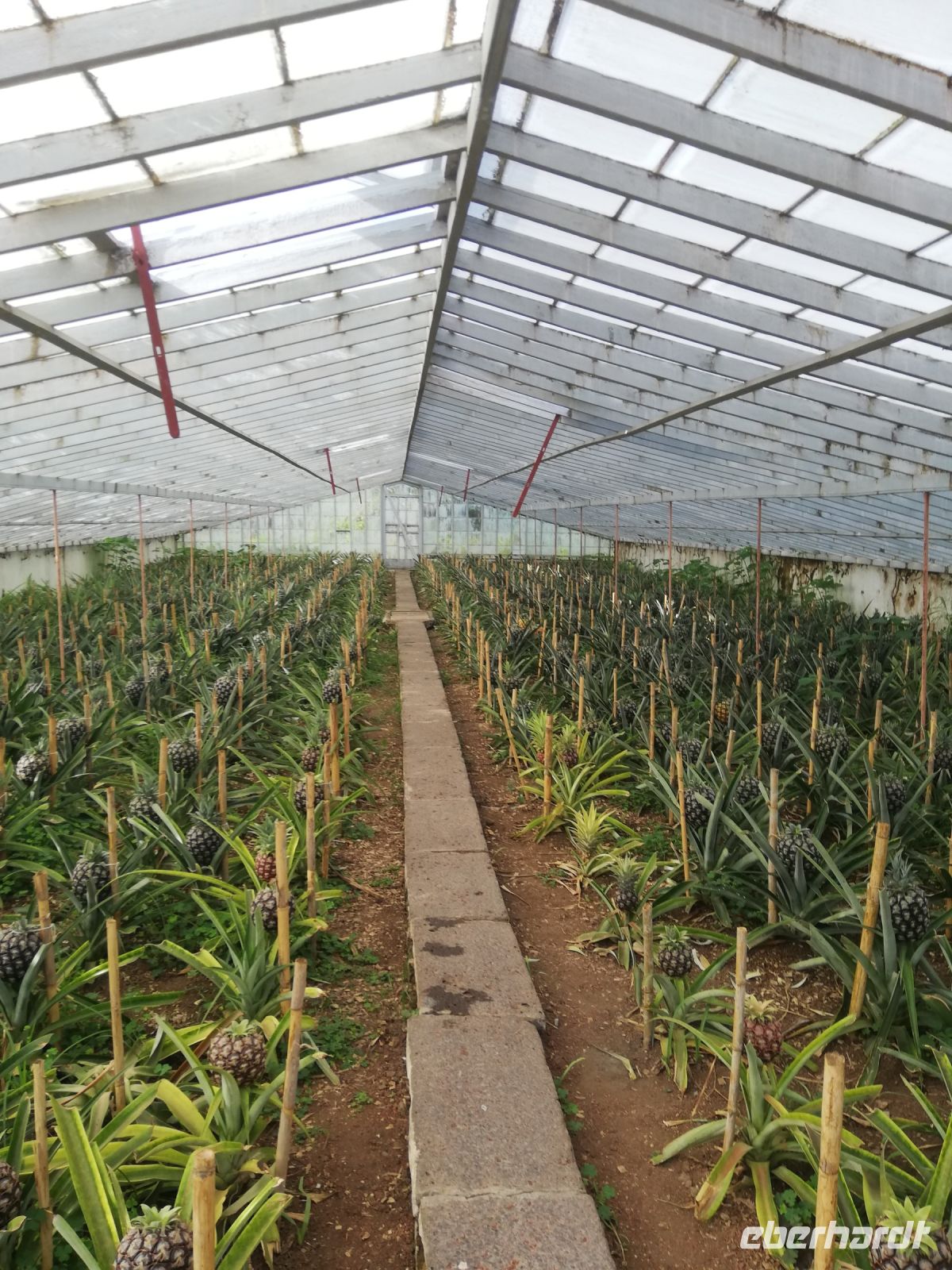 In ein paar Minuten sind wir da und stehen erstmal unter einem Baum im Schatten und lauschen Christina, die uns über den Anbau der Ananas auf den Azoren erzählt. Auch die Ananas wurde auf die Azoren importiert und da sie recht konstante Bedingungen braucht, wird sie hier in den Gewächshäusern angebaut. Um sie vor der Sonne zu schützen, wird die Verglasung mit weißer Kalkfarbe angestrichen. Es wird hier die kleine gelbe Ananas Sorte angebaut. Um den Wachstumsprozess der Ananas zu beschleunigen, der sonst bis 24 Monate dauert, wird ein Spezialverfahren der Beräucherung mit Weihrauch eingesetzt. In jedem der Gewächshäuser können wir die Ananaspflanze in verschiedenen Wachstumsphasen sehen, bis zu einer reifen Ananas.