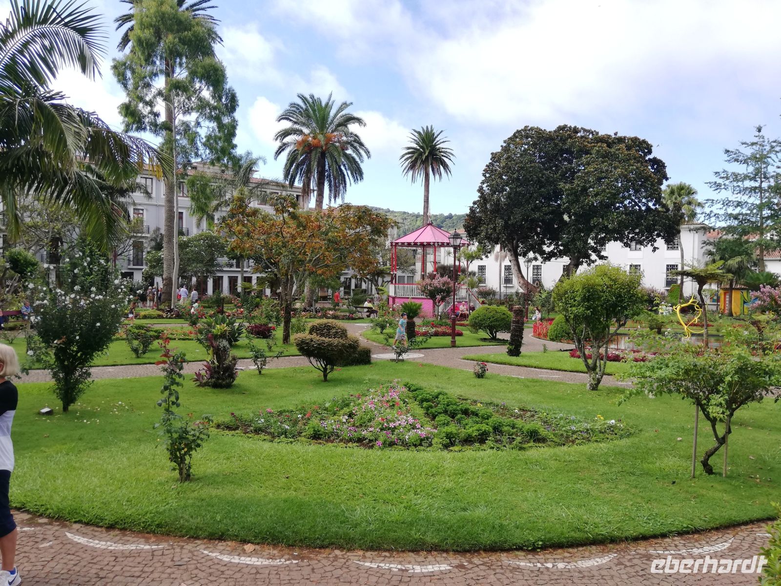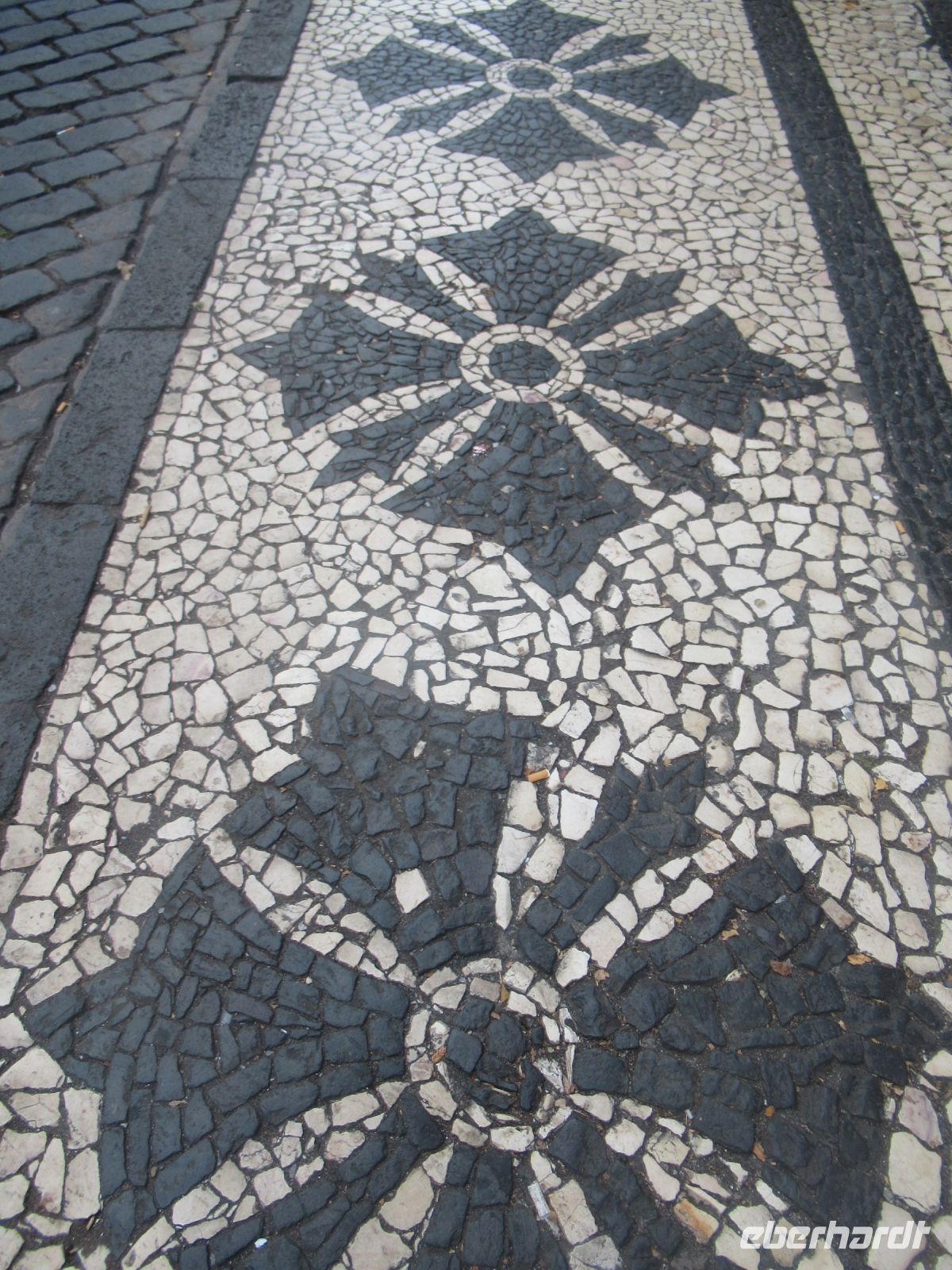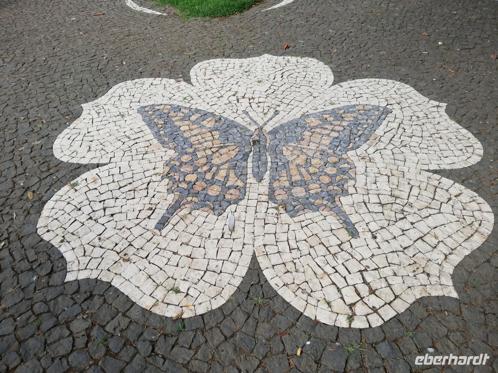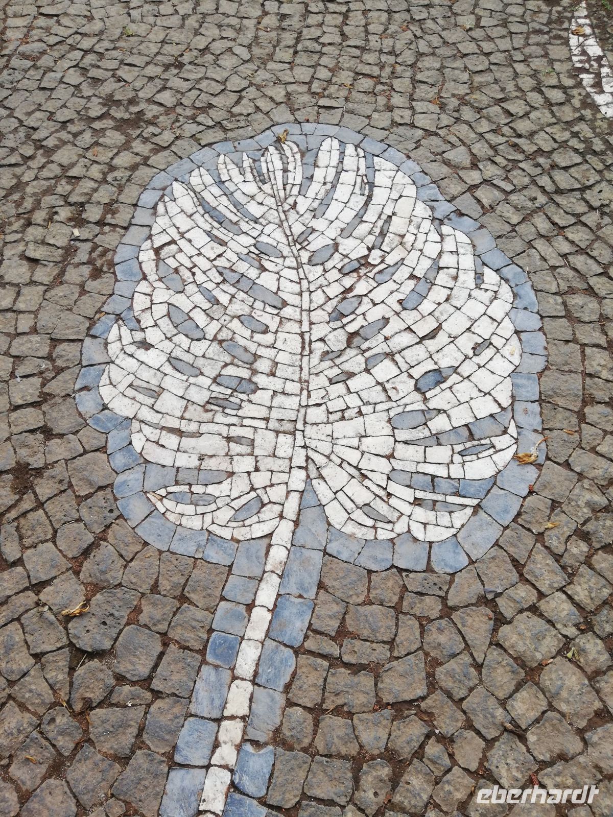 Wir gehen weiter und spazieren in einem sehr schönen Stadtpark hinein, der fast wie ein kleiner botanischer Garten gestaltet ist. Sehr schön sind die mit schwarz-weißen Pflastersteinen aus Basalt und Kalkstein gestalteten Fußwege. Die Motive sind Blumen, Schmetterlinge, Figuren oder geometrische Muster. Da steckt viel Kreativität und Fleißarbeit dahinter – hält aber ewig und ist wunderschön.