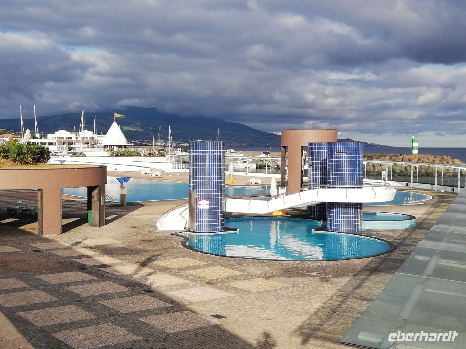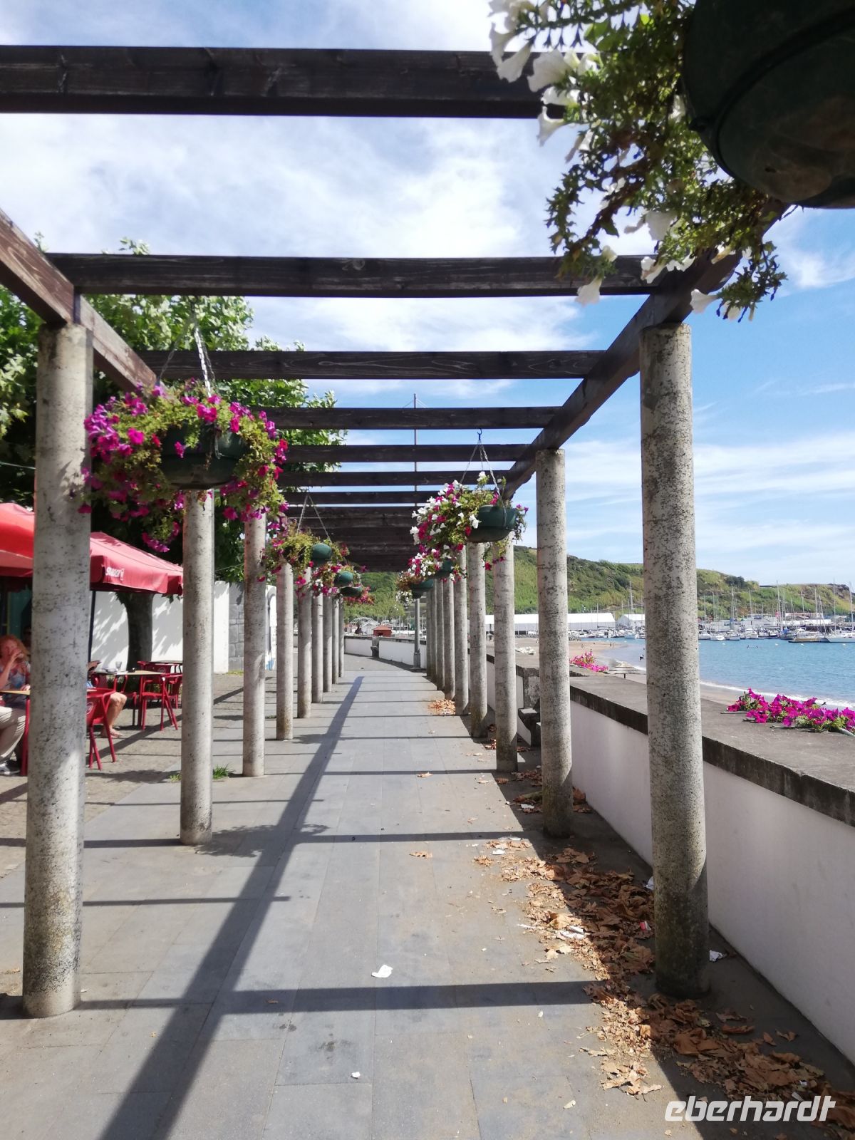 Anja begrüßt uns alle und stellt den heutigen Tag vor. Wir fahren runter in das Städtchen Horta an einem Parlamentsgebäude vorbei. Hier erklärt Anja, dass jeweilige Stellen der Autonomiebehörden der Azoren auch auf andere Insel verteilt sind und nicht nur in Ponta Delgada konzentriert. Wir fahren über die neugestaltete Promenade – „Avenida des 25. April“ – die mit wunderschönen schwarzweisen Pflastersteinen in unterschiedlichen Mustern gestaltet ist.