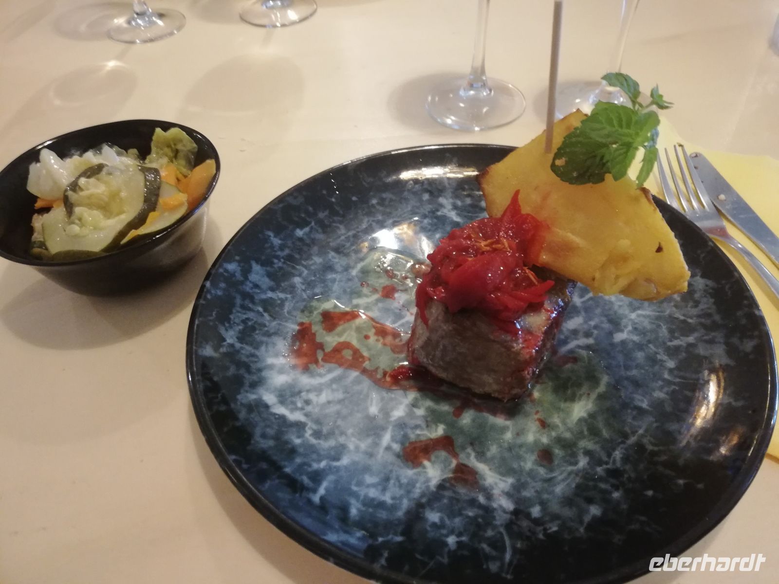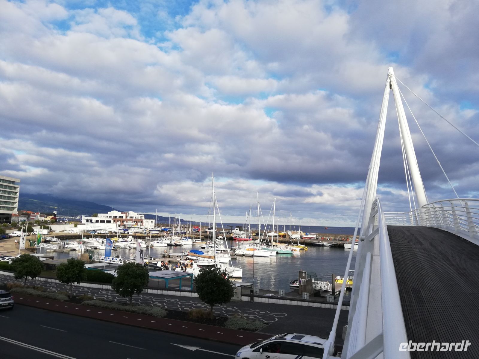 Nun geht es wieder zurück nach Ponta Delgada in unser Hotel. Etwas ausruhen und abkühlen, danach treffen wir uns Alle und gehen gemeinsam zu unserem Willkommensabendessen ins Restaurant „Momentos“ auf der Marina. Im etwas gekühlten Innenraum ist für uns eine große Tafel vorbereitet und ein Menü – den Hauptgang konnten die Gäste wählen zwischen Steak und Thunfisch auswählen, - beides war exzellent. Das Abendessen wird noch mit Dessert und Glas Wein oder Bier bei regem Austausch der Gäste langsam beendet… eine Abendstimmung am Hafen lädt noch zu einem kleinen Spazierhang ein.