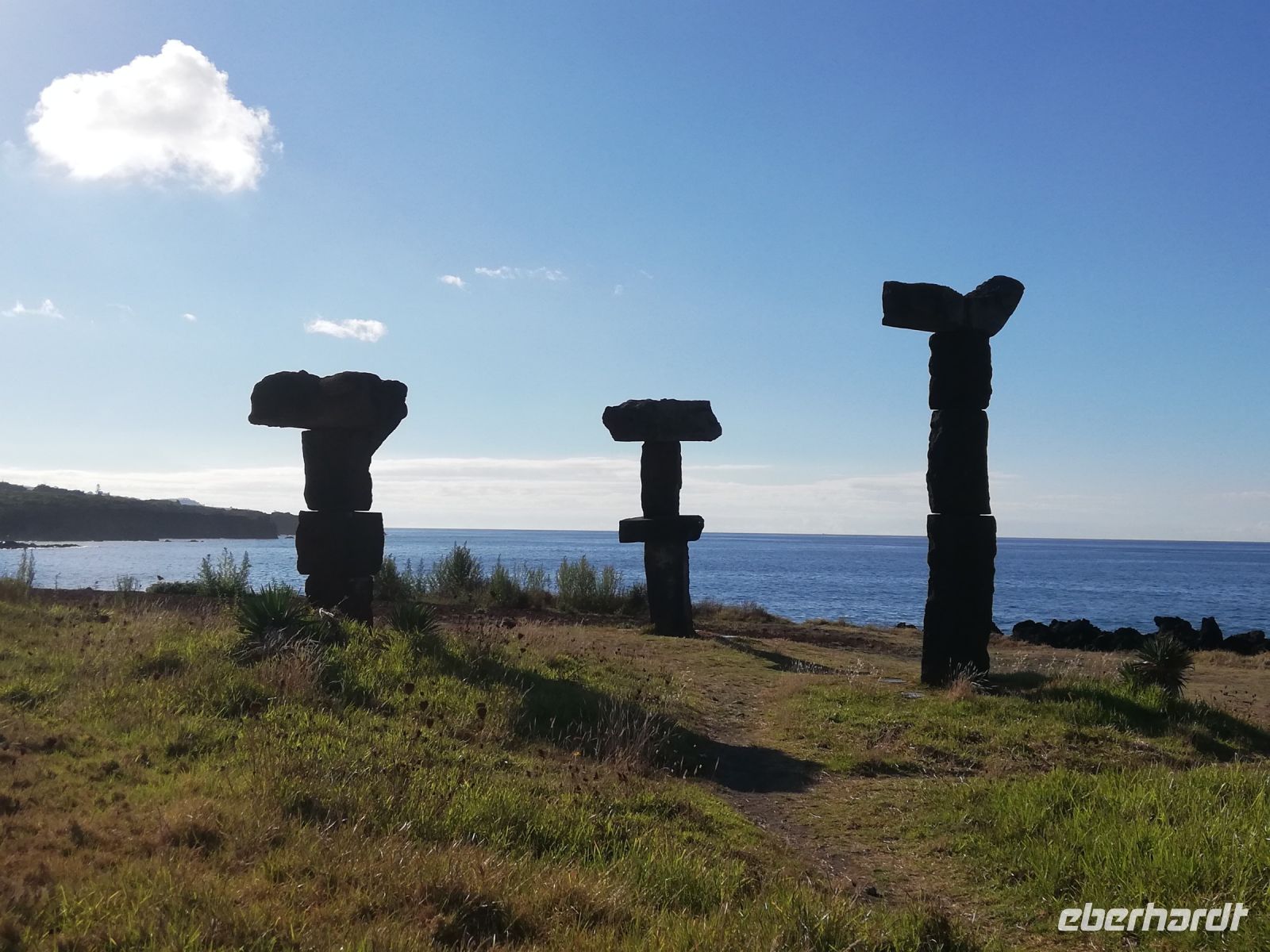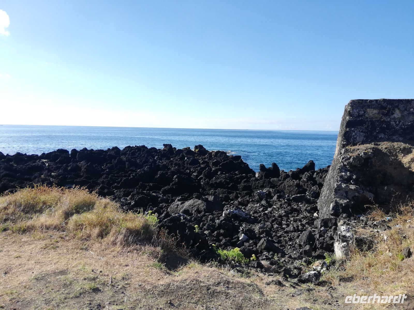 Wir starten Richtung Osten an der Südküste und unser erster Stopp ist Forte de São Caetano – Ruine einer Festung an der Praia das Milicias. Zuerst fallen uns die prägnanten drei Steinsäulen auf, die etwas an bekannten Stonehenge in Irland erinnern. Hier ist es allerdings kein historischer Fund, sondern ein Werk von einem Bildhauer Symposium, so die Information von Christina.