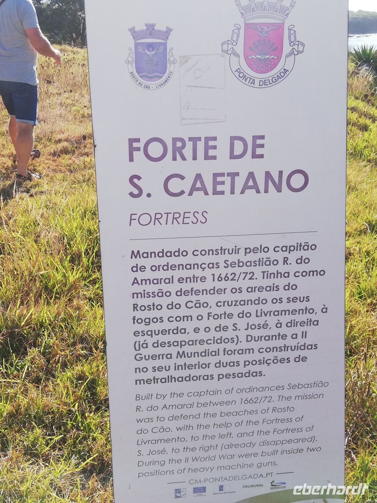 Von dem Forte de São Caetano sind nur noch einige Mauern übriggeblieben. Die ursprüngliche Festung wurde im 16. Jahrhundert zum Schutz der Insel vor Piratenangriffen und anderen Bedrohungen errichtet. Das Fort selbst war Teil eines größeren Netzwerks von Küstenverteidigungen auf São Miguel. Die alten Befestigungsanlagen sind im Laufe der Zeit verfallen, doch einige Elemente wie Säulen, Mauern oder Türme sind heute noch an einigen Stellen der Küsten der Azoren sichtbar.