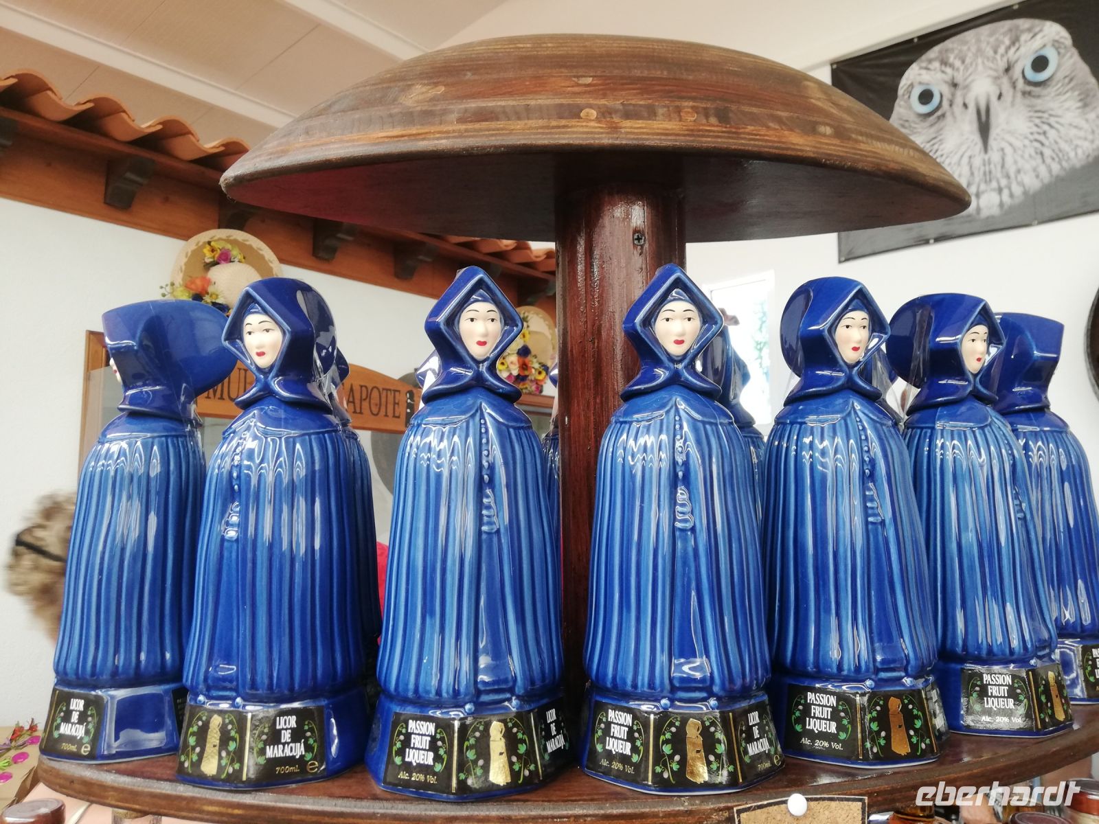 Jetzt geht unserer Weg Richtung Nordküste der Insel nach Ribeira Brava. Da wir noch genug Zeit haben, schlägt uns Christina vor, eine berühmte Likörfabrik zu besuchen, die auf dem Weg liegt. Das machen wir auch – „Mulher do Capote“ eine Traditionsbetrieb produziert seit über 75 Jahren einige der feinsten regionalen Liköre und kreiert die viele Geschmacksrichtungen von den exotischen Früchten der Insel. Der ungewöhnliche Name und die blauen Frauenstatuen – Markenzeichen der Liköre, gehen auf die Traditionsbekleidung der Frauen zurück – ein dicker blauer Filzmantel, der vor dem schlechten Wetter schützten sollte.